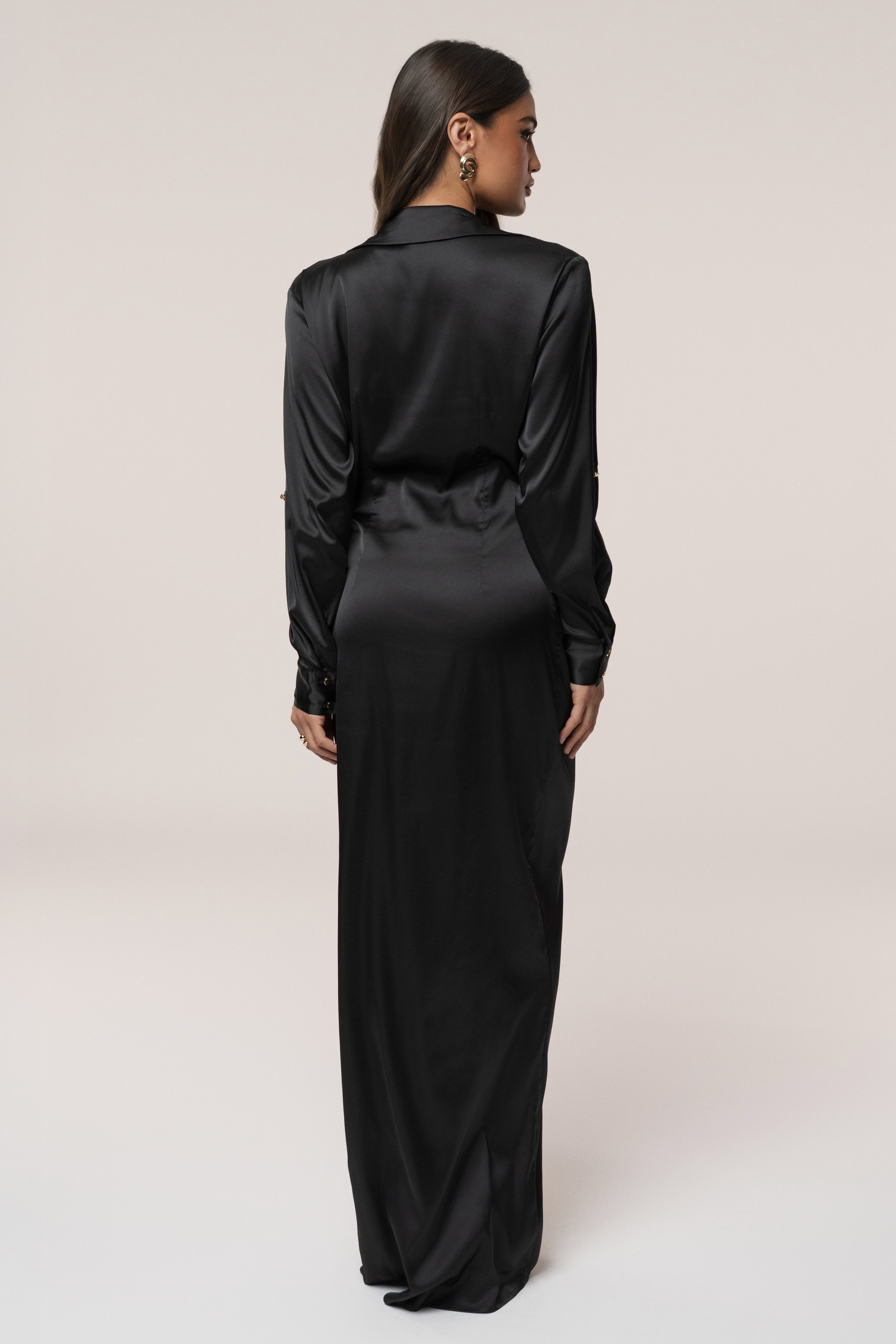 فستان ماكسي أسود مفتوح من الأمام من تصميمنا الخاص، وهو الفستان الذي كنت تنتظرينه! يتميز بفتحة رقبة عميقة جذابة وأكمام طويلة وتفاصيل عقدة أنيقة تتدلى إلى أسفل حتى فتحة جانبية مثيرة تنتهي بحاشية طويلة. مصمم من قماش ناعم يشبه الحرير لإضفاء لمسة من الأناقة. بدون تمدد.
