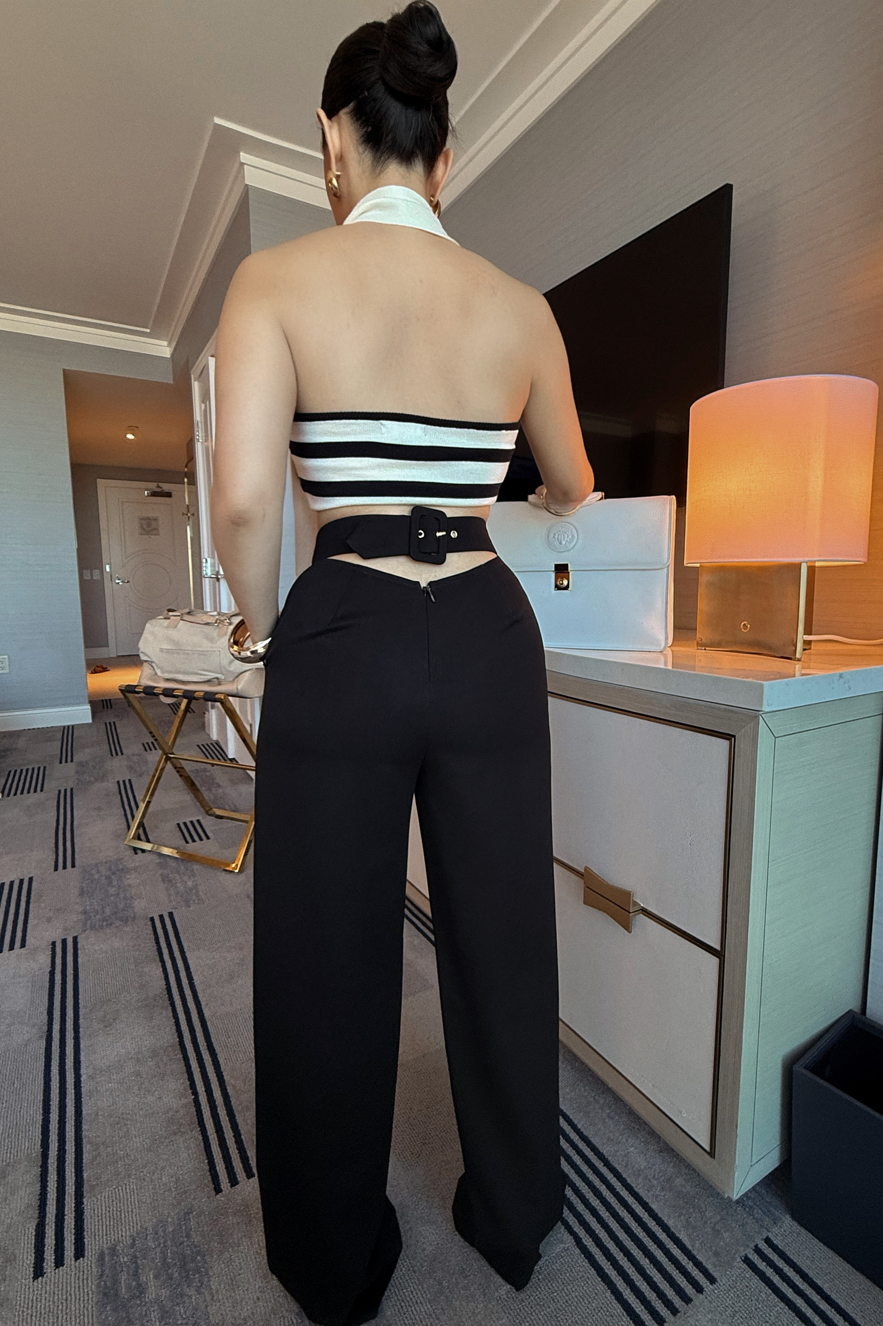 Our Black Status Belted Pants are the ultimate work-to-weekend essential. Designed with a sleek waistband and a cutout back with an elegant squared buckle belt, this style blends sophistication with modern edge. A hidden back zipper closure and functional side pockets offer practicality, while the straight-leg silhouette delivers a timeless, polished finish. Pair with our Shanti Faux Buckle Top for the full look. Single-lined. No stretch. Gold-tone hardware.