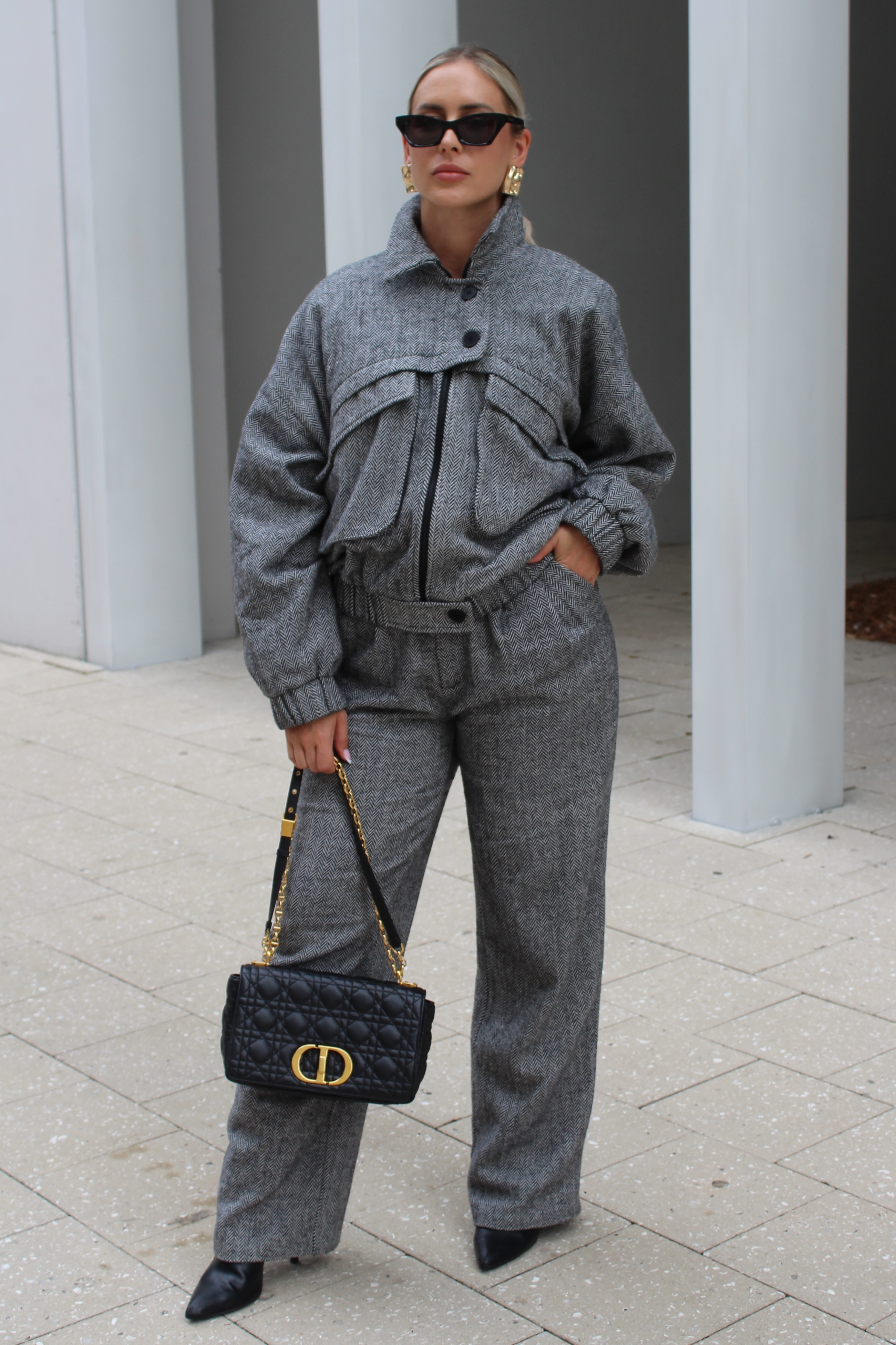 Stay stylish all season long with our Classic Herringbone Bomber Jacket. Crafted from luxurious herringbone fabric, this jacket showcases a collared neckline, drop shoulders, a center zipper closure with an extended buttoned flap panel, and functional side pockets. Complete with elastic cuffs and an elastic waist hem for a flexible fit. Pair with our Classic Herringbone Corset Top and Classic Herringbone Trousers for the full look. Double lined.