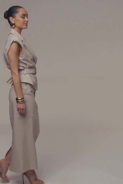 Our Beige In Focus Belted Vest is a sleek and sophisticated addition to any wardrobe. This sleeveless, double-breasted vest features a wide lapel collar and a matching fabric belt that cinches the waist for a touch of professional edge. Crafted from a smooth fabric, this piece comes with a decorative pocket and padded shoulders. Pair with our In Focus Skirt for the full look. No stretch. Not sold as set.