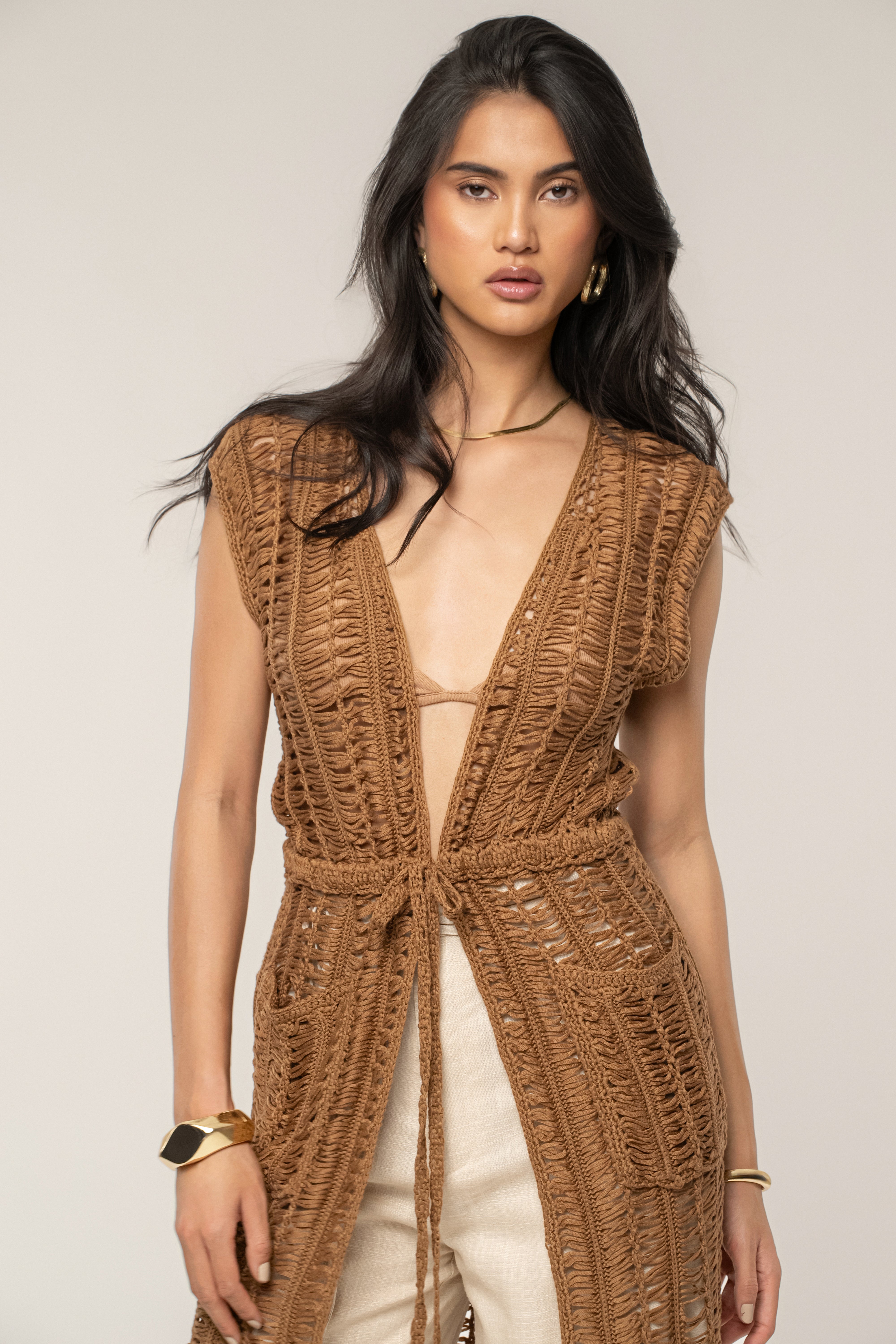 Immerse yourself in coastal textures with our Taupe Marcelle Crochet Maxi Dress. This open-front cardigan features a unique crochet inspired design made from lightweight knit fabric. A drawstring belt tied at the waist flatters your silhouette, while the two front pockets add both functionality and charm. Whether styled over casual dresses or paired with your favorite summer outfits. Stretchy.