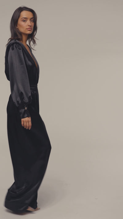 Our Black Satin Radiance Bodysuit was designed to make impressions at every festive gathering. Designed in a rich satin fabric, this bodysuit features a plunging V-neckline, puffy long-sleeves with button-cuffs, and structured/padded shoulders for a voluminous silhouette. The fitted bottom is secured with a thong-style double snap closure. Perfect for your next event, this bodysuit combines luxurious texture with timeless design. Minimal stretch. Not sold as set.