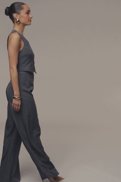 Our new Grey Relaxed Pinstripe Pant Set is perfect for work or casual outings. Featuring a classic vest design with v-neckline and button details, paired with matching wide-leg trousers. The pinstripe pattern adds a timeless touch, while a front zipper closure and side pockets ensure practicality. Whether styled together or as separates, this versatile set is a must-have addition to any wardrobe. Vest is double-lined. Sold as set.