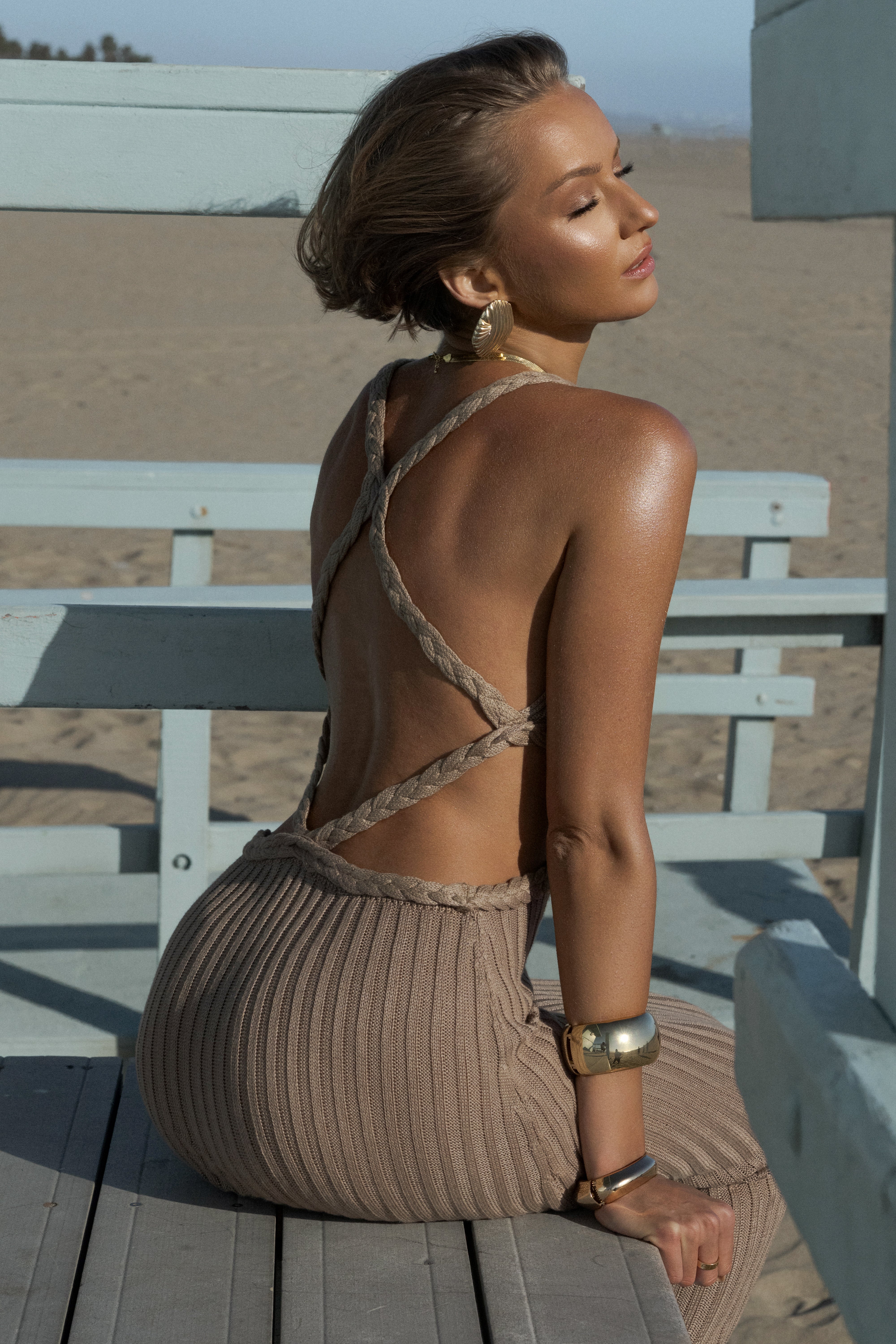 Our Mocha Drift And Dream Braided Maxi Dress brings soft elegance to every shoreline moment. Crafted from soft rib-knit fabric, it features a sleeveless design, a deep v-neckline, and intricately braided straps that evoke timeless sophistication. The standout details include a cutout design that graces the sides, adding a modern, stylish element to its artisanal charm. Crisscross braiding along the back and sides complements the cutout, while the fitted silhouette flatters every curve with effortless grace. Perfect for formal evenings or elegant gatherings, this standout piece shines with minimal accessories. Stretchy. Single lined.