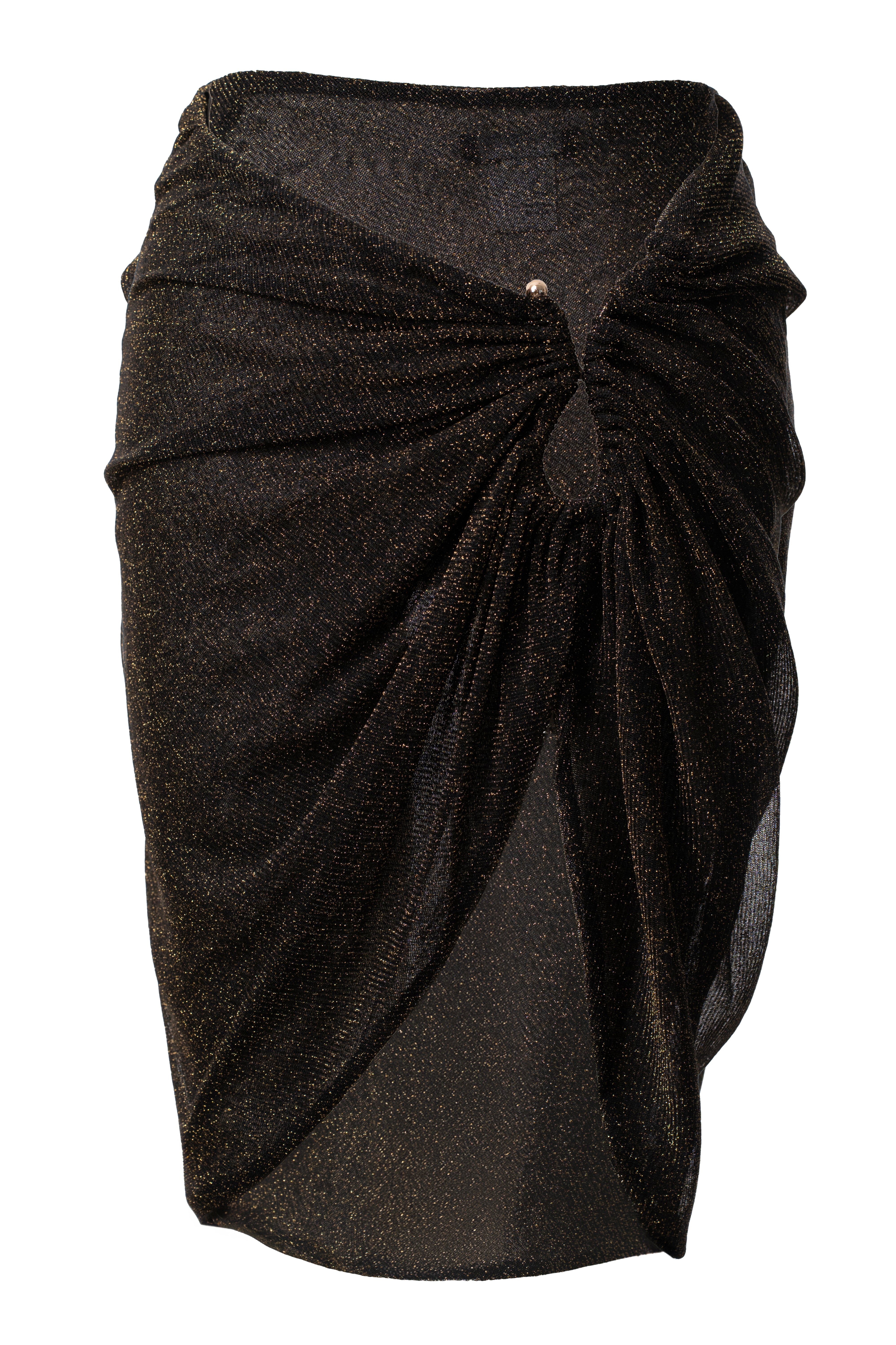 Designed for cabana days and coastal evenings, our Black Dreamscape Lurex Knit Mini Skirt adds a sophisticated touch to every sunlit moment. Crafted from shimmering, lightweight fabric, this stylish coverup strikes the perfect balance between modern edge and timeless elegance. A gathered center creates a bold focal point, accented by bold gold tone hardware for an extra hint of refinement. Stretchy. Double lined.