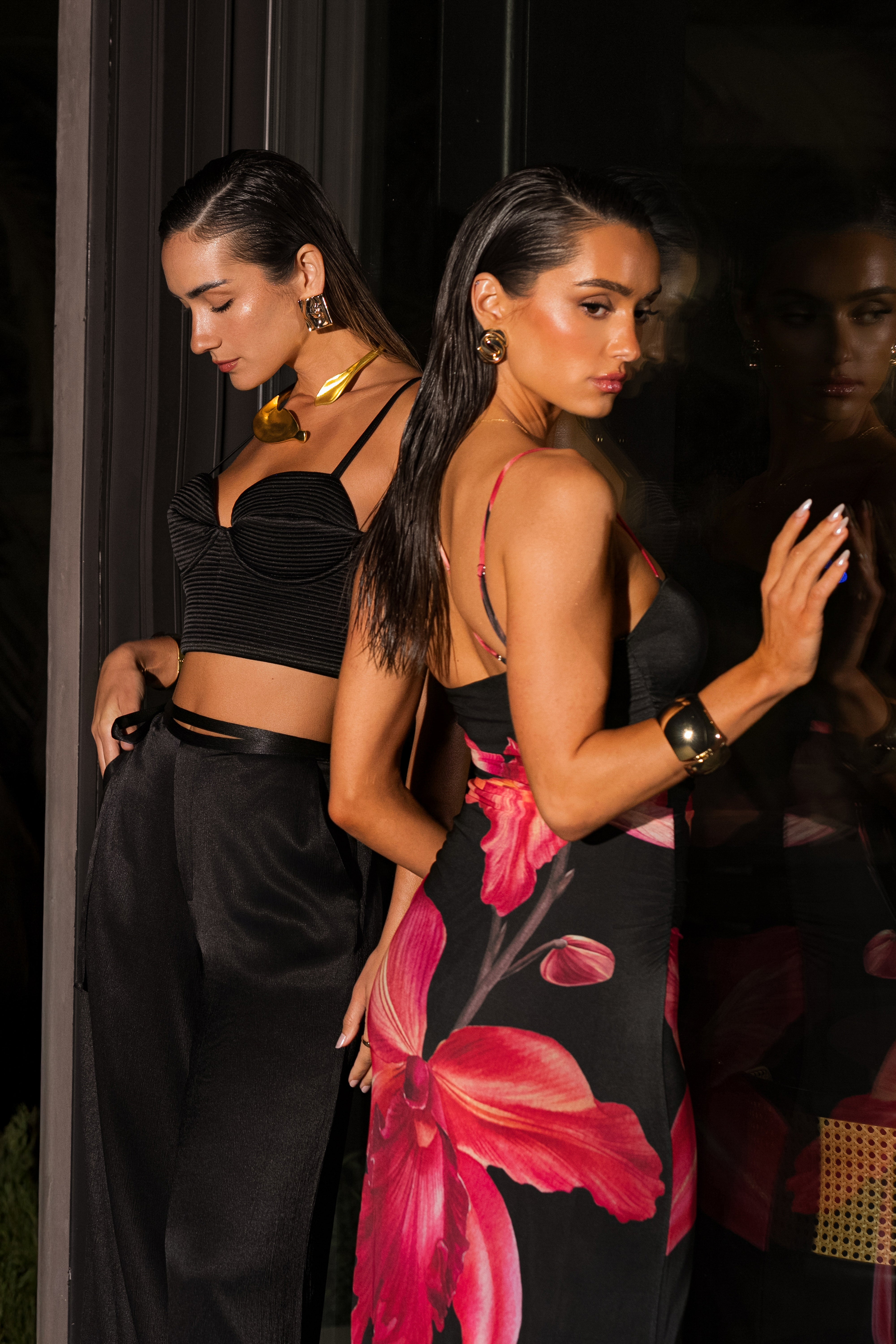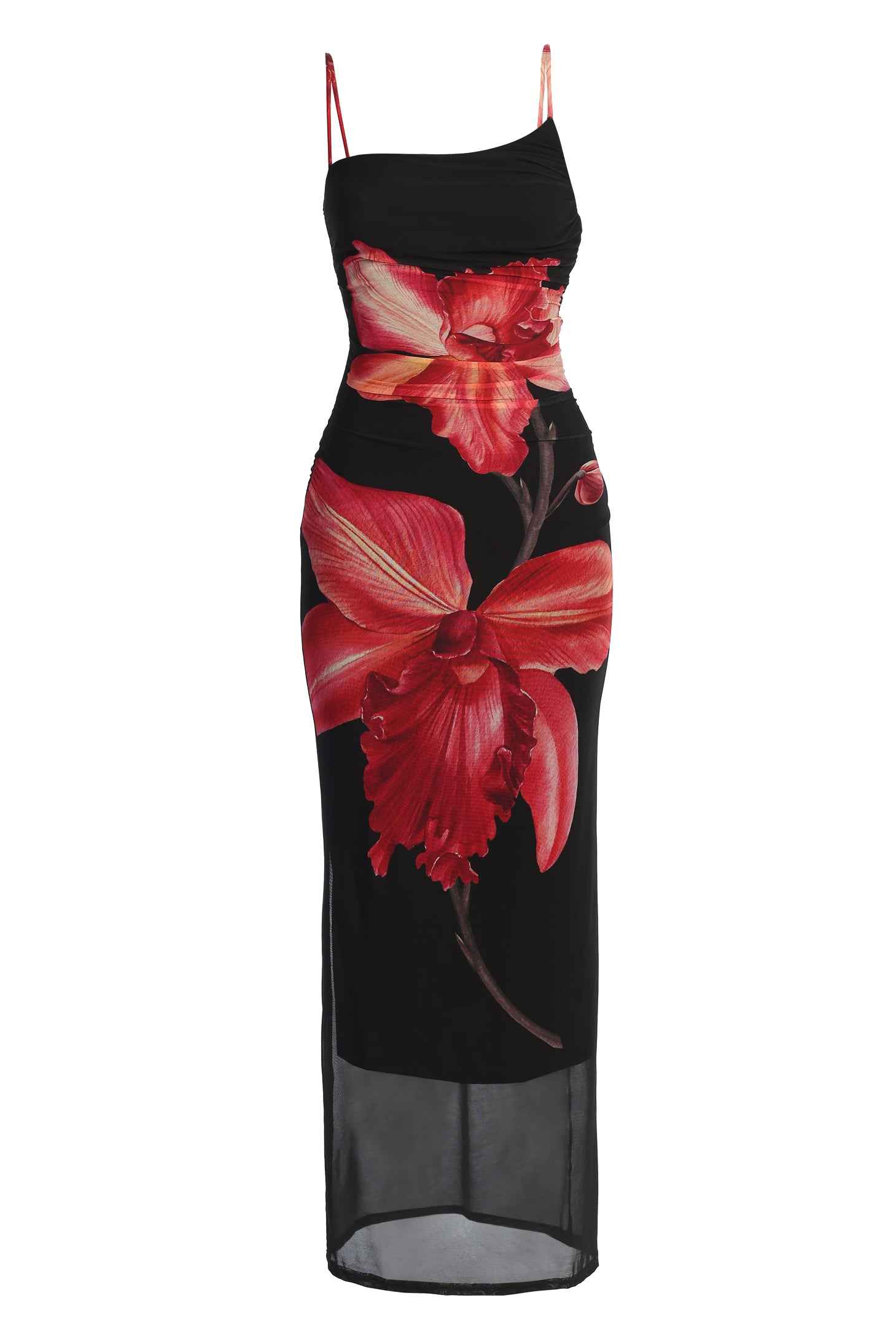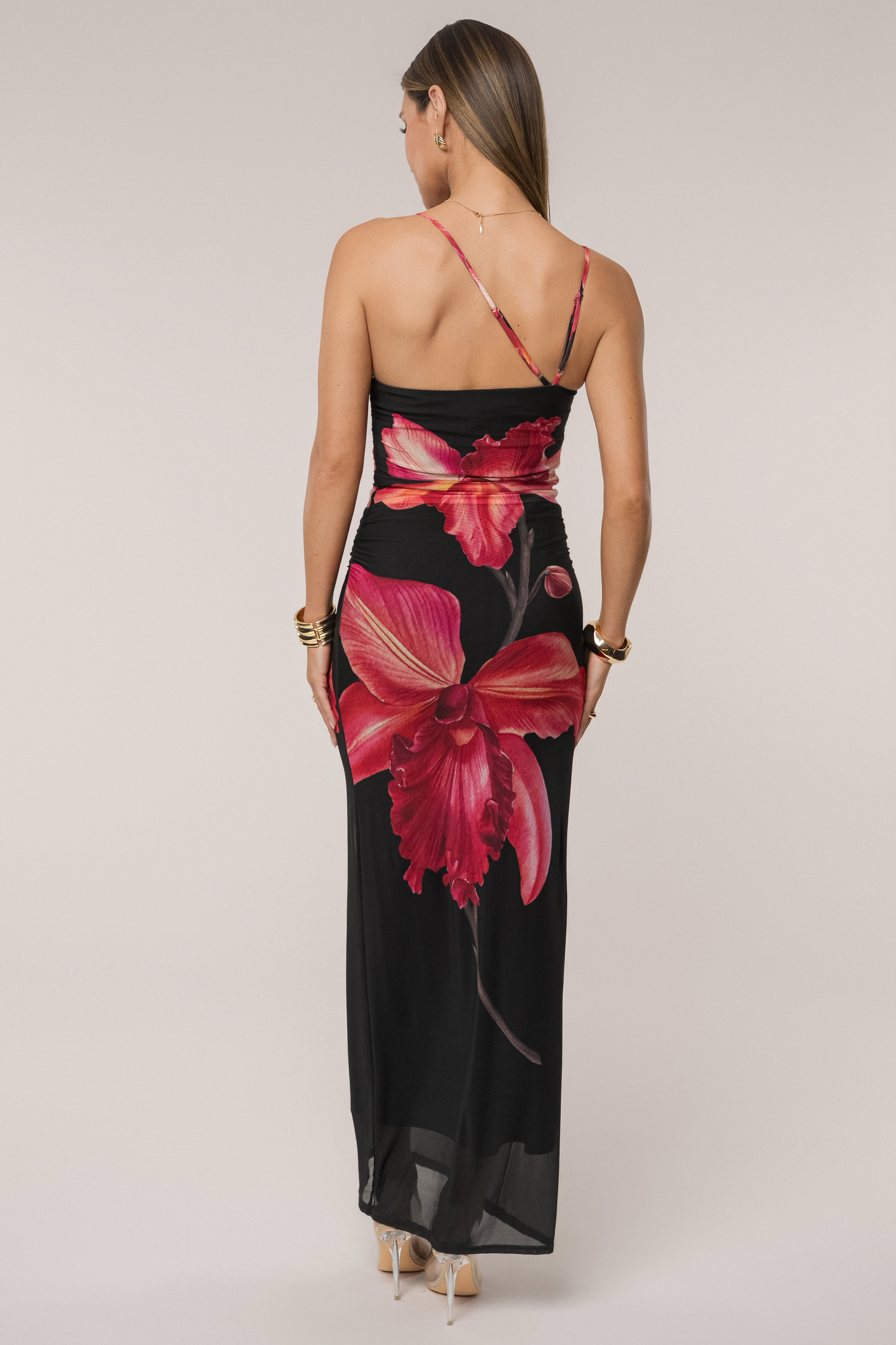 Escape to Paradise with our Black Floral Fleur De Lune Maxi Dress. This vacation ready dress is adorned with a vibrant floral pattern that captures a striking botanical-inspired elegance. An asymmetrical neckline with adjustable shoulder straps and a criss-cross back offer a flattering yet contemporary silhouette. Crafted from a stretchy mesh material offering flexible comfort. Stretchy. Double-lined.