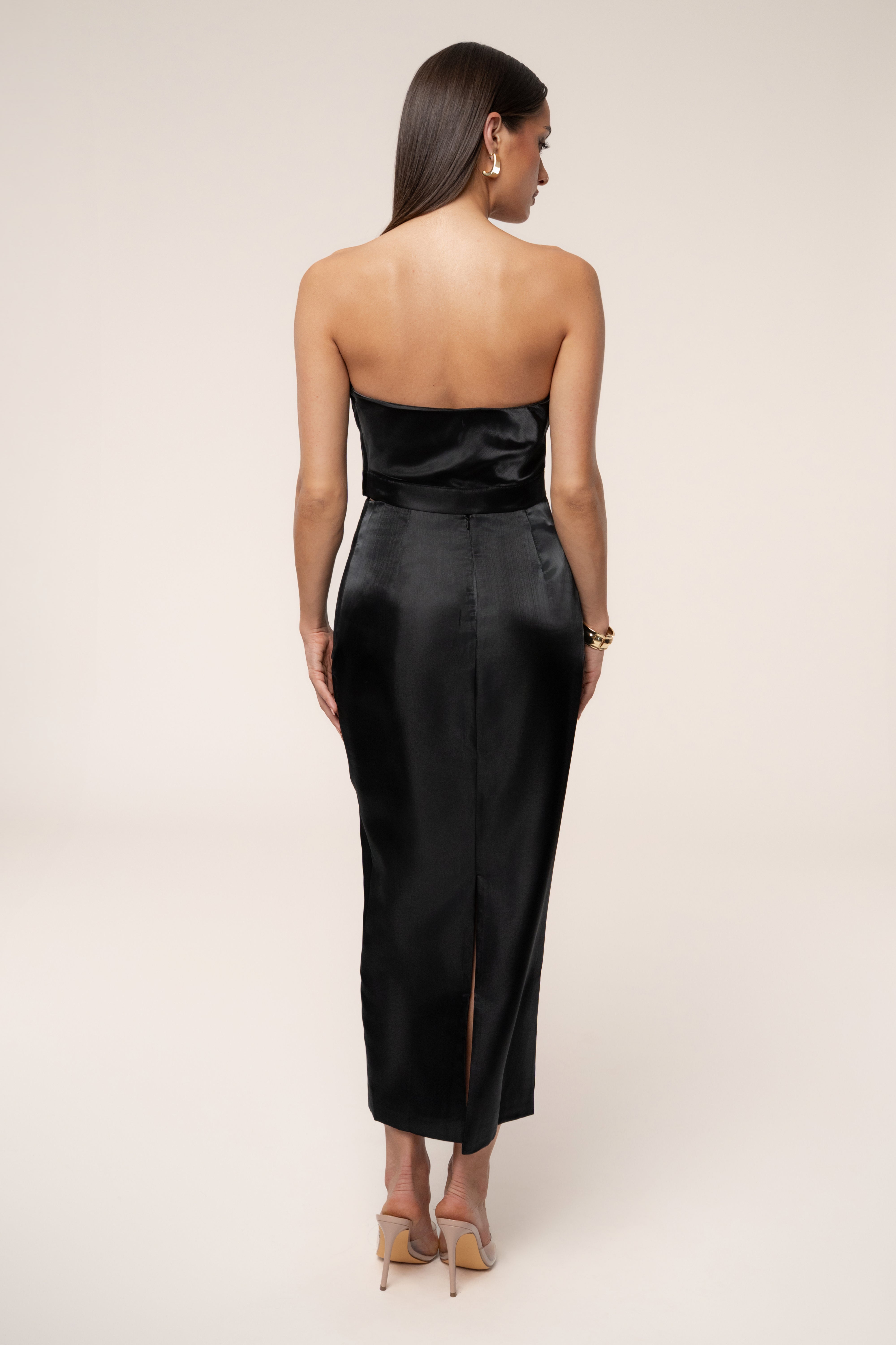 Indulge in luxury with our Black Gala Pleated Top. This stunning top is crafted from a high-quality, liquid organza fabric, featuring a voluminous fan inspired design. The boning provides a structured and flawless fit, while the side zipper closure adds convenience and style. Pair with our Reception Pleated Midi Skirt for the full look. Double lined. Minimal stretch. Not sold as set.