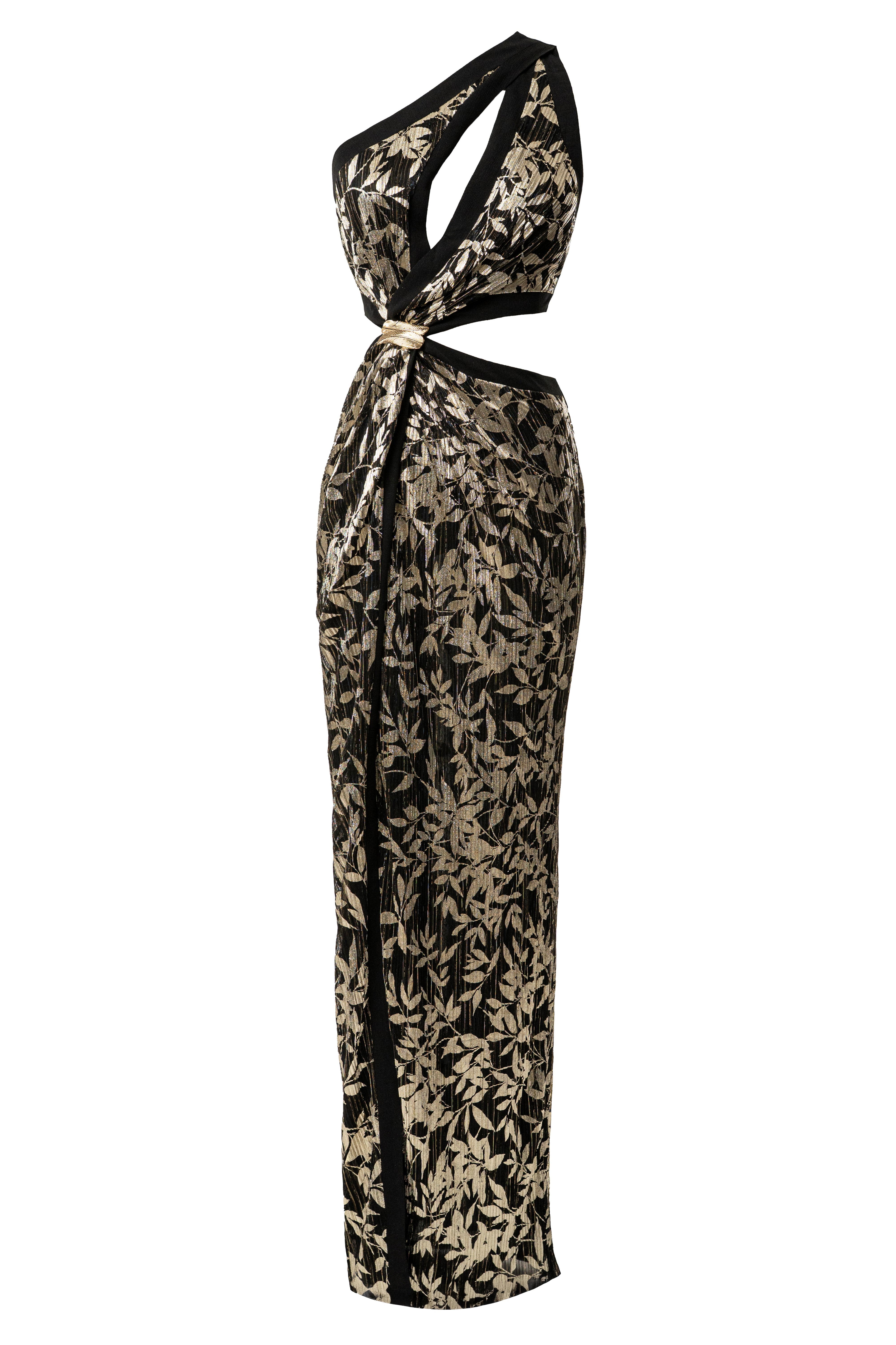 Glow with effortless elegance in our Black One Shoulder Keyhole Dress. This maxi-length gown features a one-shoulder neckline with stylish cutouts and a back tie closure, all highlighted by a gold-tone center embellishment. Crafted from lightweight chiffon with a shimmering floral pattern, it delivers a luxurious, ethereal finish. Finished with a hidden side zipper. Double lined. Minimal stretch.