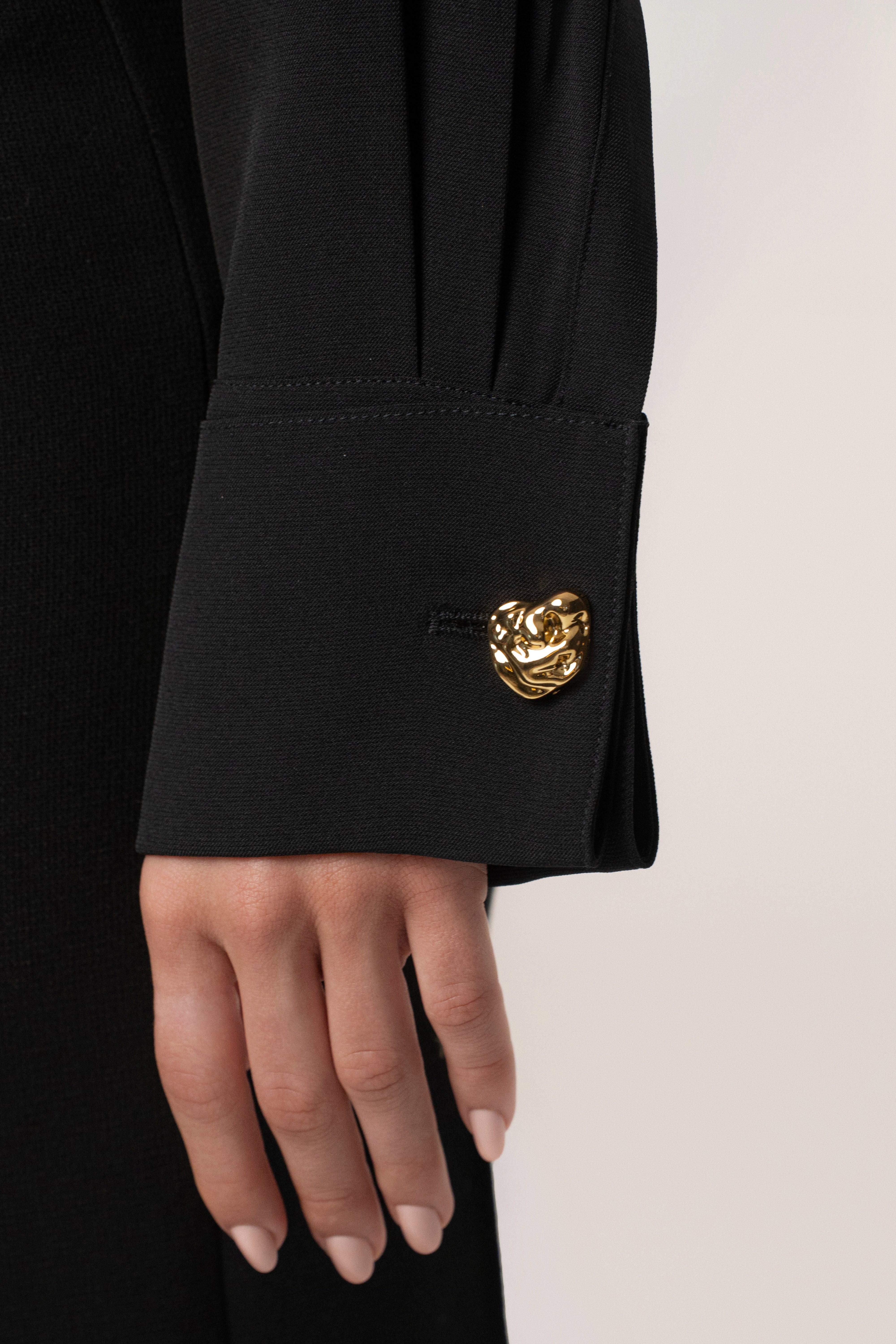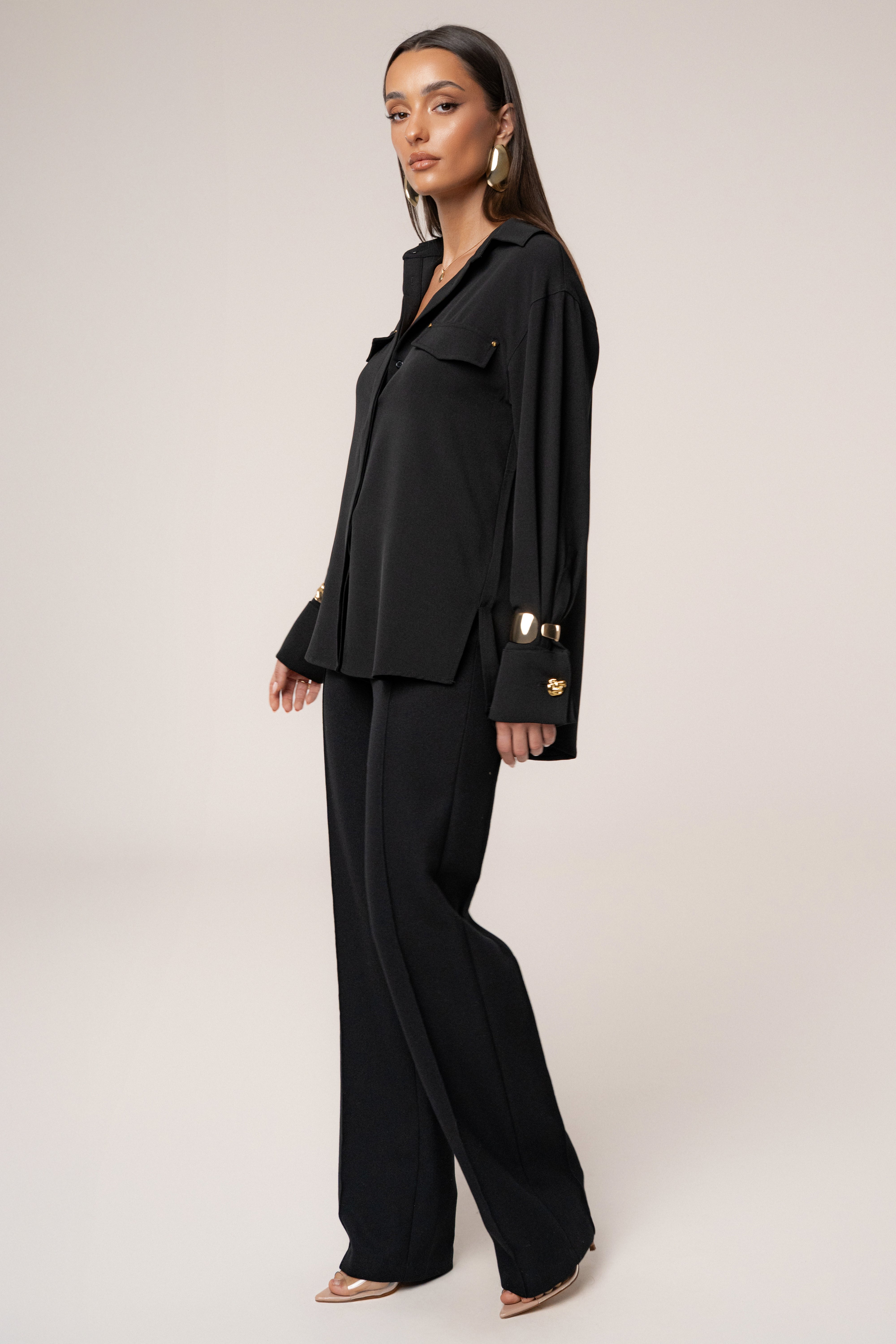 Our new Black Stella Button Up Shirt is the perfect mix of classic and contemporary. Featuring a crisp collared neckline and long sleeves, this versatile top is completed with a button-front closure and decorative flap pockets. Gold-tone accents on the sleeve cuffs add a touch of polished elegance. Relaxed fit with minimal stretch. Pair with our Axel Pleated Trousers for the full look. Single-lined.