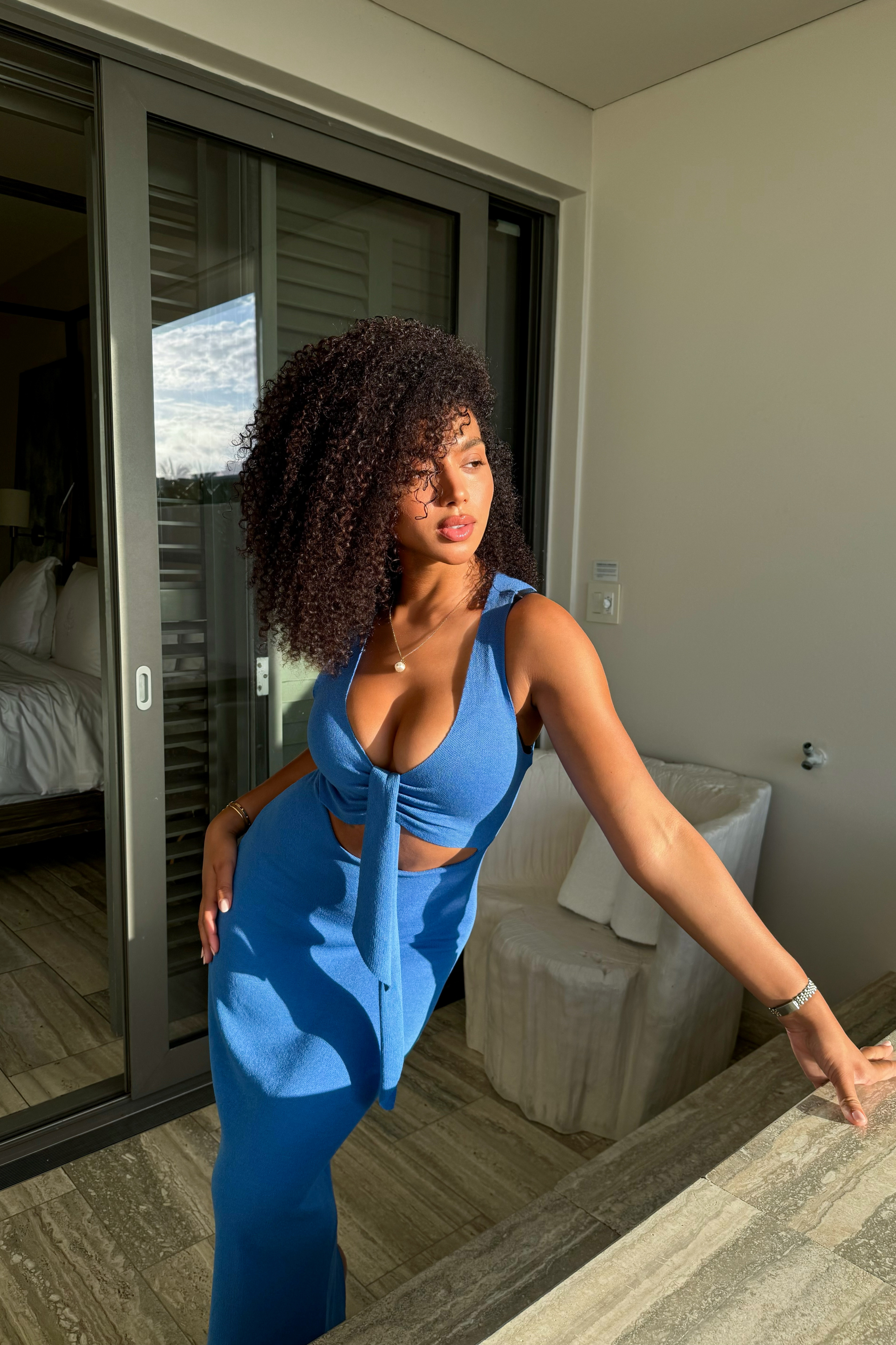 Sun-kissed elegance meets effortless texture with our Blue Adrienna Maxi Dress. Featuring a low neckline, chic cutout, and delicate front ties, it's perfect for casual outings and formal events under the sun. Made from soft, breathable knit material, this versatile dress is a must-have wardrobe essential for the season. Back zipper closure and slit hem. Stretchy.