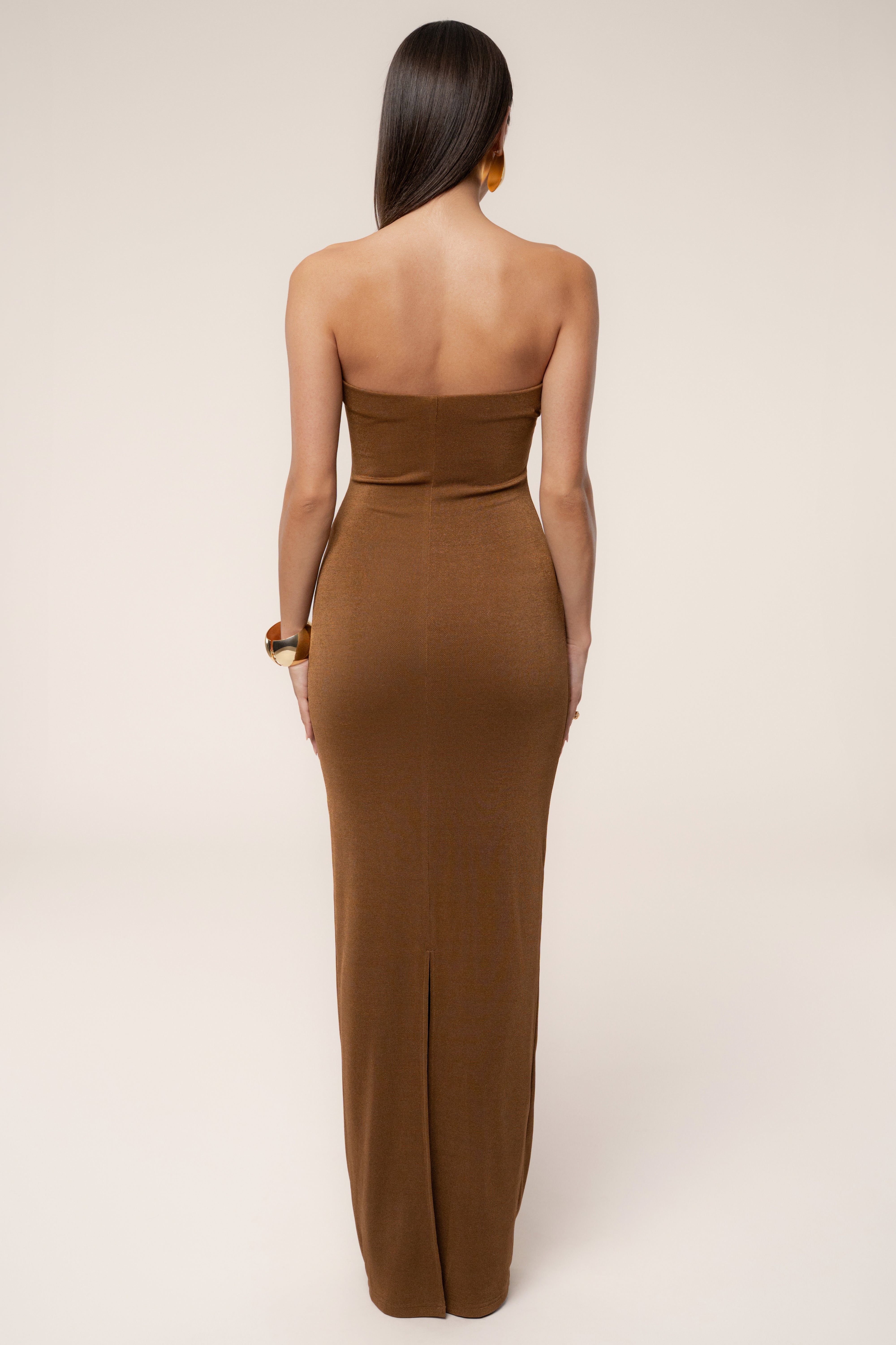 Our Bronze Celestial Drift Maxi Dress is a vision of timeless elegance, perfect for your next formal event. Its strapless design and fitted silhouette contours beautifully to your figure, while the maxi-length hem exudes sophistication. A delicate gold-tone accent at the waist adds a touch of glamour, and the back slit provides effortless movement. Finished with non-slip gel gripper at the bust for a secure hold. Double lined. Stretchy.