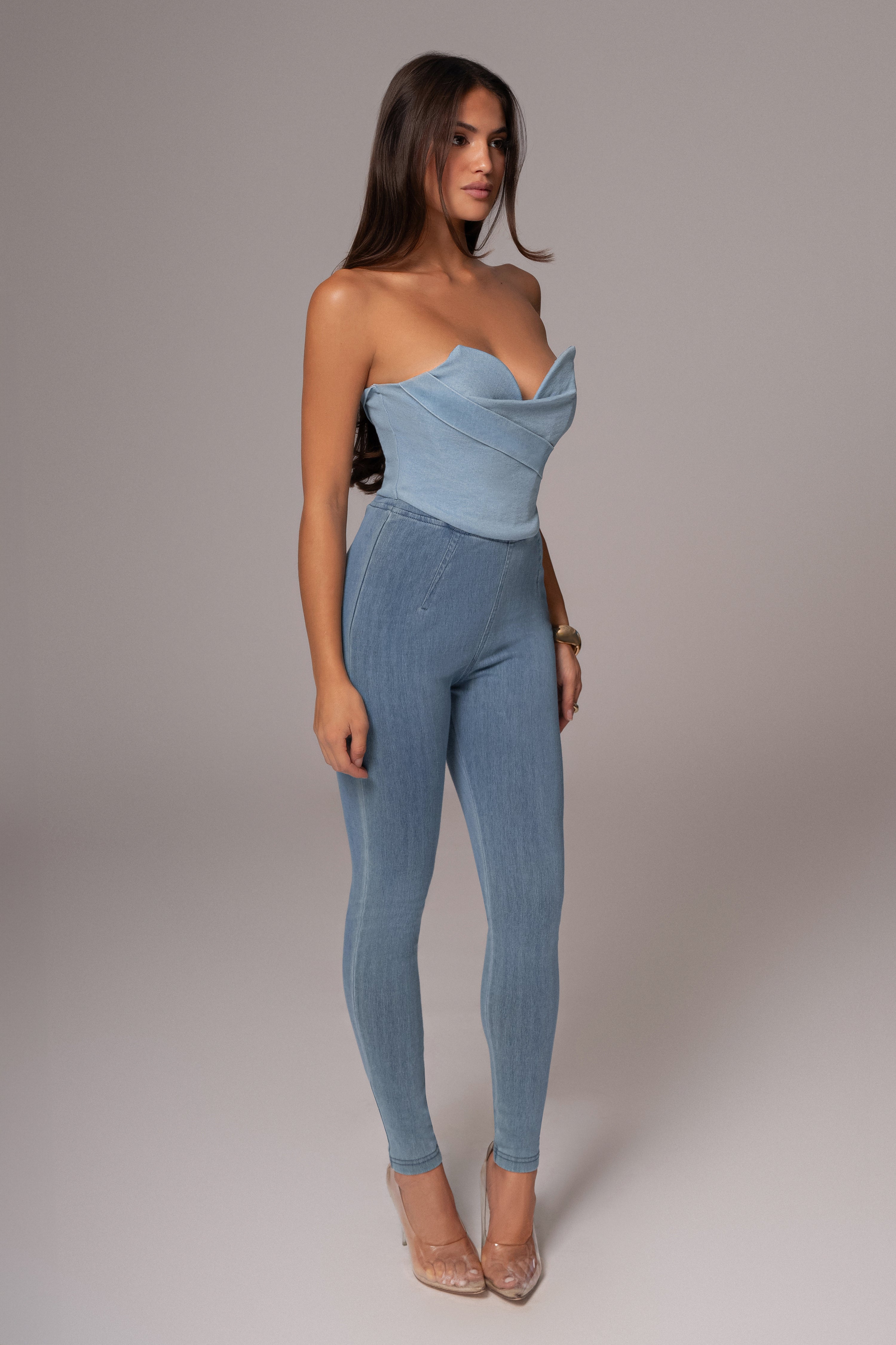 Forward to Fall with our Light Wash Teyana Denim Bustier. Crafted from a denim fabric with boning for structure, this corset features a strapless neckline with v-shape wiring and subtle pleating across the front/back bodice. Complete with a gold-tone side zipper closure, padded cups, and non-slip silicone grip at the bust for a secure hold. Pair with our Alice High Waisted Jeans for the full look. Medium stretch. Double lined.