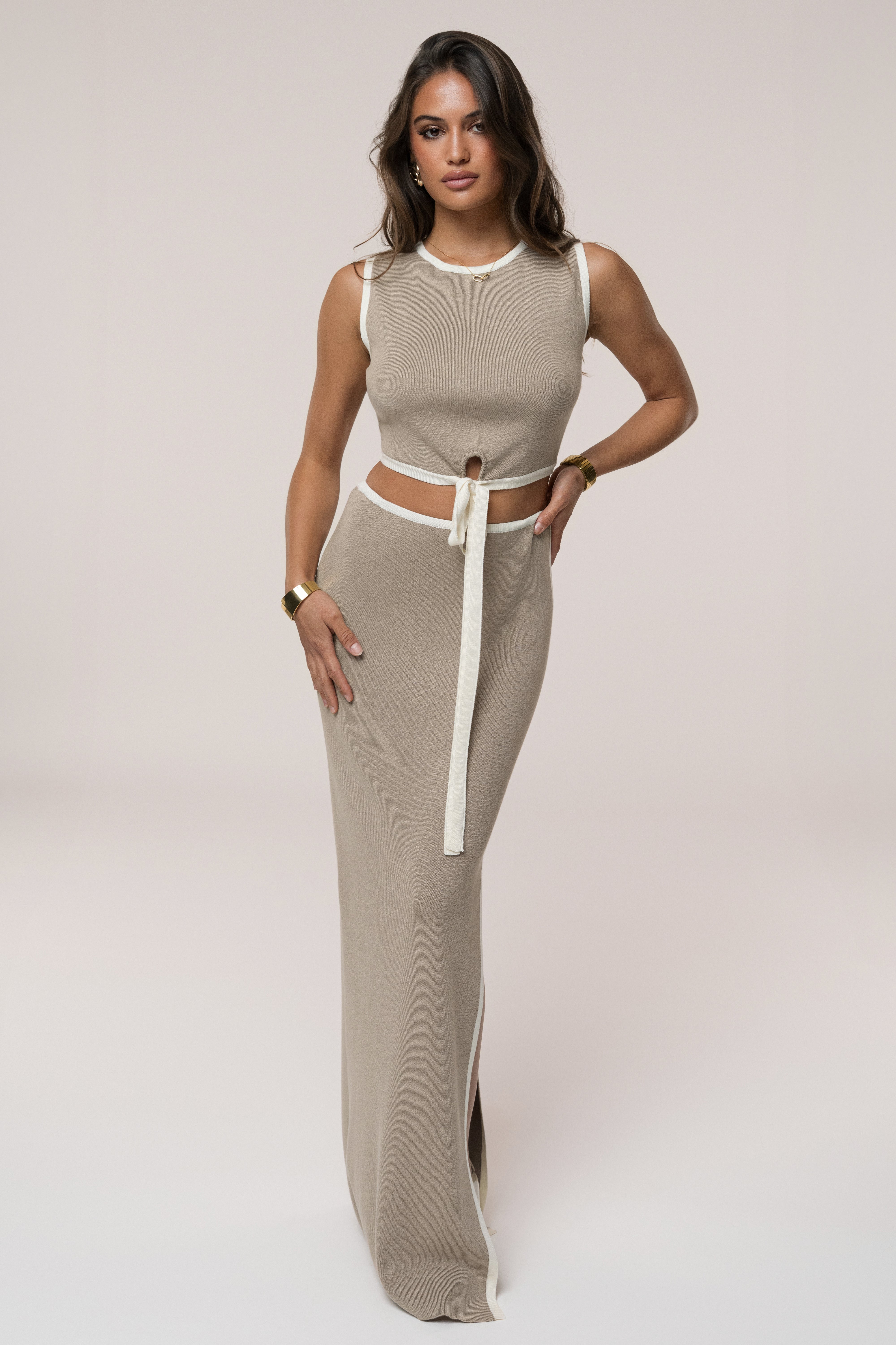 Channel seaside sophistication with our Taupe/Cream Anora Skirt Set, designed for summer and beyond. The sleeveless crop top features refined white trim, a subtle front cutout, and a front tie detail that adds a touch of playful elegance. Paired with a high-waisted, form-fitting maxi skirt, accented by white side trim and a sleek side slit, this set is both versatile and contemporary.