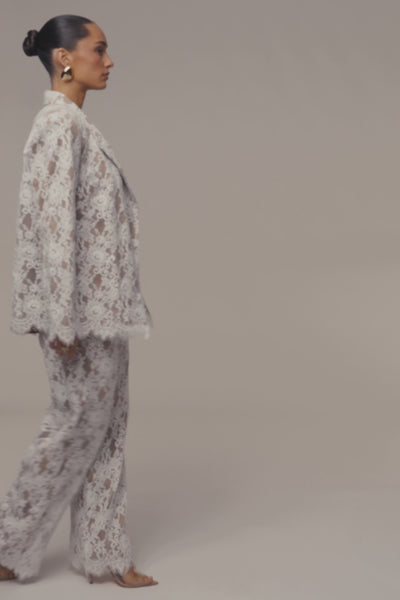 Our White Lace And Desire Blazer redefines power dressing with a sheer, seductive twist. Crafted from intricate floral lace, this tailored design features a classic lapel, single-button closure, and softly structured fit for a balance of polish and appeal. The nude underlining creates a bold yet refined statement while delicate scalloped enhance the look with romantic detail. Pair with our Forever Crush Lace Top and Forever Crush Lace Pant for the full look. Not sold as set.