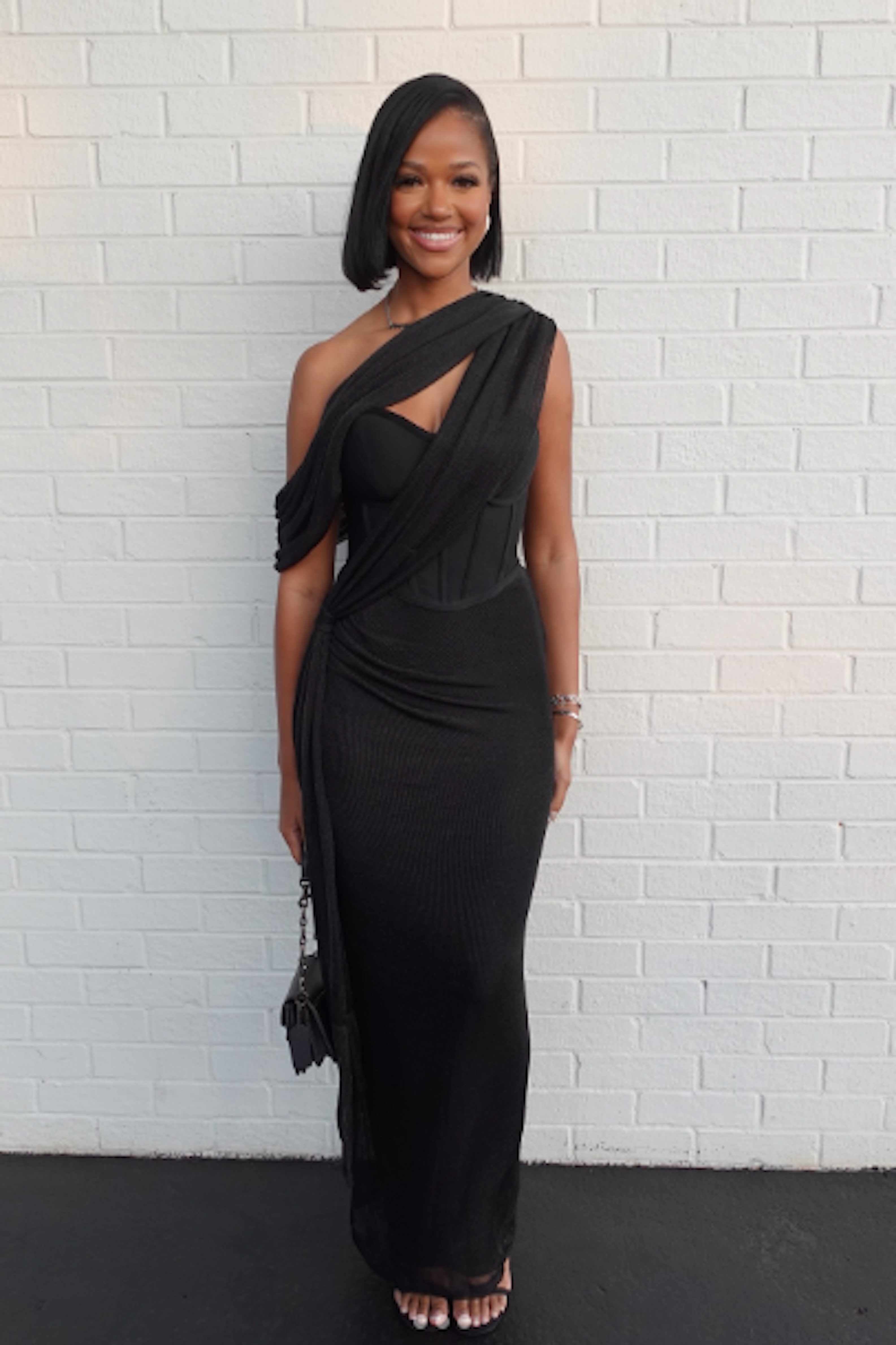 Our Black Metallic Celestina Draped Maxi Dress is sure to take your breath away with its asymmetric neckline, enchanting corset design, and elegantly draped waist. Crafted from a luxurious blend of bandage and metallic chain netting fabric, this stunning maxi dress features an adjustable shoulder strap, cup padding, and boning on each side for added structure. It’s finished with a back zipper closure and non-slip grip gel at the bust for a secure hold. Double-lined. Stretchy.