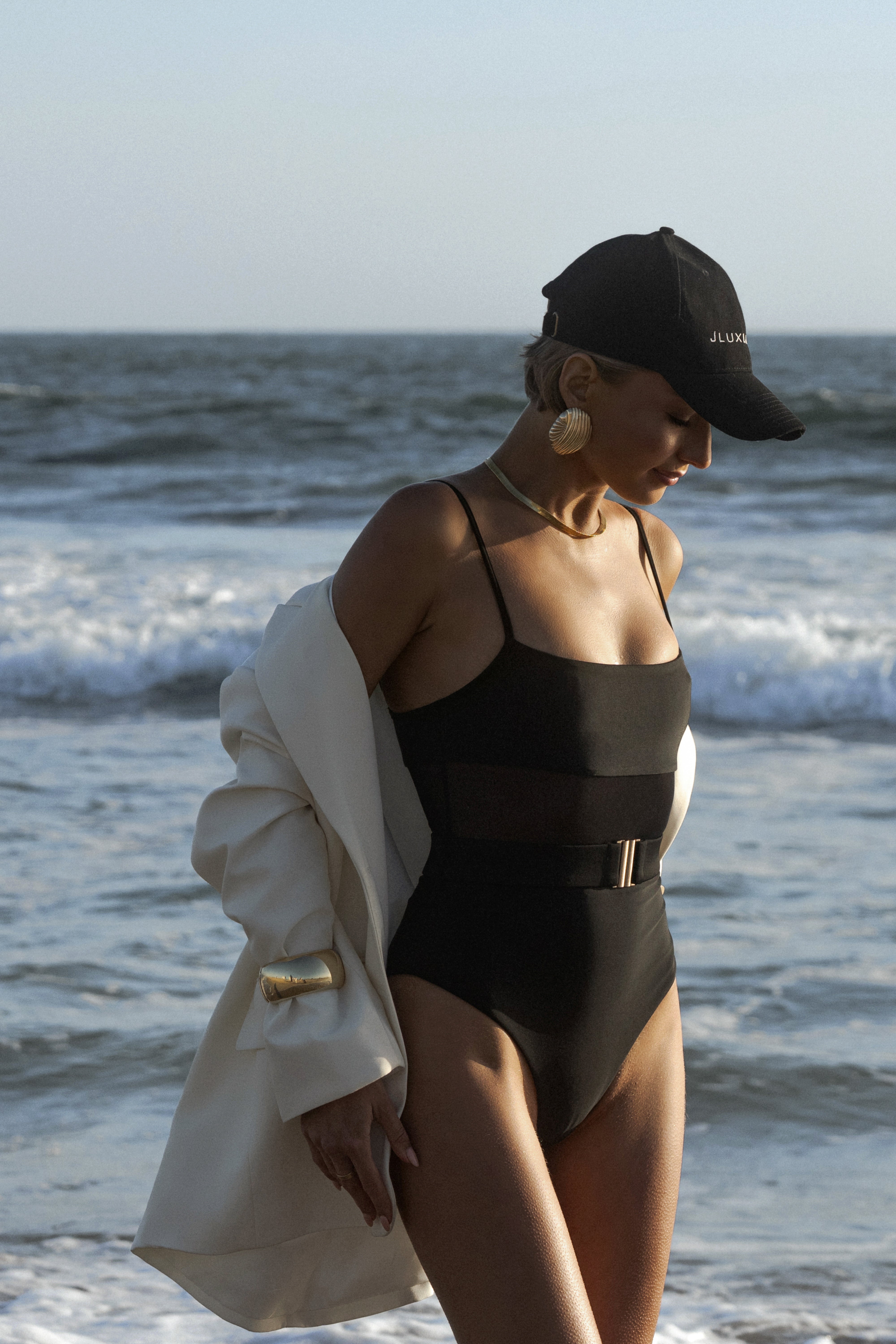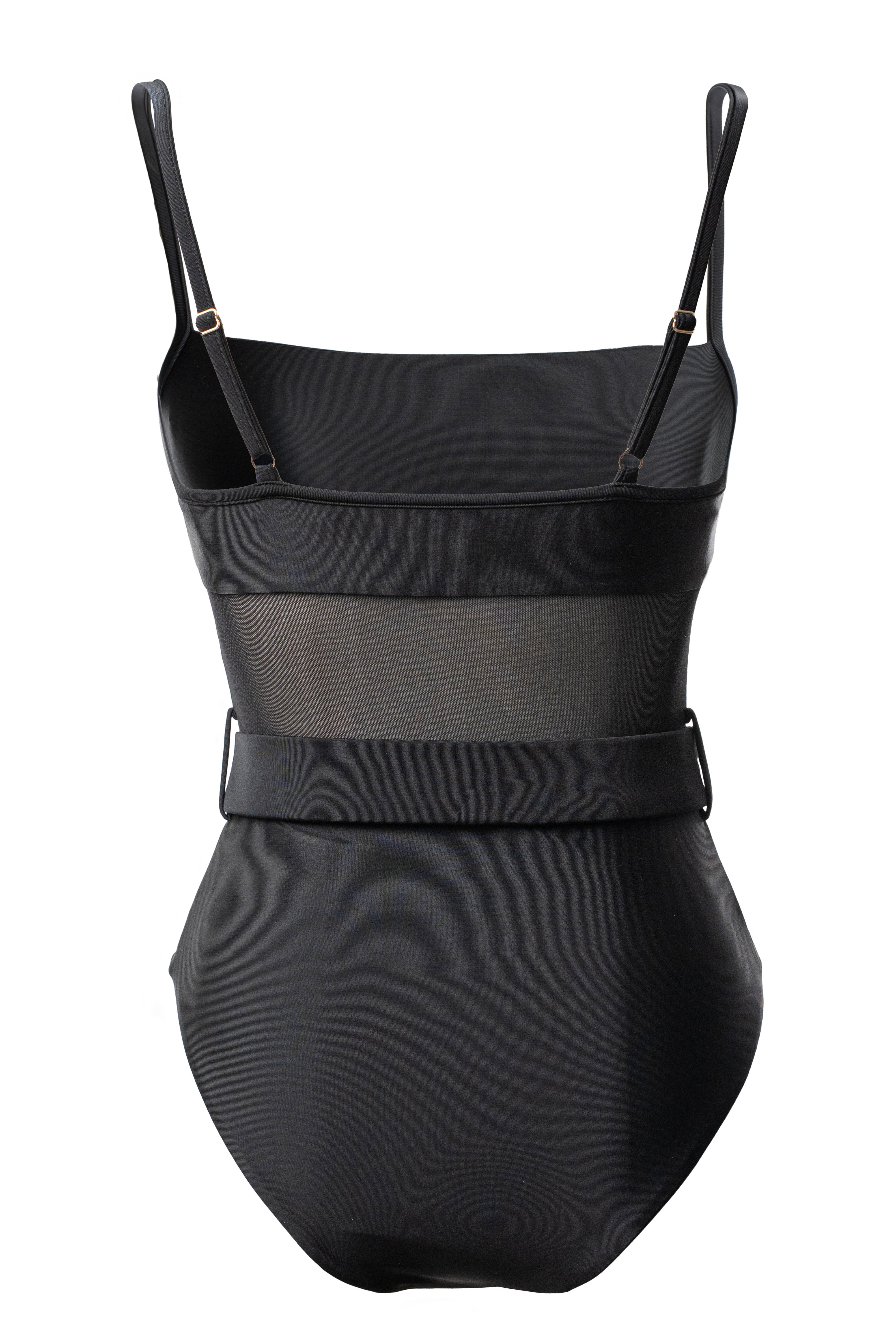 Turn heads this summer with our Black Solare Belted Swimsuit. Designed in classic black, this swimsuit features a chic mesh midsection, thin adjustable straps, and a stylish belt adorned with a gold-tone buckle for a polished touch. This swimsuit flatters your figure while exuding modern elegance, making it perfect for both poolside lounging and beach outings. Double lined. Stretchy.