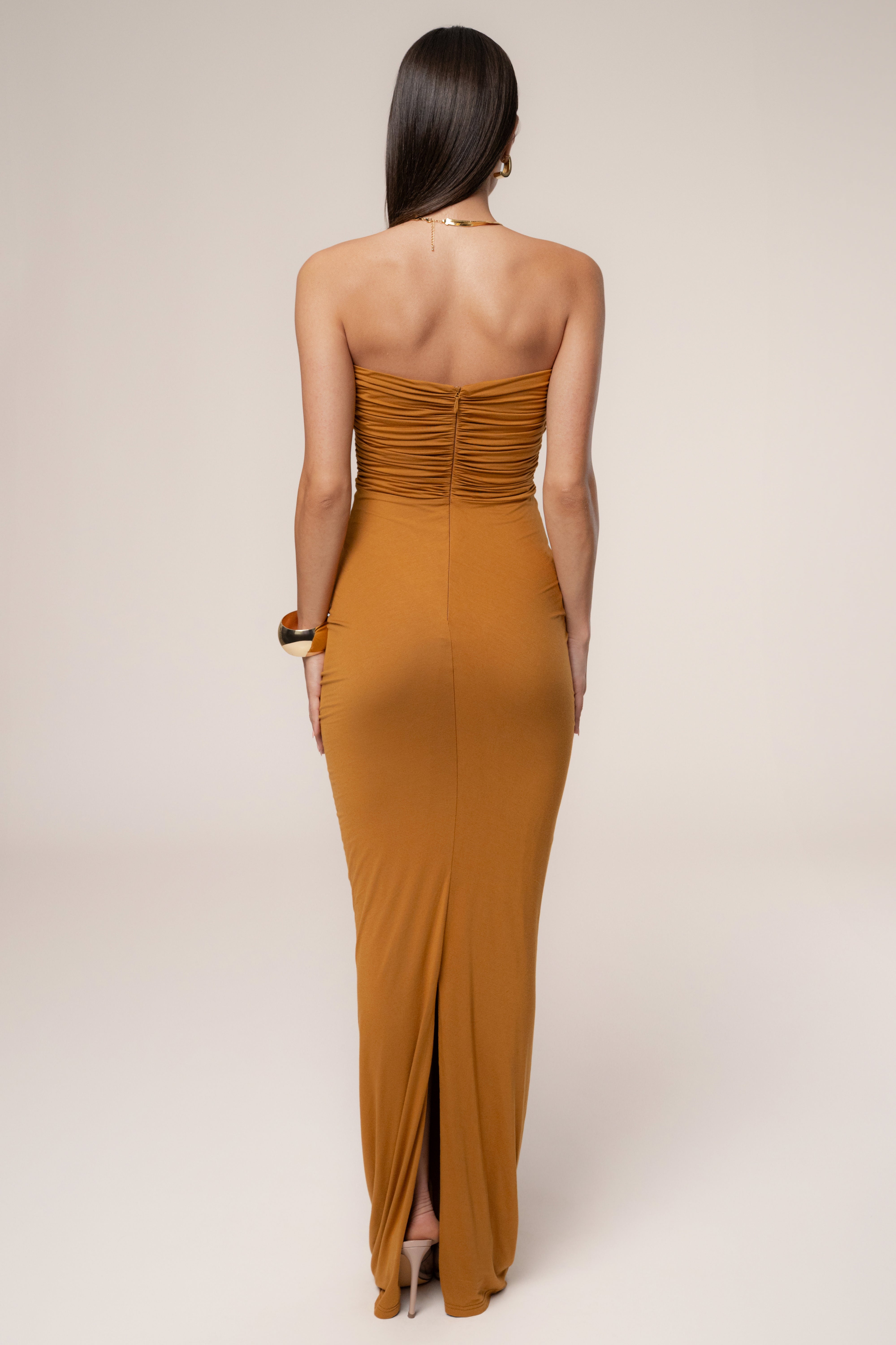 Step into the spotlight with our Bronze Atlantis Drape Maxi Dress. Designed with a strapless sweetheart neckline, this figure-hugging style features a center cutout and gold-tone accent that adds a bold, modern edge. Delicate ruching and a central draped sash enhance the waist and create graceful movement throughout the maxi-length silhouette. Finished with a back zipper closure and non-slip silicone gripper at the bust for a secure hold. Double-lined. Stretchy.