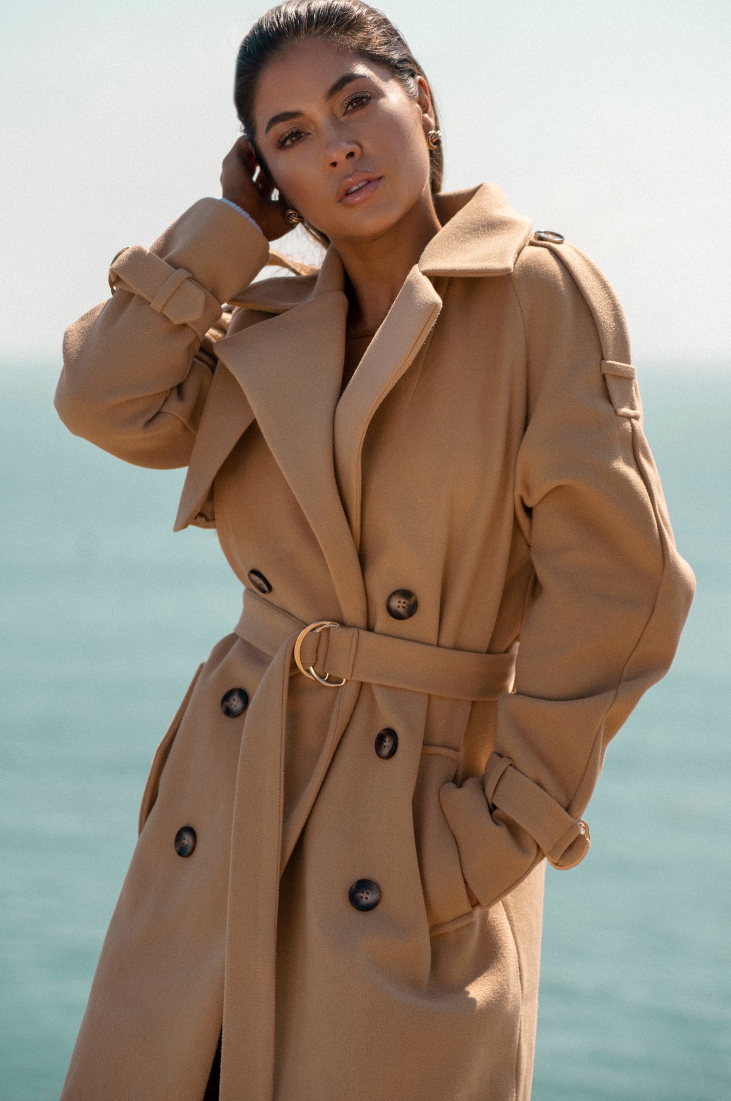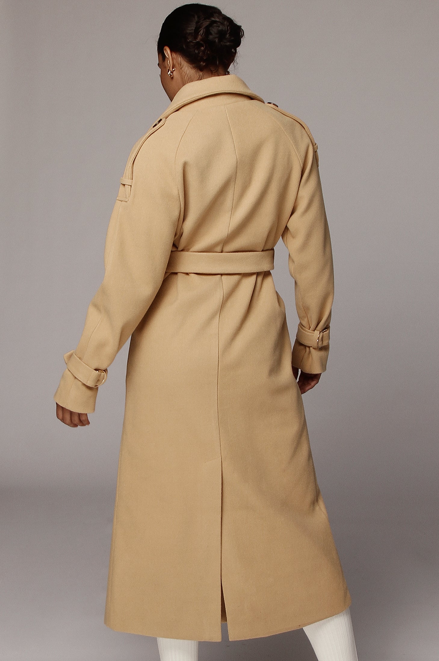 EXCLUSIVELY DESIGNED BY US FOR YOU. So Sophisticated and stylish. This coat features everything your fall coat calls for! Detailed with an upright shoulder flap, shoulder tabs, double breasted button closure, statement D link arm cuffs, gold-tone detailing, and front side pockets. Made of a thick wool - like composure with lining. Belt is included. Minimal Stretch.