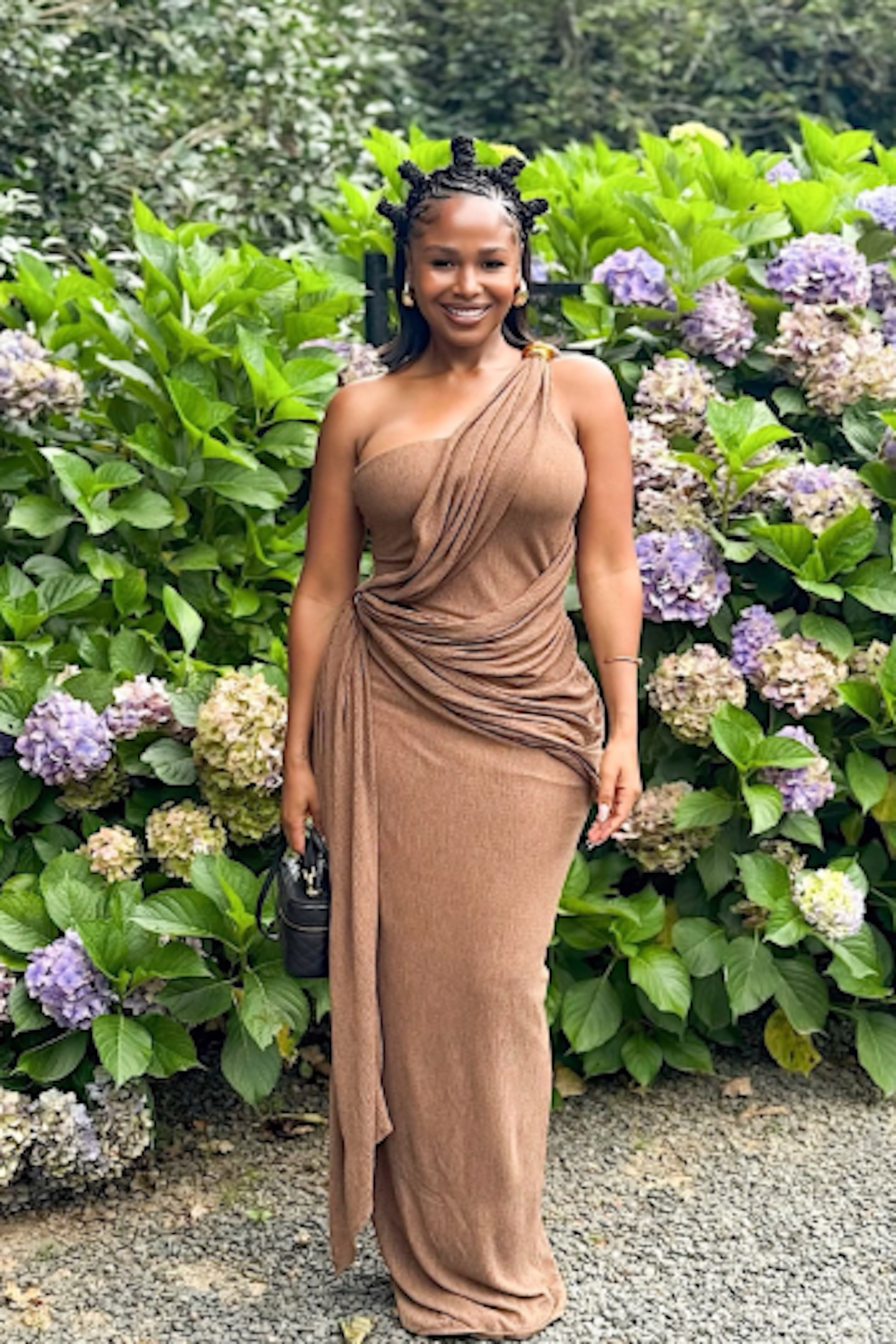 Draped in effortless sophistication, our Brown Rich Mocha Wrap Dress is designed to make an unforgettable statement. Crafted from a soft stretch-knit fabric, this one-shoulder maxi dress features elegantly gathered drapes with accent details that cascade across the body, creating a sculpted yet graceful silhouette. A draped overlay accentuates the waist and hip for a flattering, feminine shape, while the floor-length hem adds a touch of timeless allure. Perfect for elevated evenings and refined celebrations.