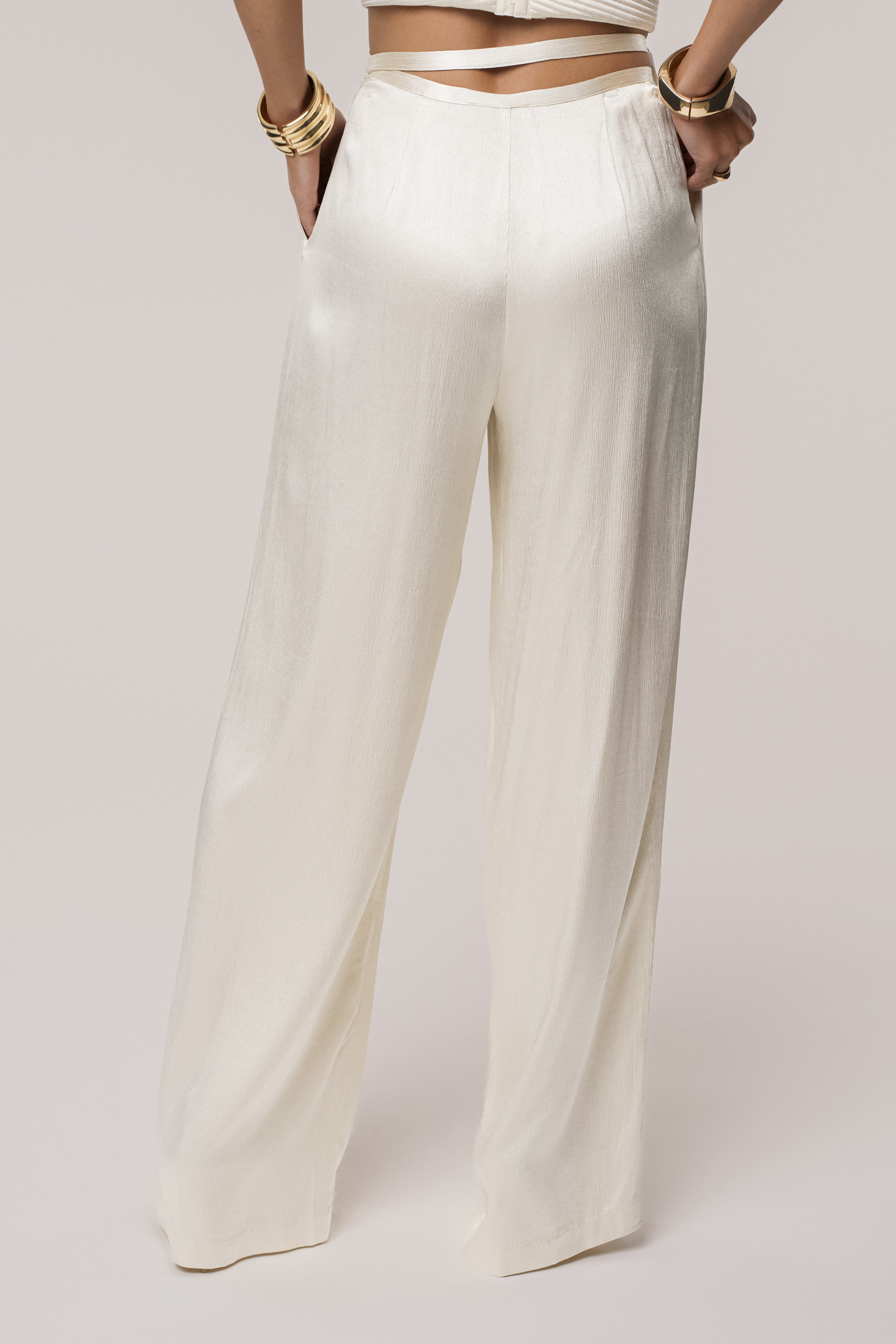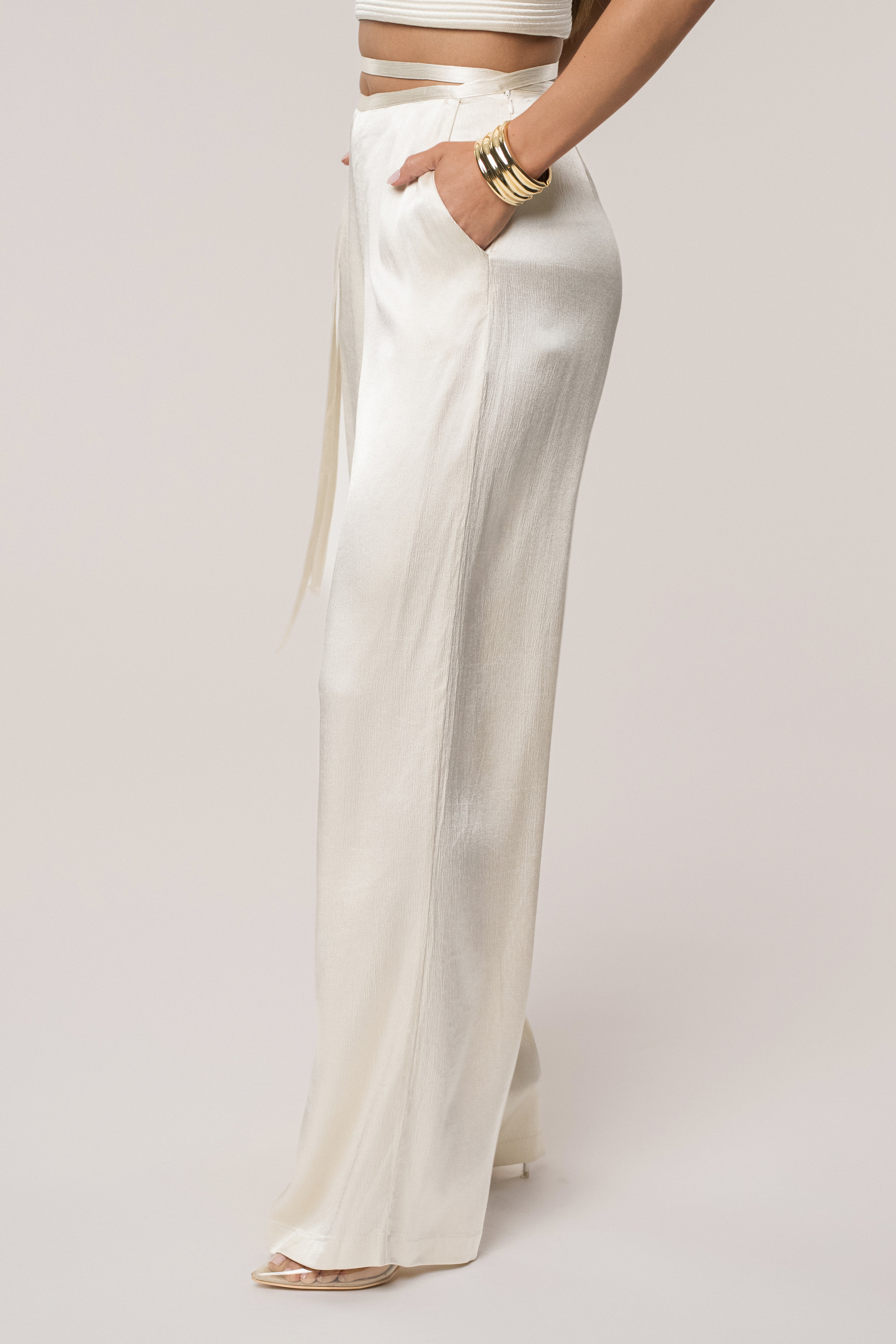 Bask in the glow of our Champagne Deserae Satin Pants. Crafted from lightweight material with a subtle sheen and texture, these chic high-waisted, wide-leg pants exude summer sophistication. The light cream color adds a touch of refinement, while the tie belt detail enhances the waist for a flattering silhouette. Functional side pockets bring practicality to the design without compromising style. Side zipper closure. Pair with our Thalia Textured Bustier for the full look. Single-lined. No stretch.