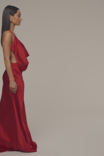 Bask in the beauty of our Red Delmara Cowl Maxi Dress. Designed with a halter neckline, elegant cowl drape, and a striking open back, this stunning silhouette is crafted from smooth satin for a refined, radiant finish. Single lined. No stretch.
