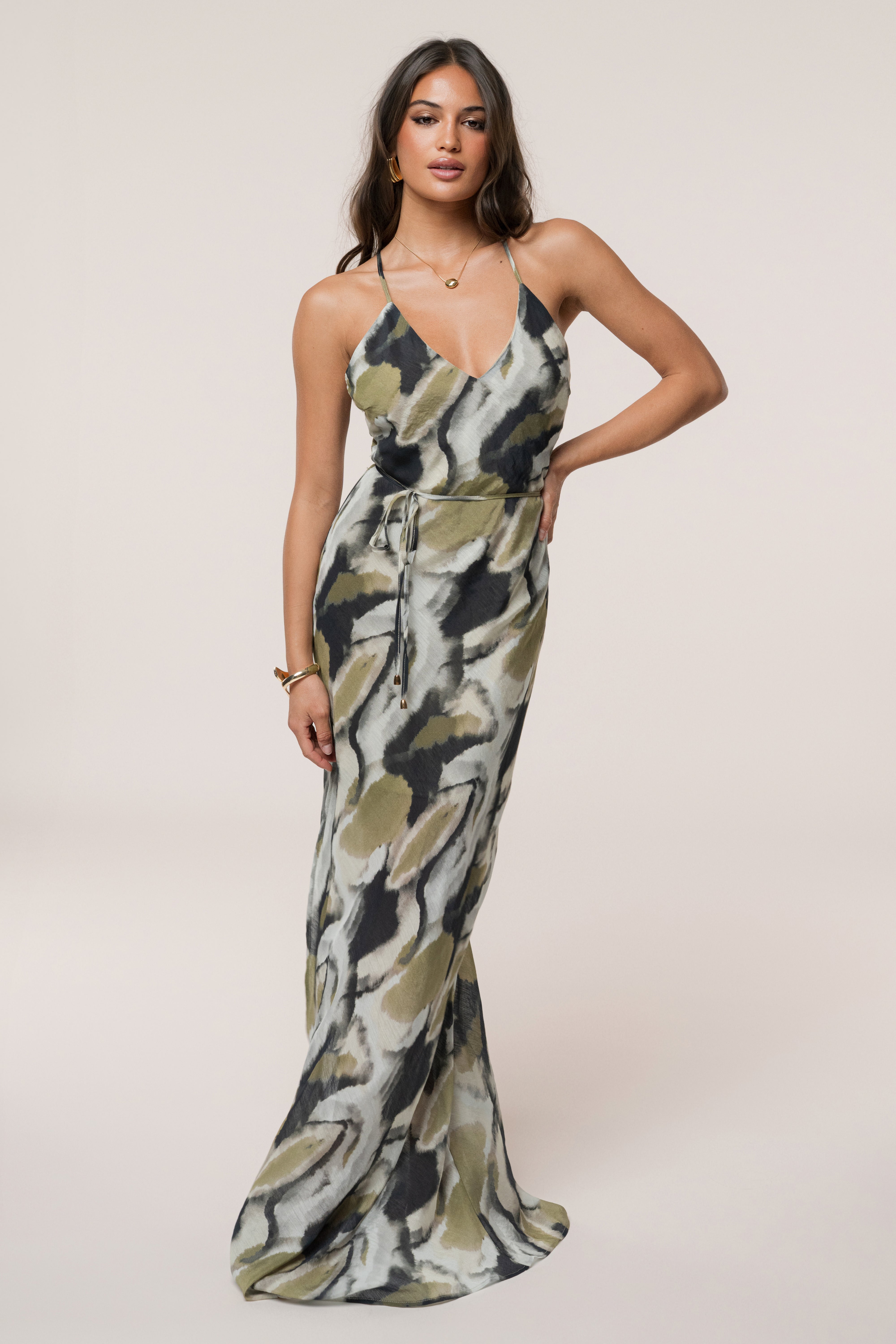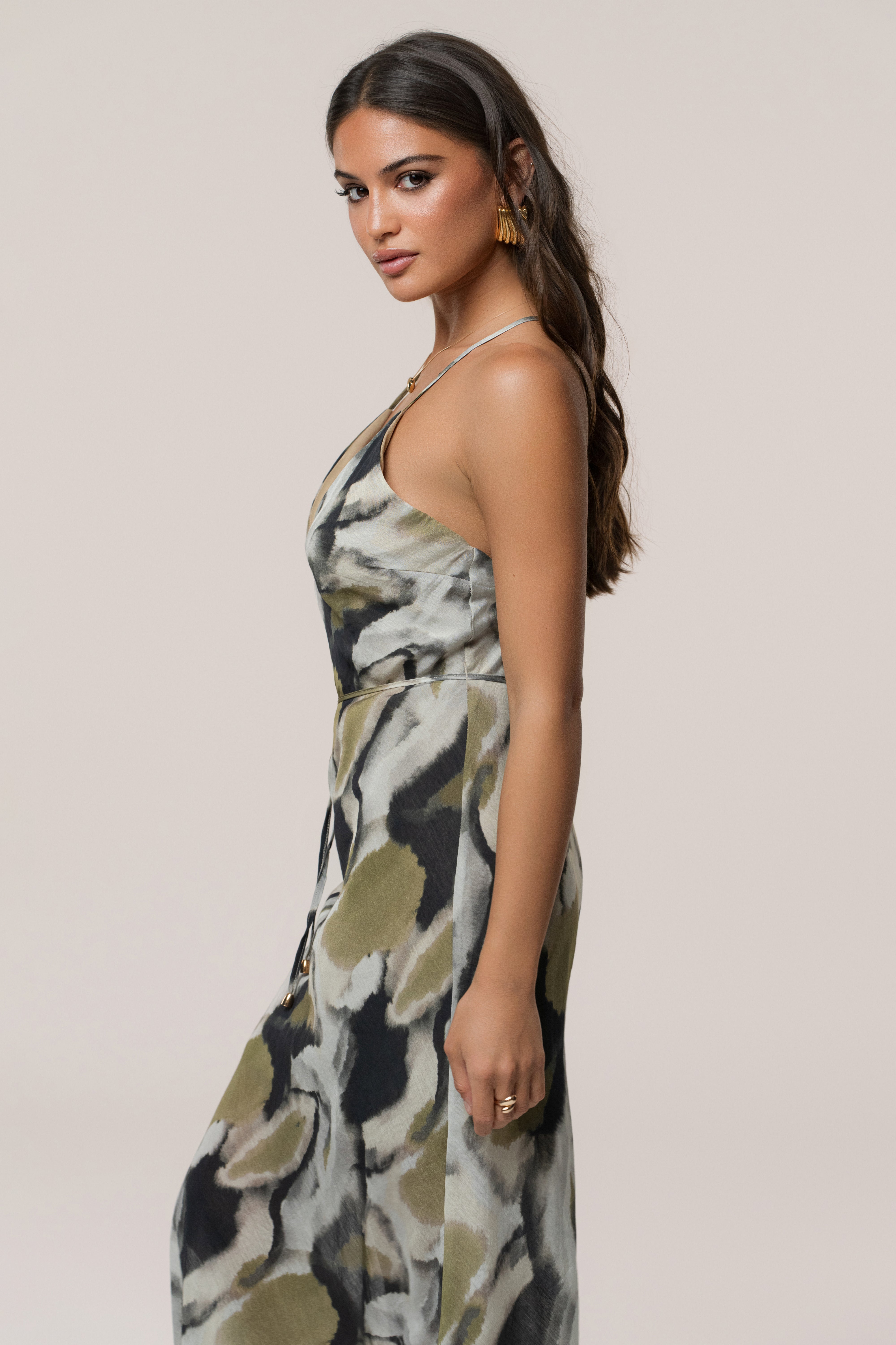 Drift into warmer days in our Grey Abstract Summer Reset Print Dress, featuring a camouflage-inspired abstract print in earthy tones of green, black, and white. This maxi dress is designed with a flattering V-neckline, adjustable shoulder straps that crisscross in the back, and a side slit for added movement. Finished with thin waist ties for a cinched silhouette. Double-lined. Minimal stretch