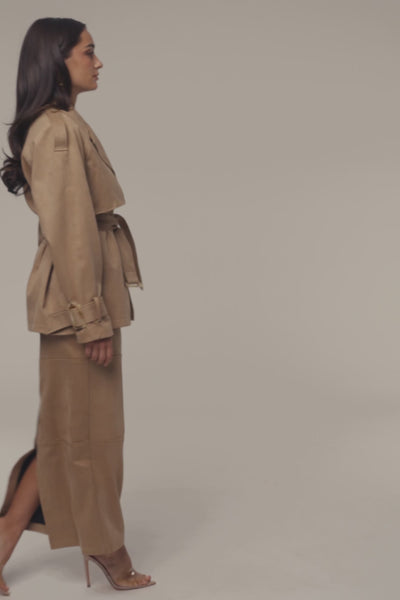 Our Beige Nightfall Suede Jacket blends timeless sophistication with modern flair. This oversized belted blazer features notch lapels, a double-breasted front closure, and functional side pockets for both style and practicality. A matching waist belt with a tortoise shell squared buckle enhances the silhouette, while belted cuffs and shoulder tabs add an extra touch of refinement. Crafted from an ultra soft suede fabric perfect for the season. Pair with our Audrey Suede Midi Skirt for the full look. Padded shoulders. No stretch. Double lined.