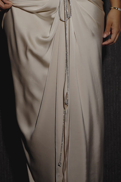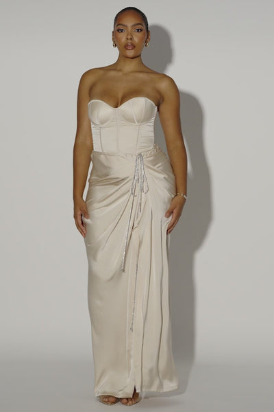 Experience the luxurious elegance of our Champagne Olea Satin Skirt. Crafted from luxurious satin fabric, this timeless maxi skirt exudes sophistication in a draped design adorned with adjustable rhinestone trim ties and a side slit, making it perfect for formal occasions! Pair with our Leo Matte Satin Bustier for the full look. No stretch. Side zipper closure. Single lined.