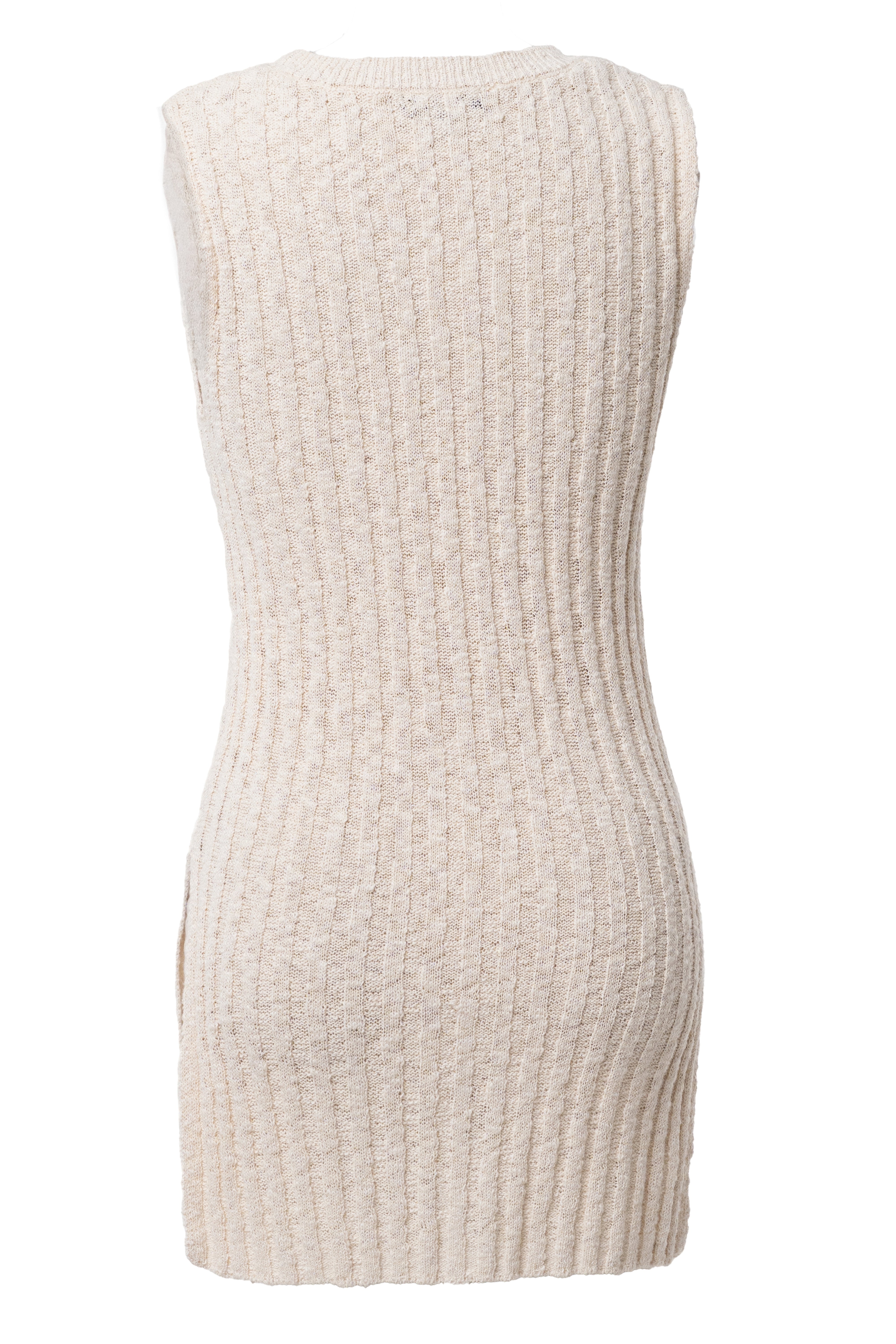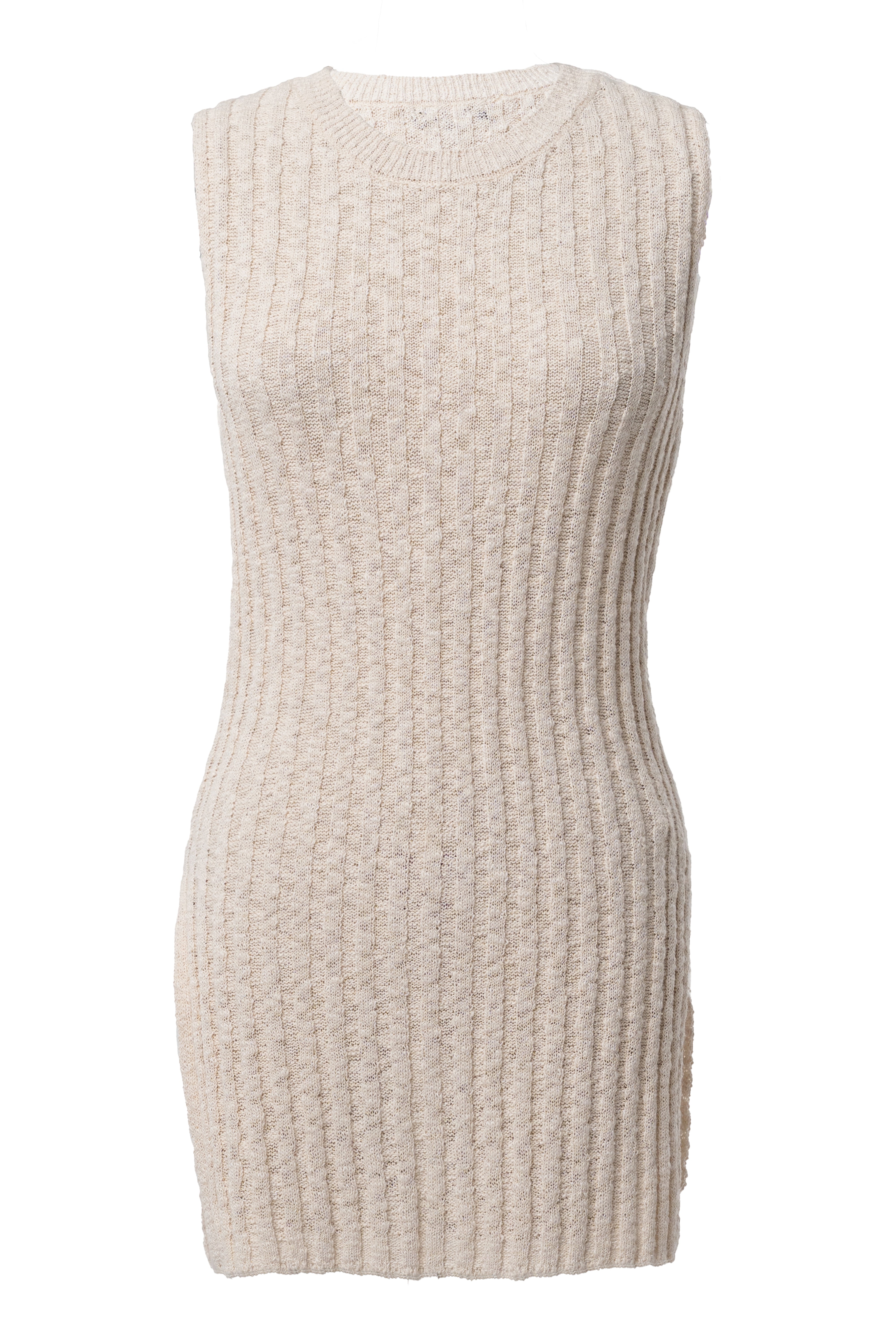 Step into summer with effortless style in the Ivory Kali Sleeveless Knit Top. Designed with a rib-knit pattern and scoop neckline, this sleeveless top with side slits brings both elegance and comfort to your wardrobe. Its lightweight, breathable fabric ensures you stay cool, making it ideal for sunny days. Pair with our Lanah Knit Flare Pants for the full look. Single lined. Stretchy.