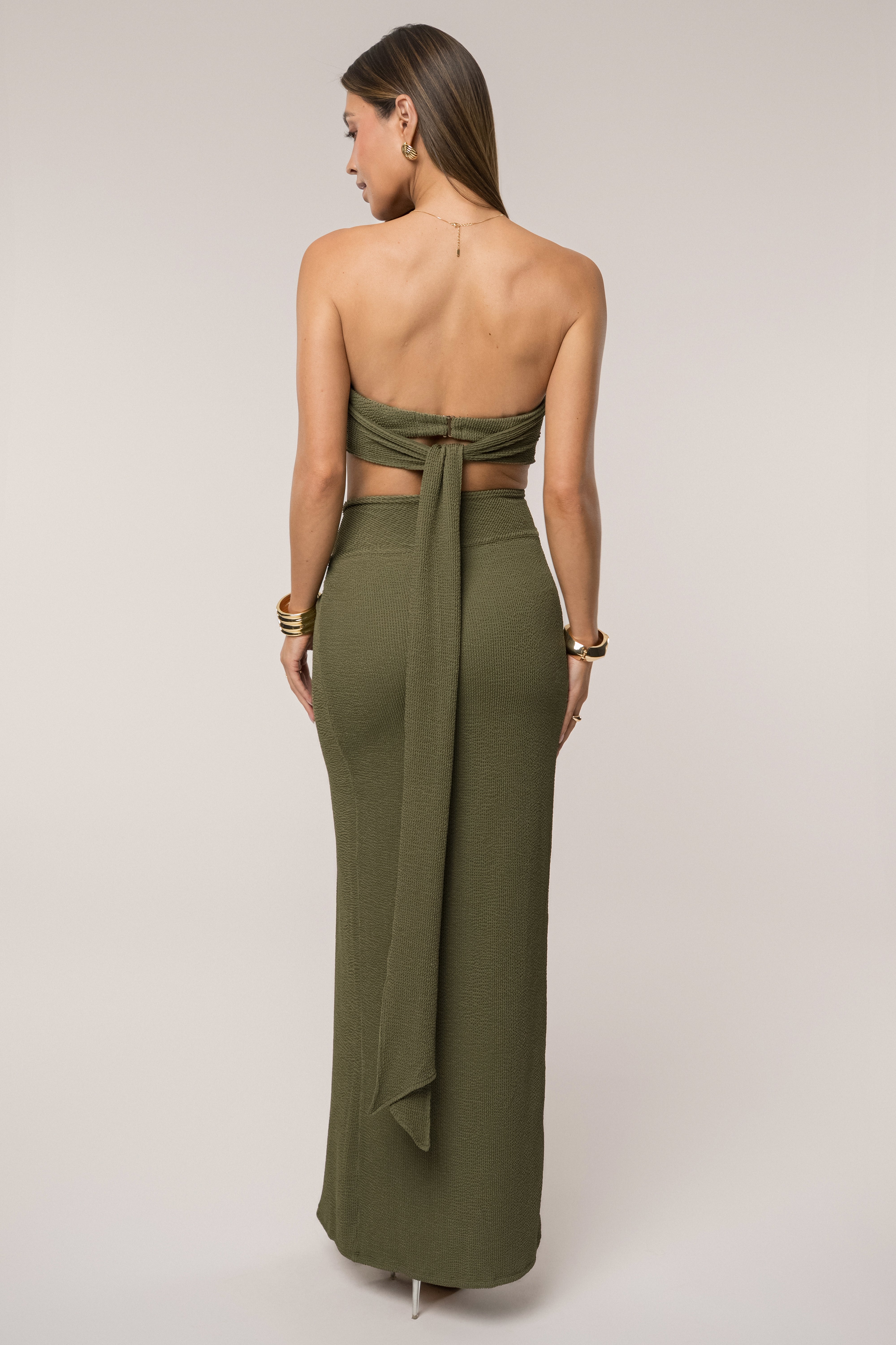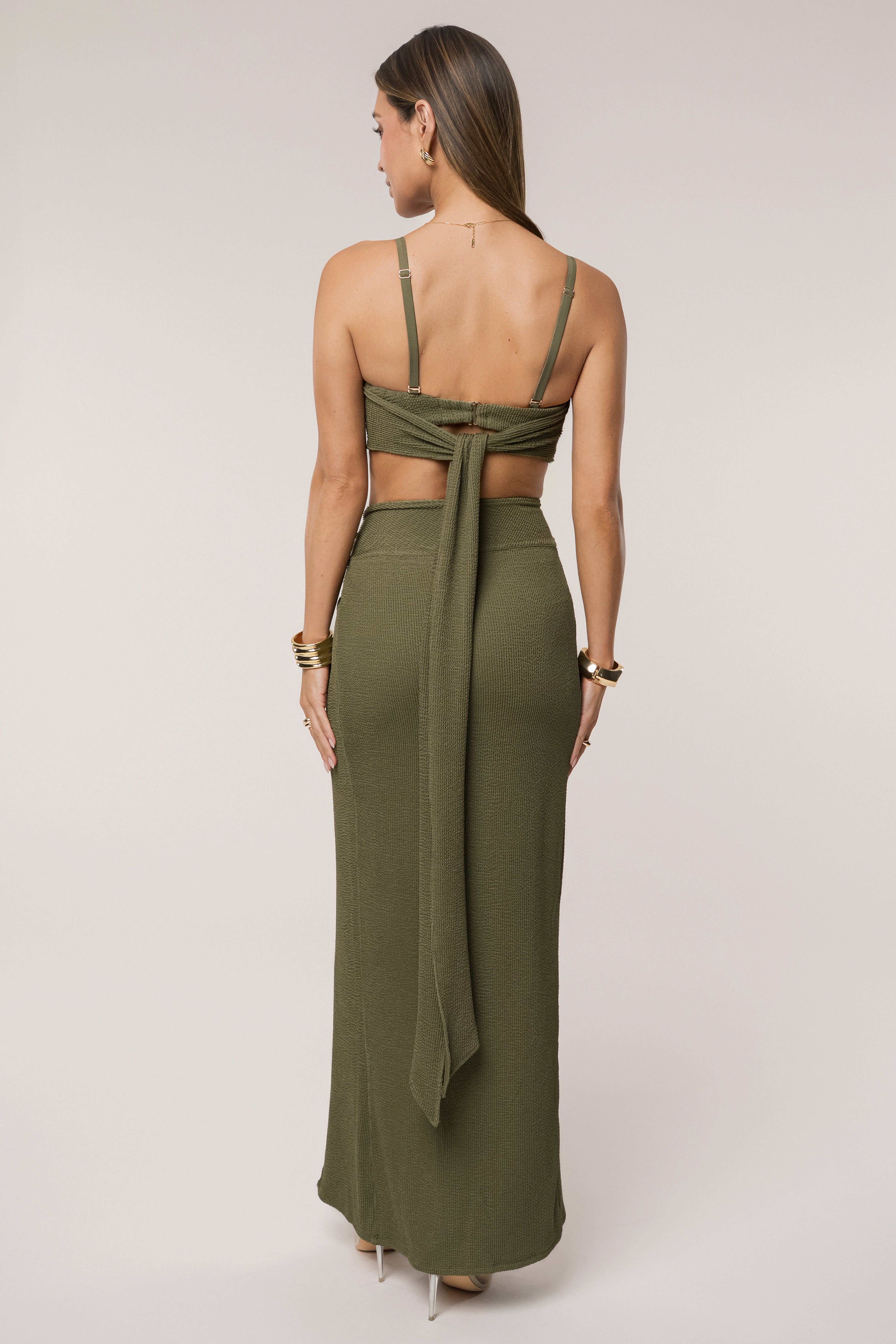 Escape to paradise in style with our Olive Deidra Draped Skirt Set. The set features a chic bralette top with adjustable/removable shoulder straps and back ties offering both comfort and style. Paired perfectly with a high-waisted wrap skirt, it showcases a dramatic slit on the right side, blending sophistication with a touch of allure. Crafted from a stretchy smocked fabric, this two piece skirt set is as versatile as it is stylish. Sold as set.