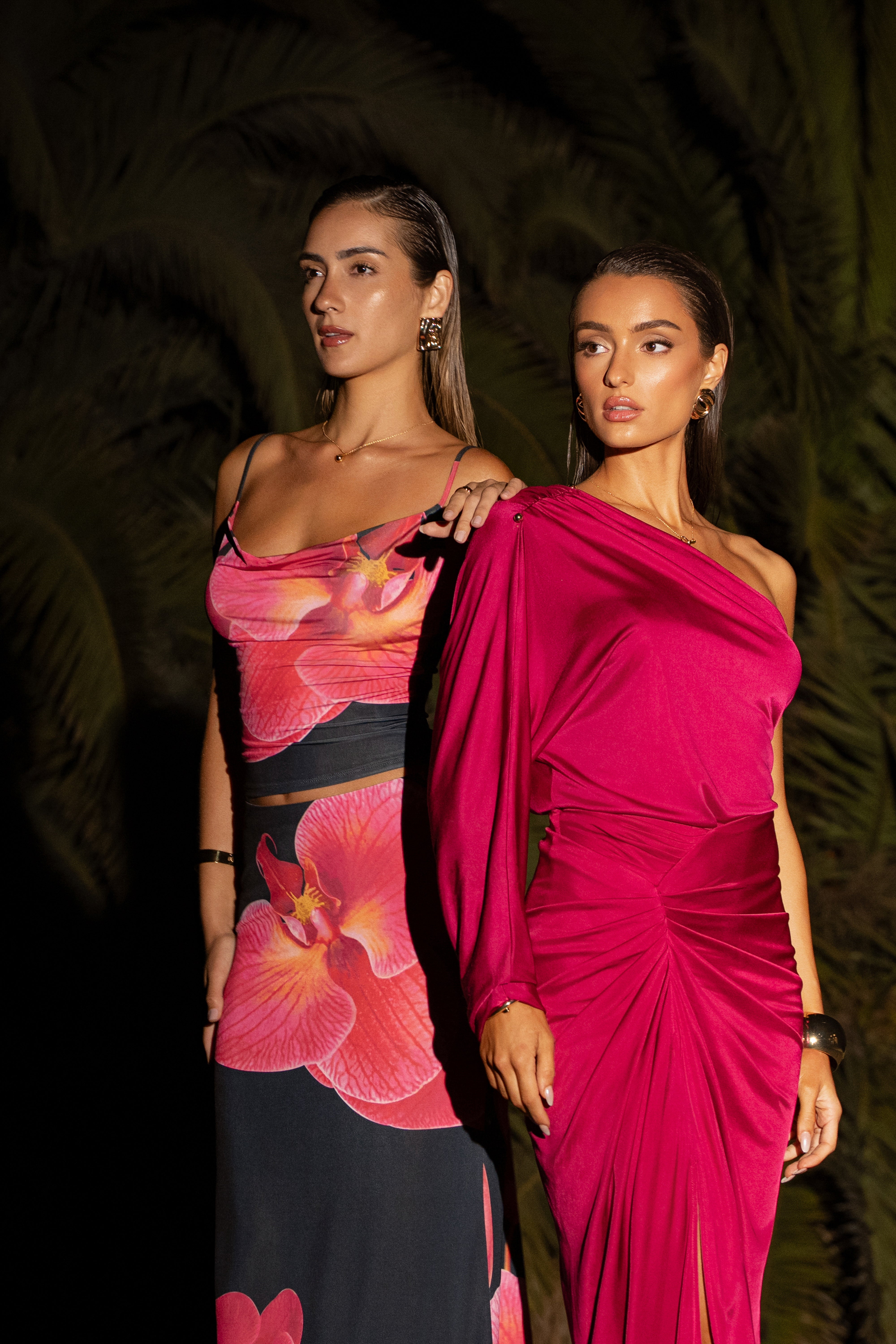 From golden hour to moonrise, our Berry One Shoulder Shirred Bodysuit is designed to make an impression. It features a one-shoulder neckline with a long sleeve and stylish shirring at the shoulder, accented by a gold-tone embellishment. Made from lightweight satin material, this piece features a stretch jersey bottom layer with double snap closure for function and comfort. Pair with our Mira Drape Maxi Skirt for the full look. Single-lined. Not sold as set.