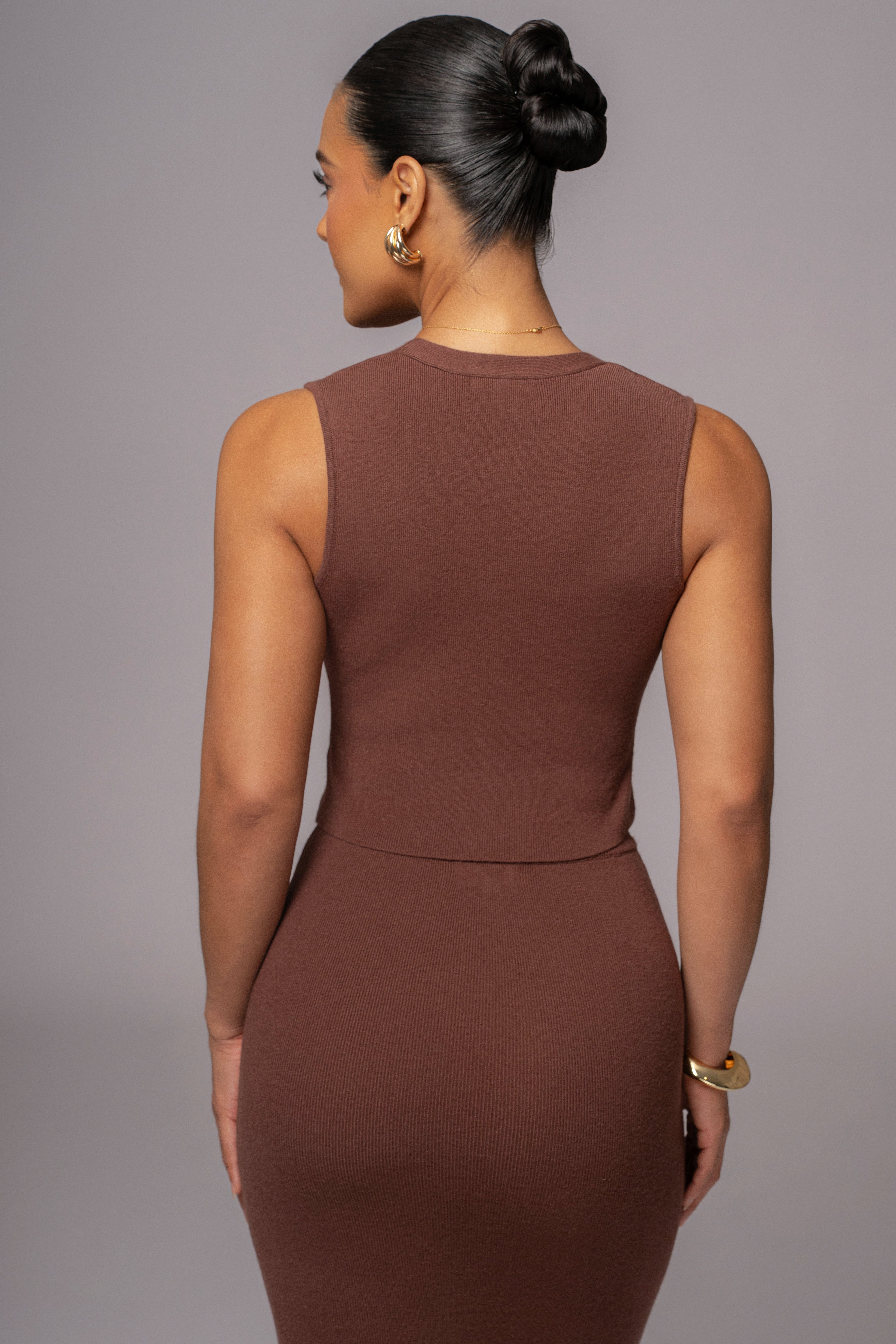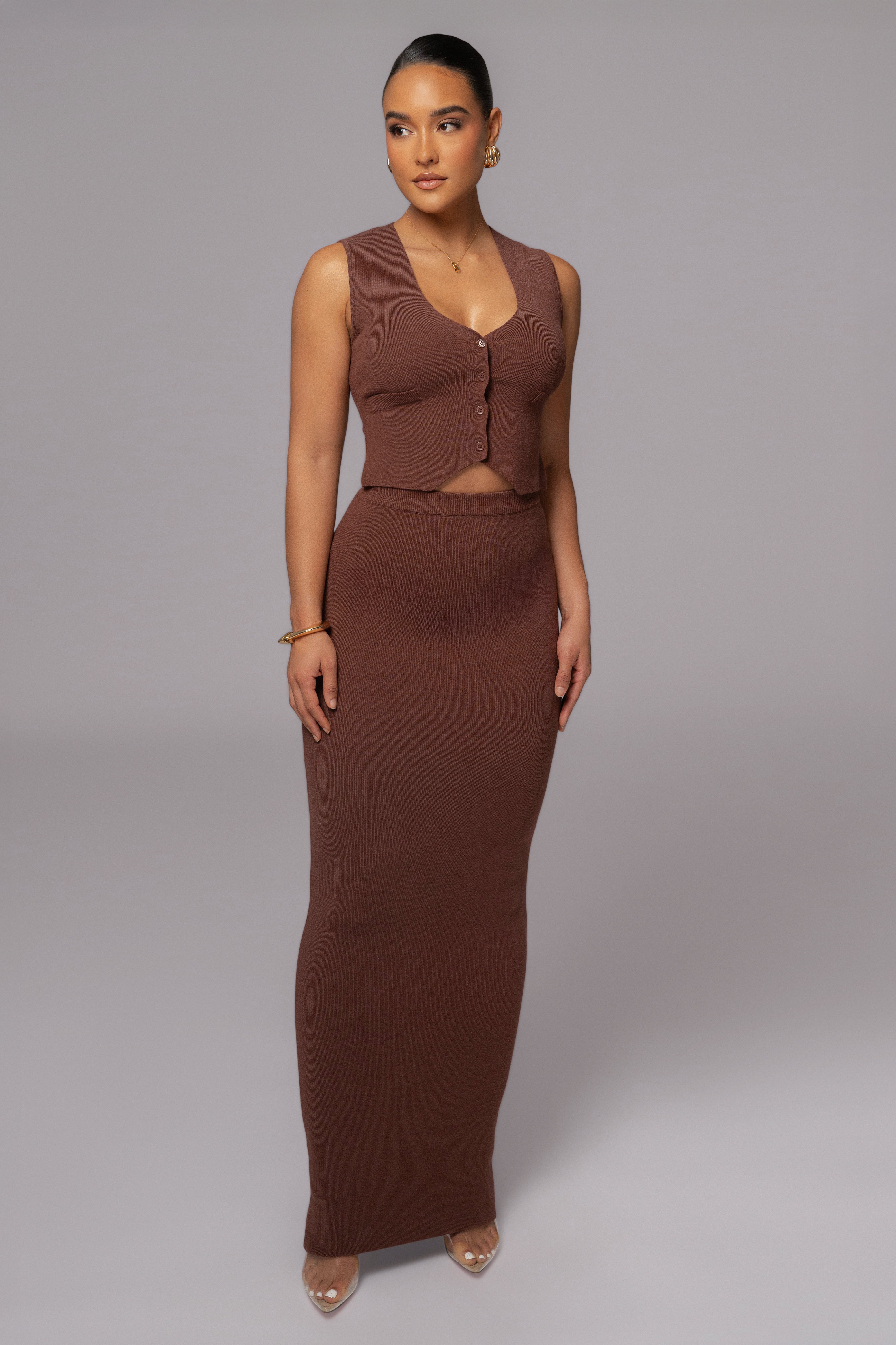 Experience the luxe touch of knitwear with our Brown Cassidy Two-Piece Skirt Set. Designed for ultimate comfort and timeless style, the sleek vest features a button-front closure that exudes understated sophistication. Paired with a matching maxi skirt, it offers a flattering form-fitting silhouette and an elastic waistband for all-day ease. Made from luxuriously soft knit material, this set blends coziness with refined design. Back slit hem. Sold as set. Stretchy.
