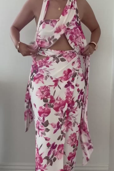 Step into a heavenly state with the Ivory Floral New Age Two Piece Skirt Set. Our most loved skirt set has been redesigned in a dreamy floral print adding a touch of nature to your wardrobe. Featuring a crossover halter top with stylish back tie closure. The matching skirt comes in a maxi hem with a thigh slit, cutout at the waist, and side zipper closure. Crafted in slinky double lined material for stretch and comfort. Stretchy. Sold as set.