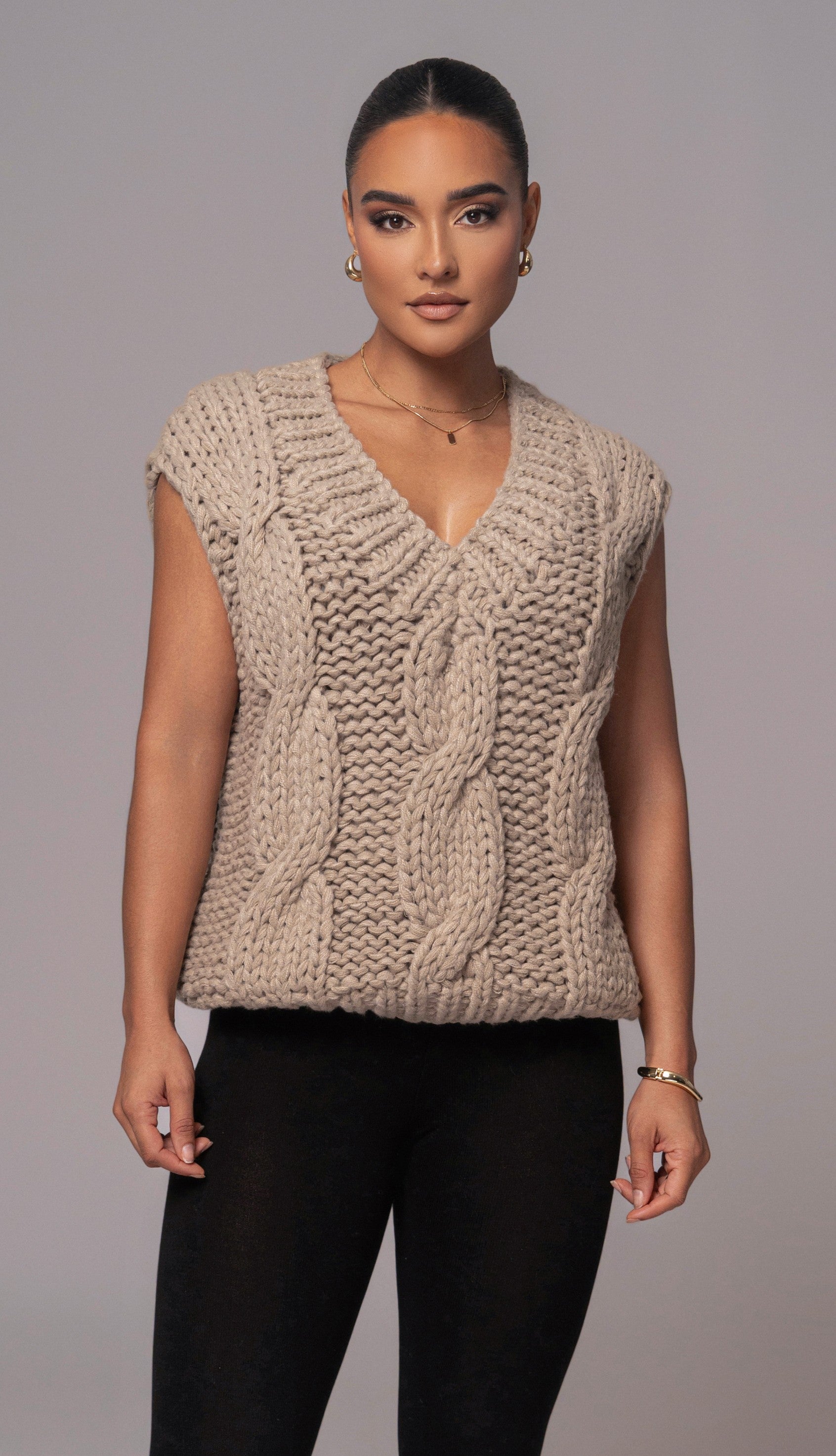 Indulge in the luxurious comfort of the Taupe Mari Cable Knit Vest. Crafted from a cozy handmade cable knit fabric, this vest features a sleeveless cut and ribbed trims, perfect for layering over your favorite outfits. Oversized. Stretchy.