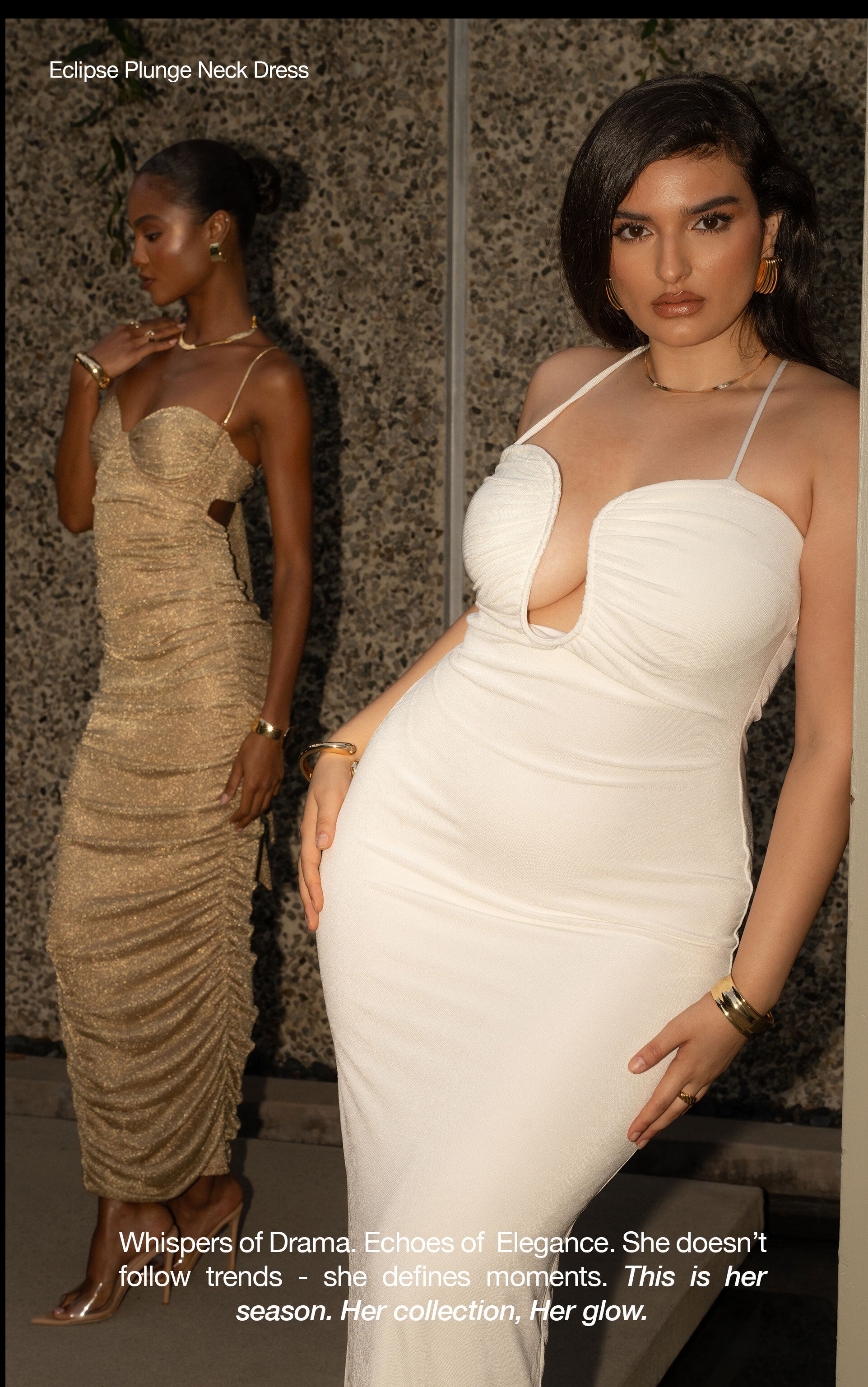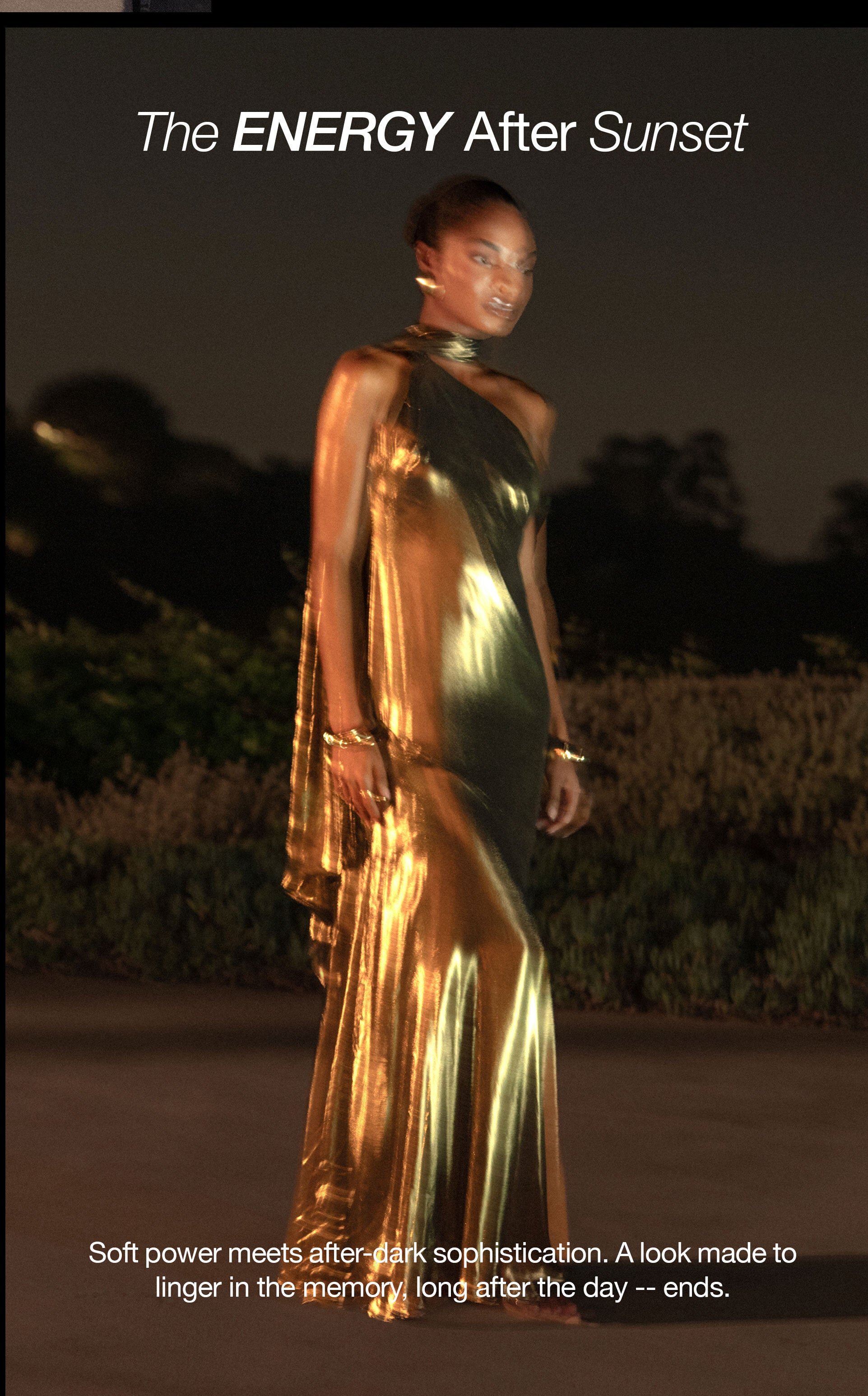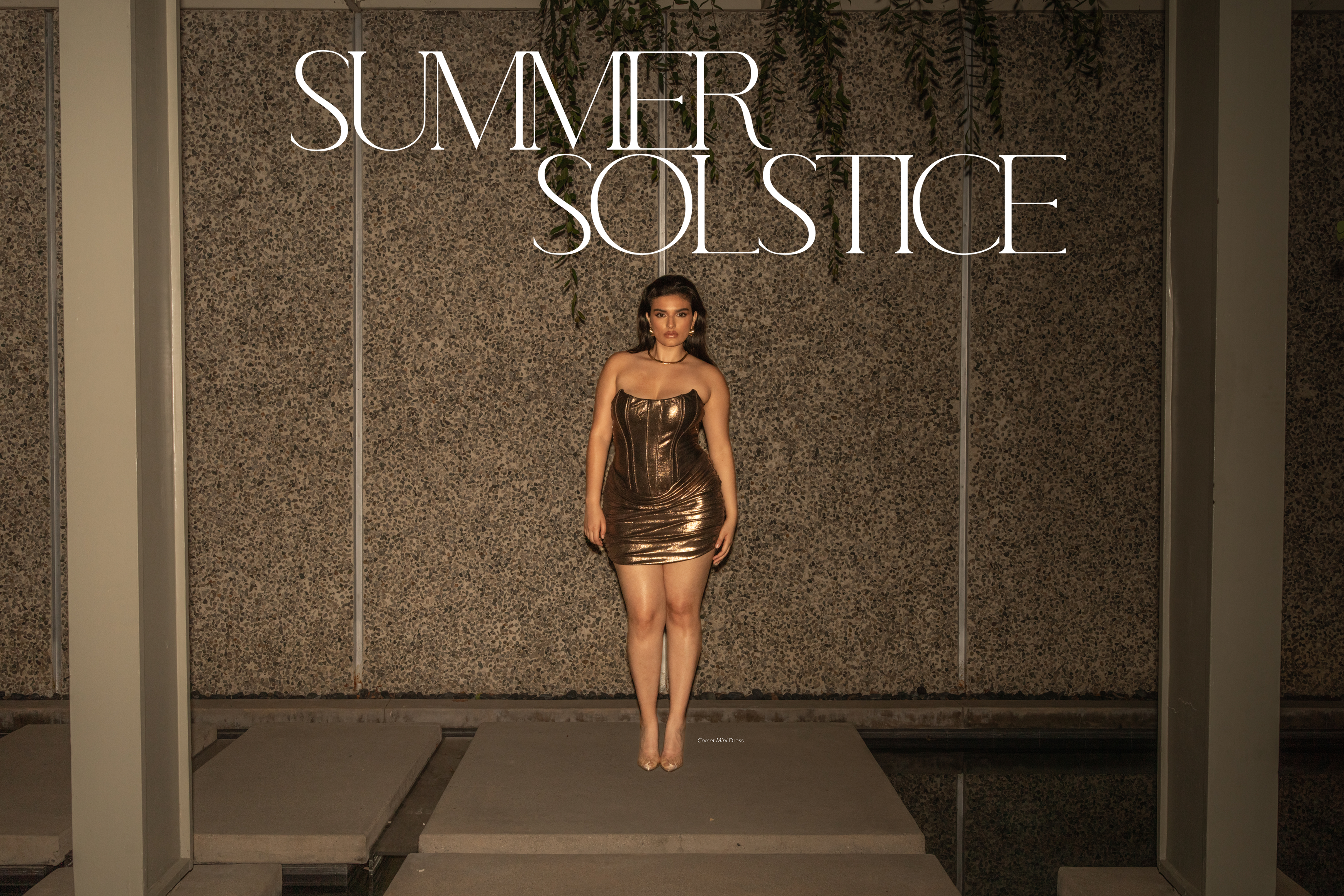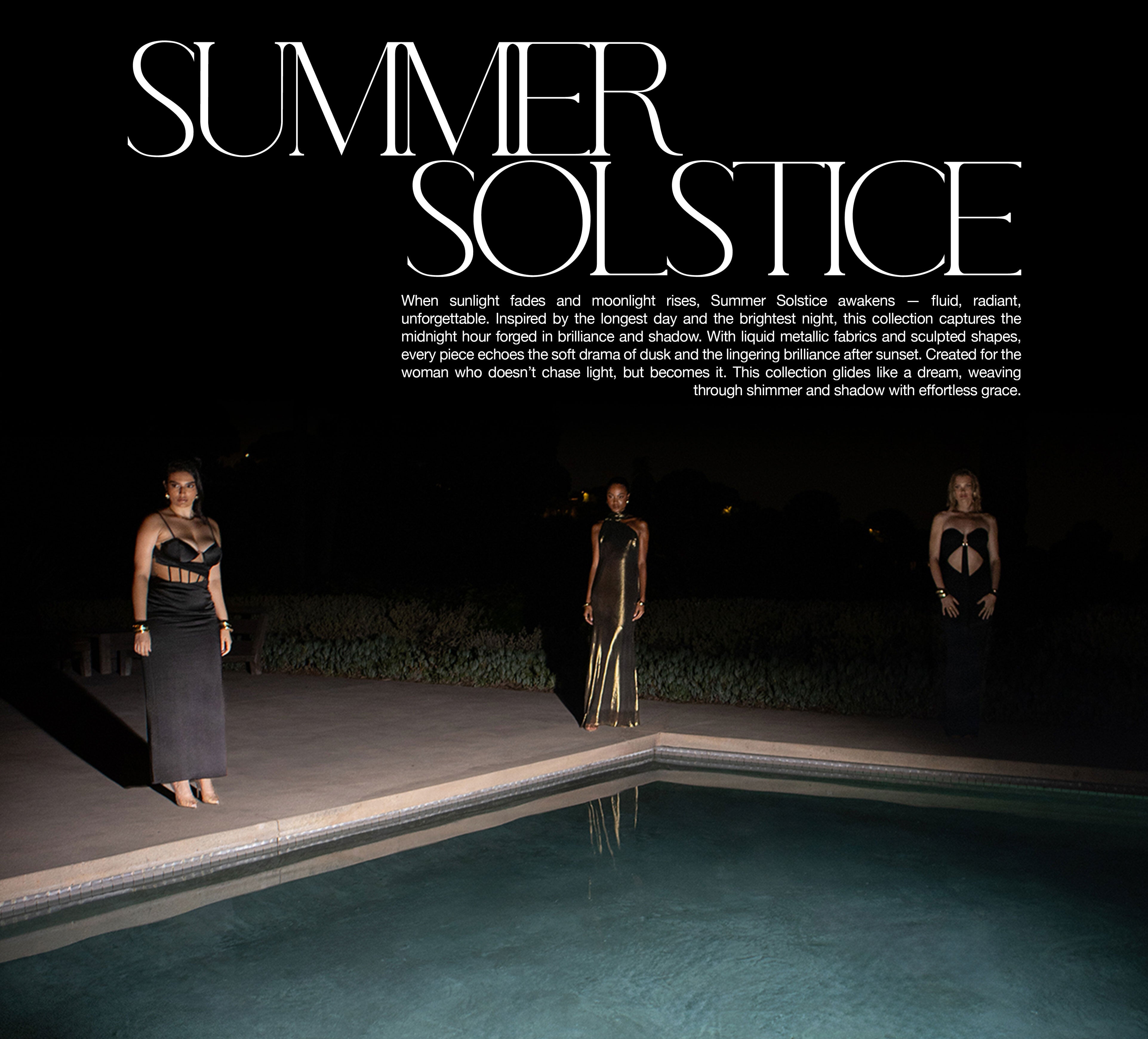 As the solstice deepens, a new light emerges with SUMMER SOLSTICE Part 2. Our next chapter evolves to honor the stillness and power of the transformation from dusk to dawn.  Shimmering textures and weightless fabrics shape a second wave of styles inspired by the balance of day to night. From dresses to swimwear and summer sets, each design explores the contrast between fluid elegance and bold structure. Created for the woman who doesn’t wait for the light—she rises to meet it.