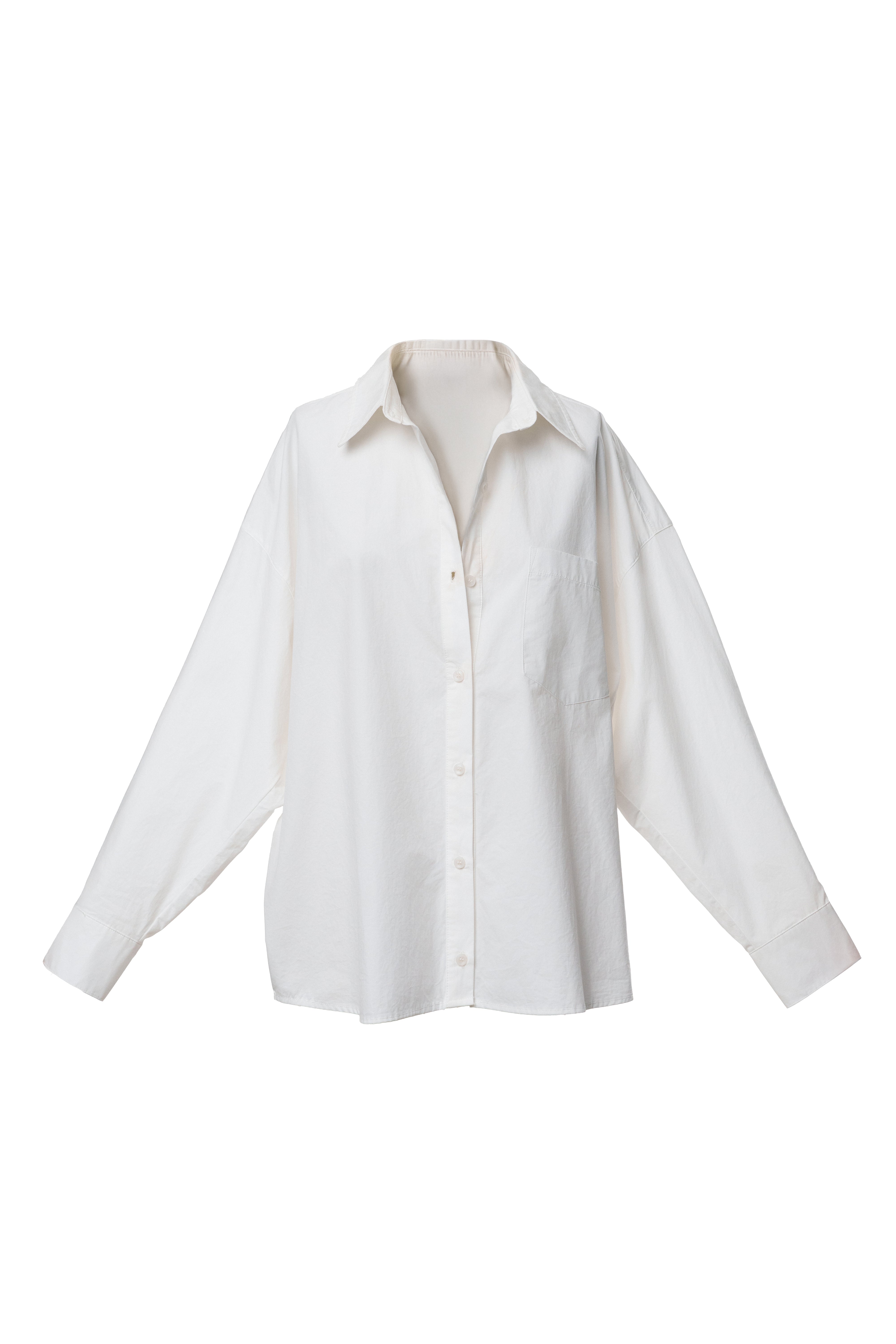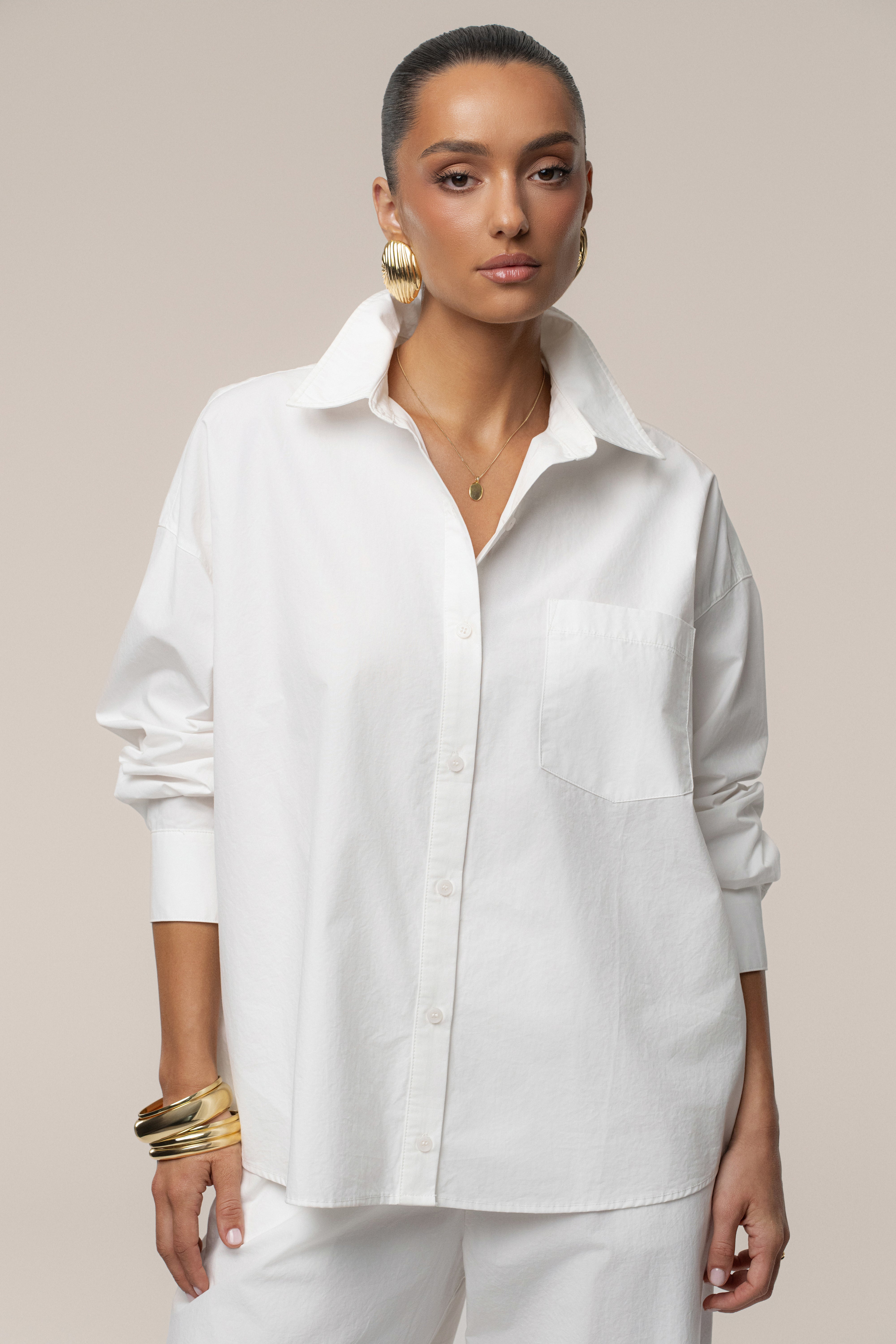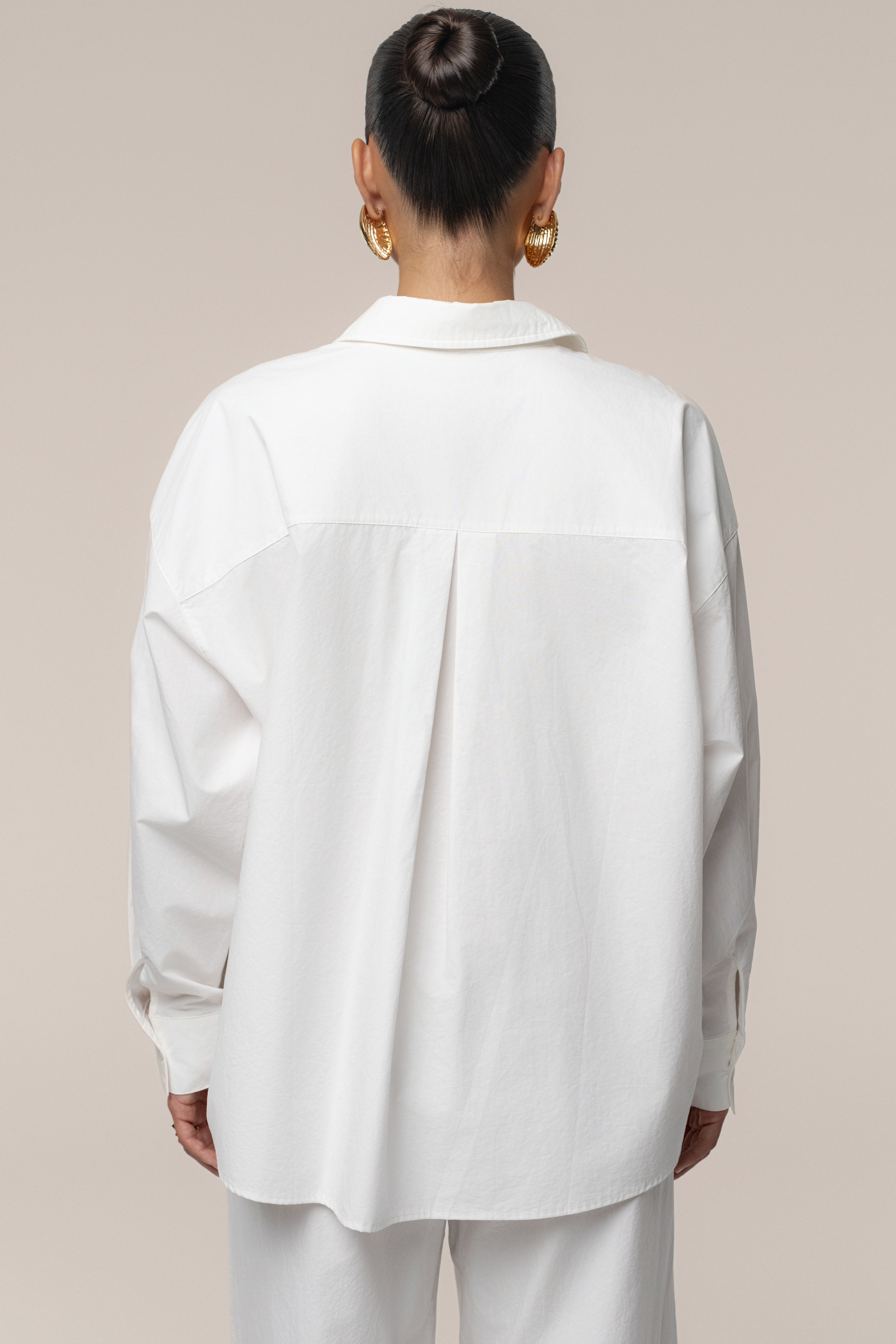 Our new Ivory Leon Poplin Shirt is a timeless essential that blends classic design with modern versatility. Crafted from lightweight fabric, this button-up features a traditional collar, chest pocket, and a relaxed, slightly oversized fit for effortless style. Lightweight and comfortable, it's ideal for both elevated occasions and everyday wear. Oversize. Single lined. Not sold as set.