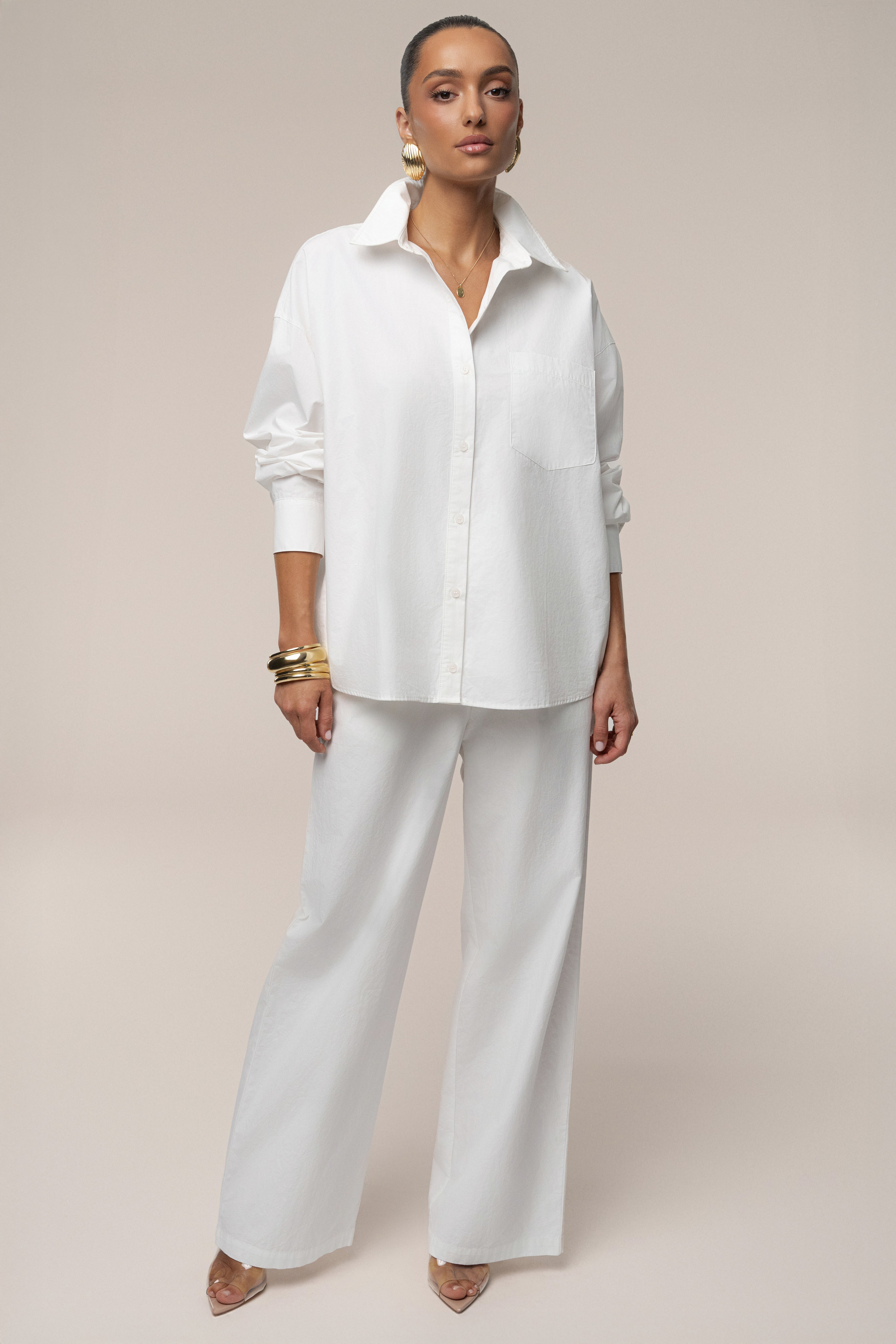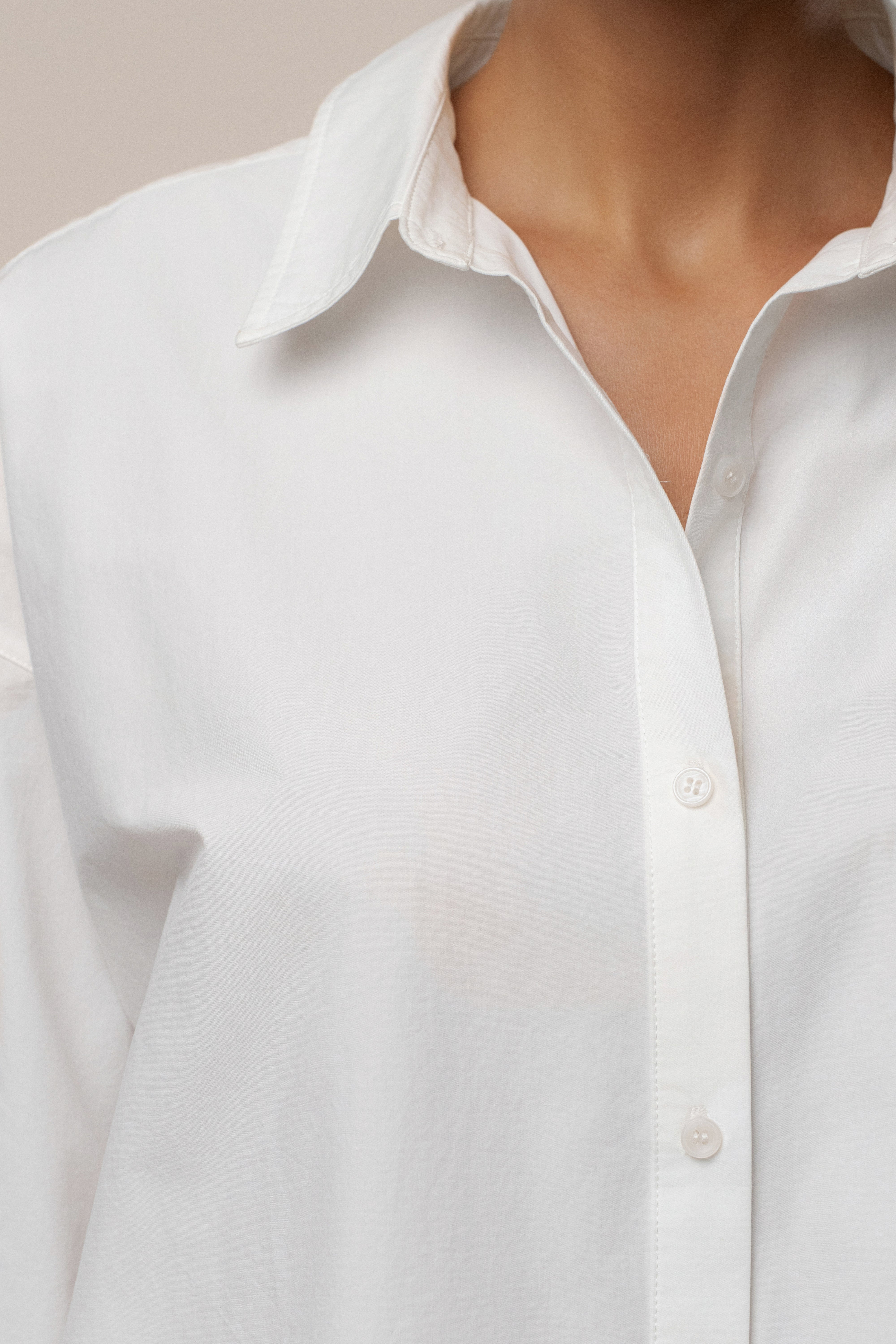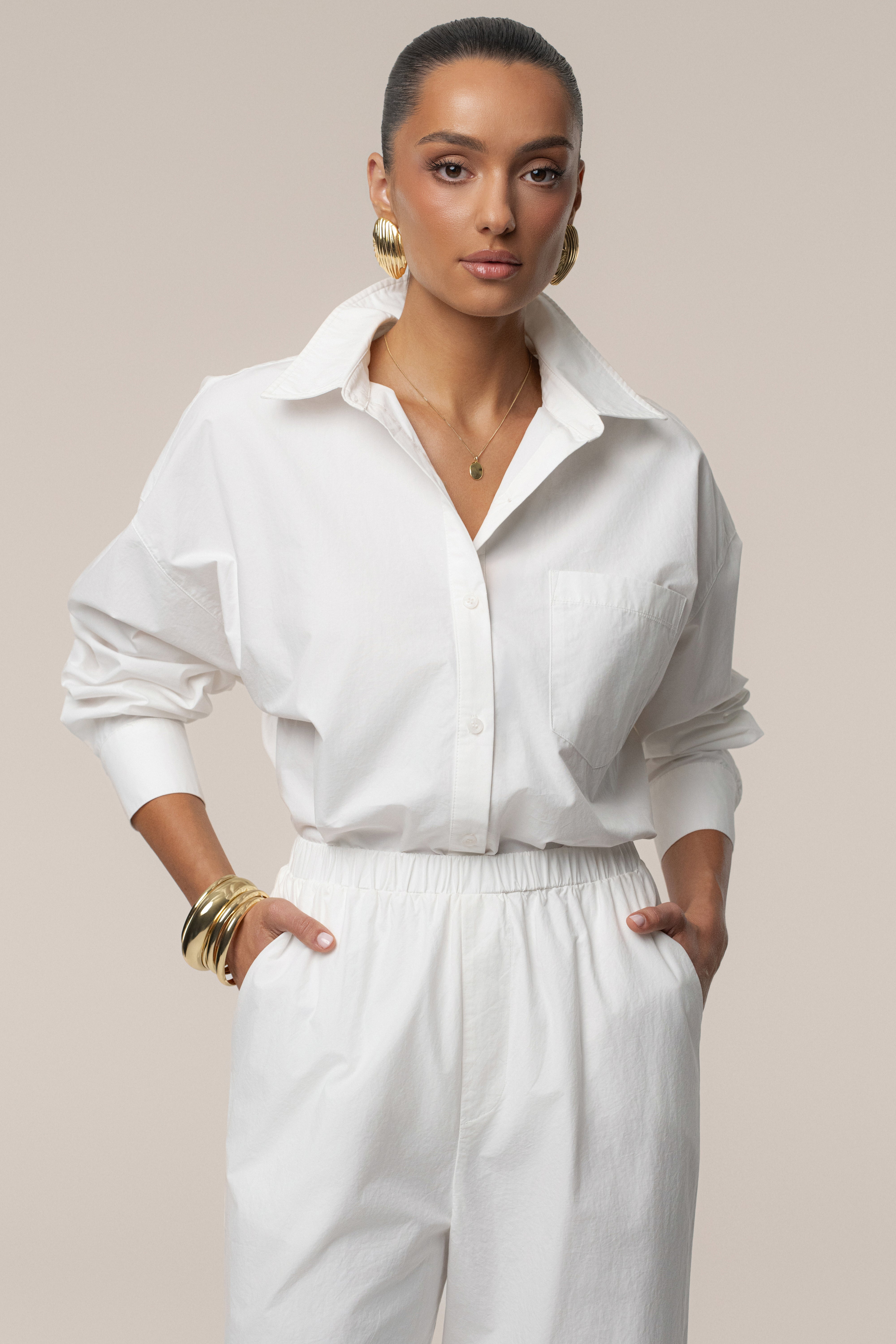 Our new Ivory Leon Poplin Shirt is a timeless essential that blends classic design with modern versatility. Crafted from lightweight fabric, this button-up features a traditional collar, chest pocket, and a relaxed, slightly oversized fit for effortless style. Lightweight and comfortable, it's ideal for both elevated occasions and everyday wear. Oversize. Single lined. Not sold as set.
