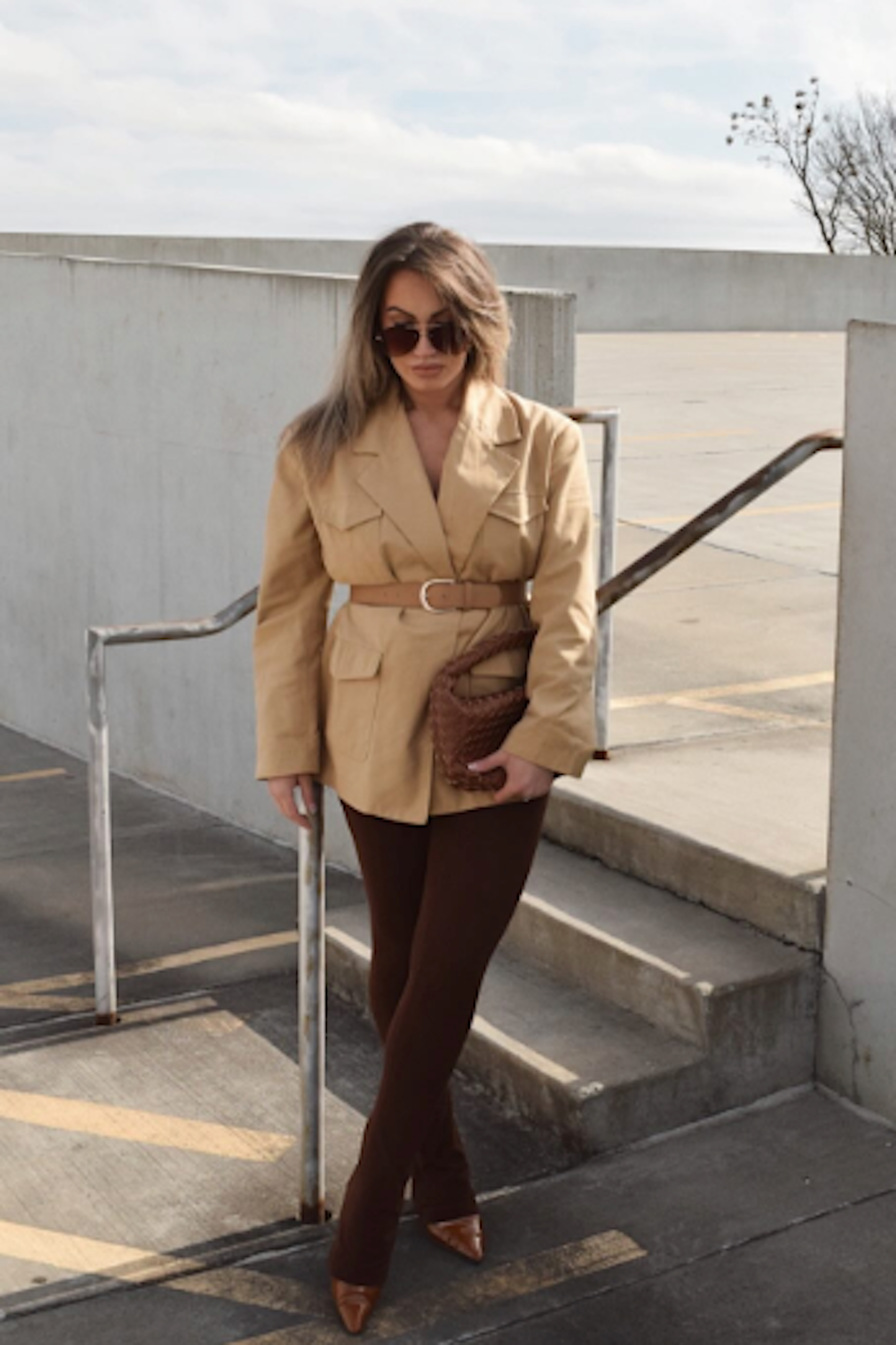 Power up your wardrobe with our Tan Precision Woven Blazer, a modern masterpiece of tailored sophistication. Designed with wide lapels, a single-breasted front with one-button closure, spacious front pockets, and a cinched waist accentuated by a contrasting belt. Perfect for any occasion, this oversized blazer offers a structured silhouette that blends elegance with versatility. Pair with our Belted Cargo Shorts for the full look. Minimal stretch. Lined interior.