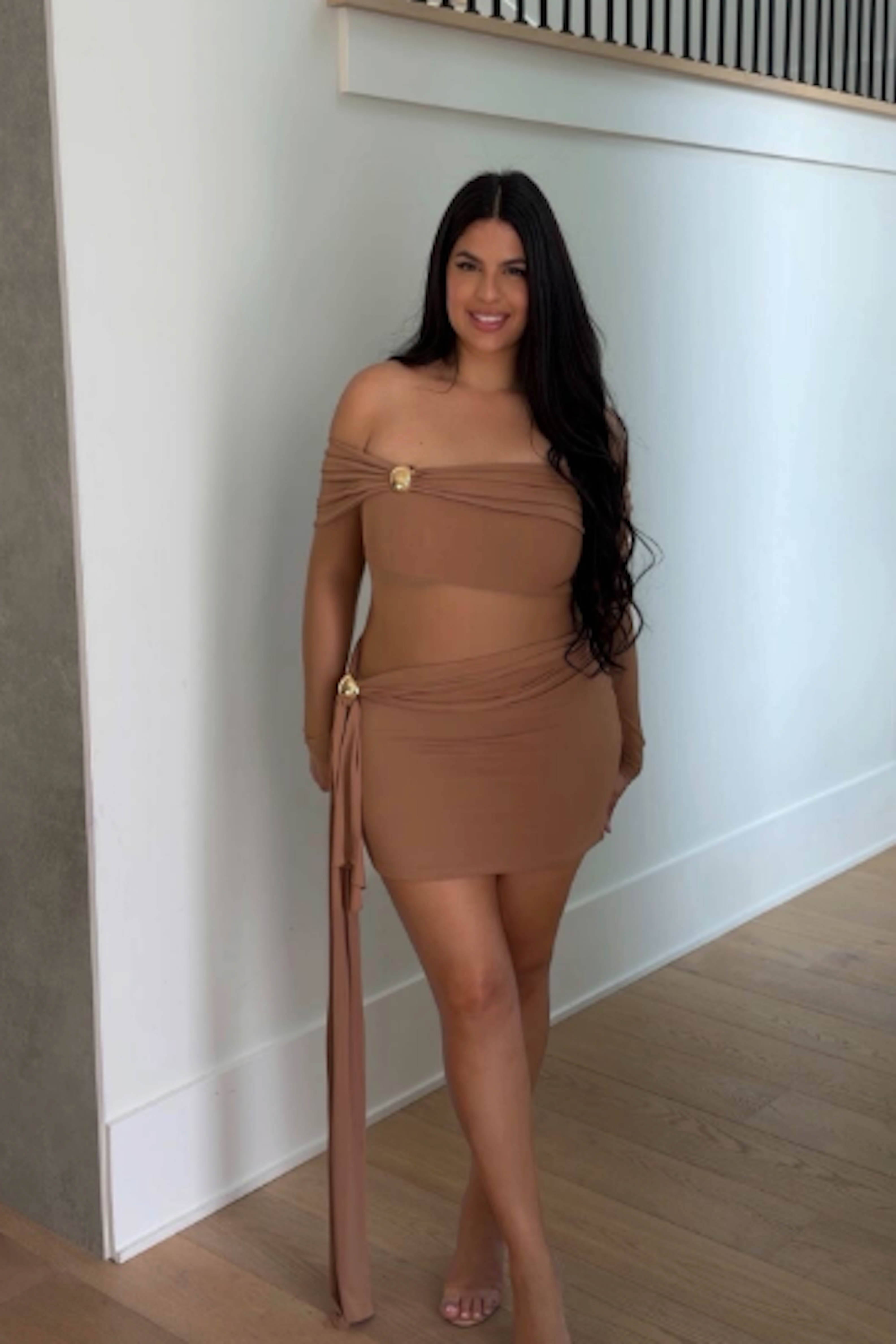 Our Beige Glow State Drape Dress is a stunning off-the-shoulder mini dress that exudes modern elegance. Crafted from a smooth double-lined fabric, it features long, fitted sleeves and a sheer panel at the mid-torso for a touch of appeal. Its standout detail is its asymmetric draped fabric, secured with gold-tone embellishments, creating a flowing, eye-catching silhouette. Perfect for cocktail parties or evening events. Stretchy.