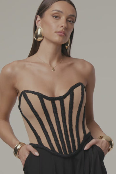 Texture takes center stage in our Black Cassis Braided Corset—a bold blend of structure and elegance. This strapless tan corset features a sweetheart neckline and vertical boning, accentuated by intricate braided trim for added depth and sophistication. Finished with a lace-up back for an adjustable fit, it’s designed to sculpt the waist and deliver a flattering, timeless silhouette. Pair with our Summer Ease Wide Leg Pants for the full look. Bra padding. Minimal stretch.