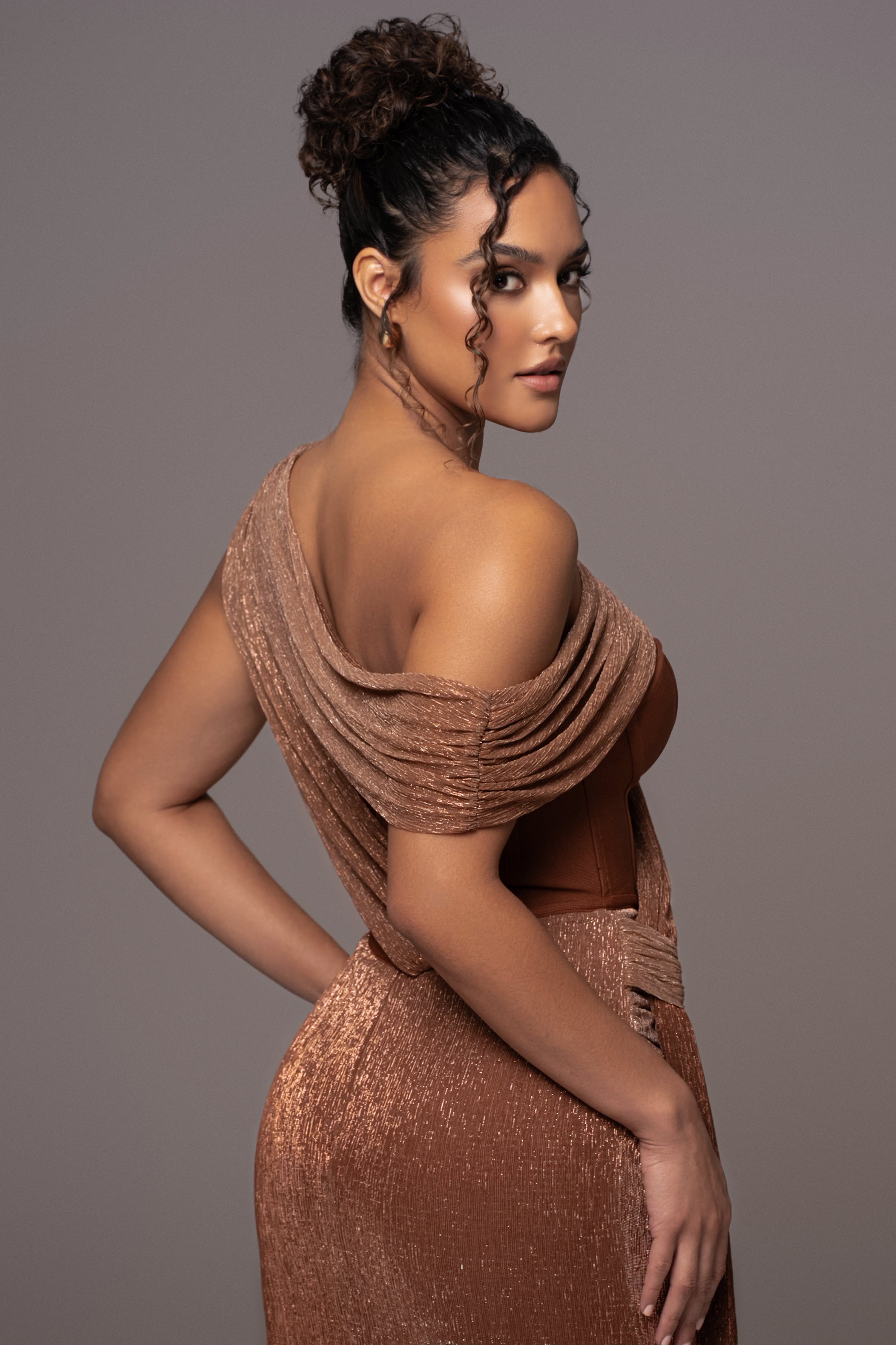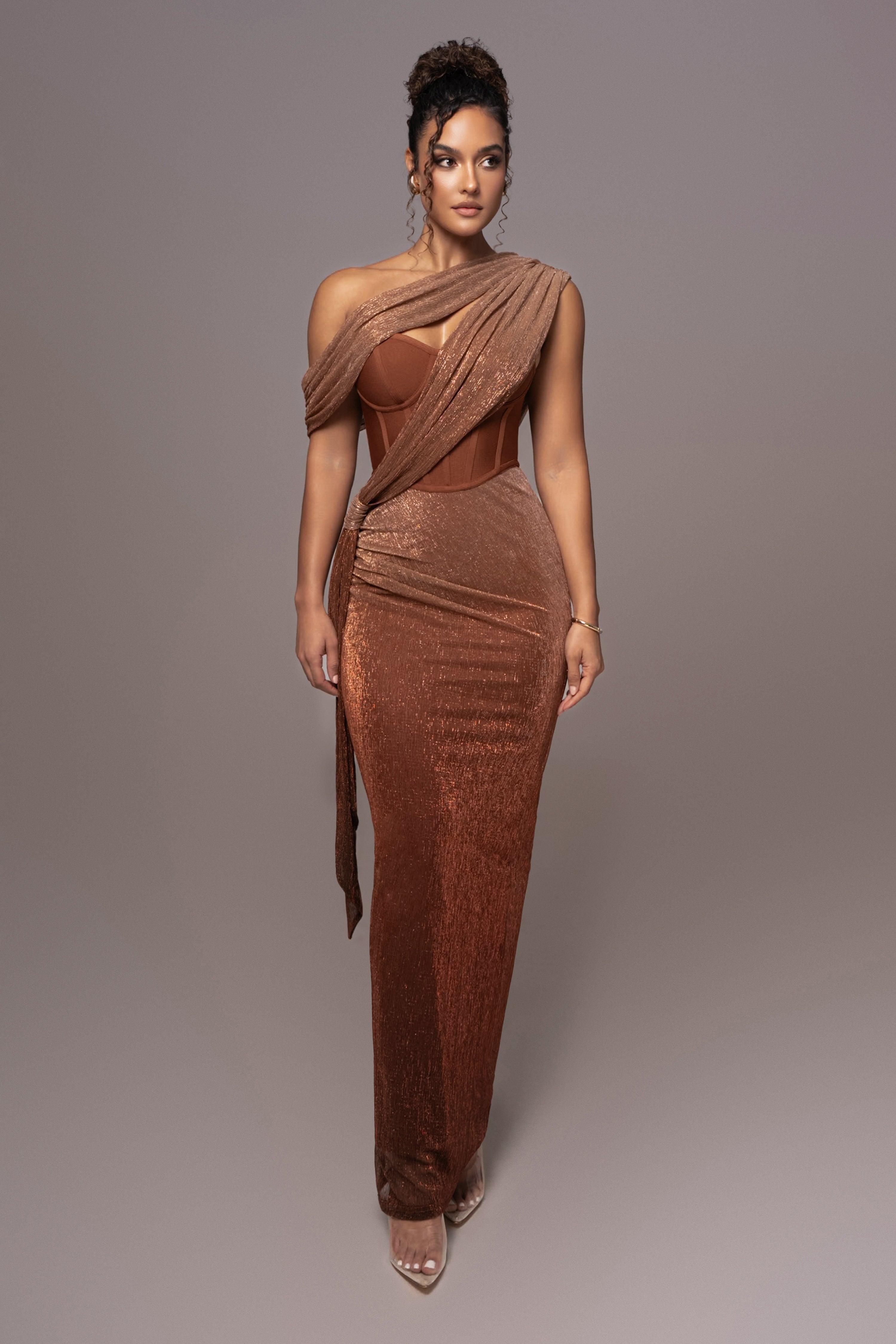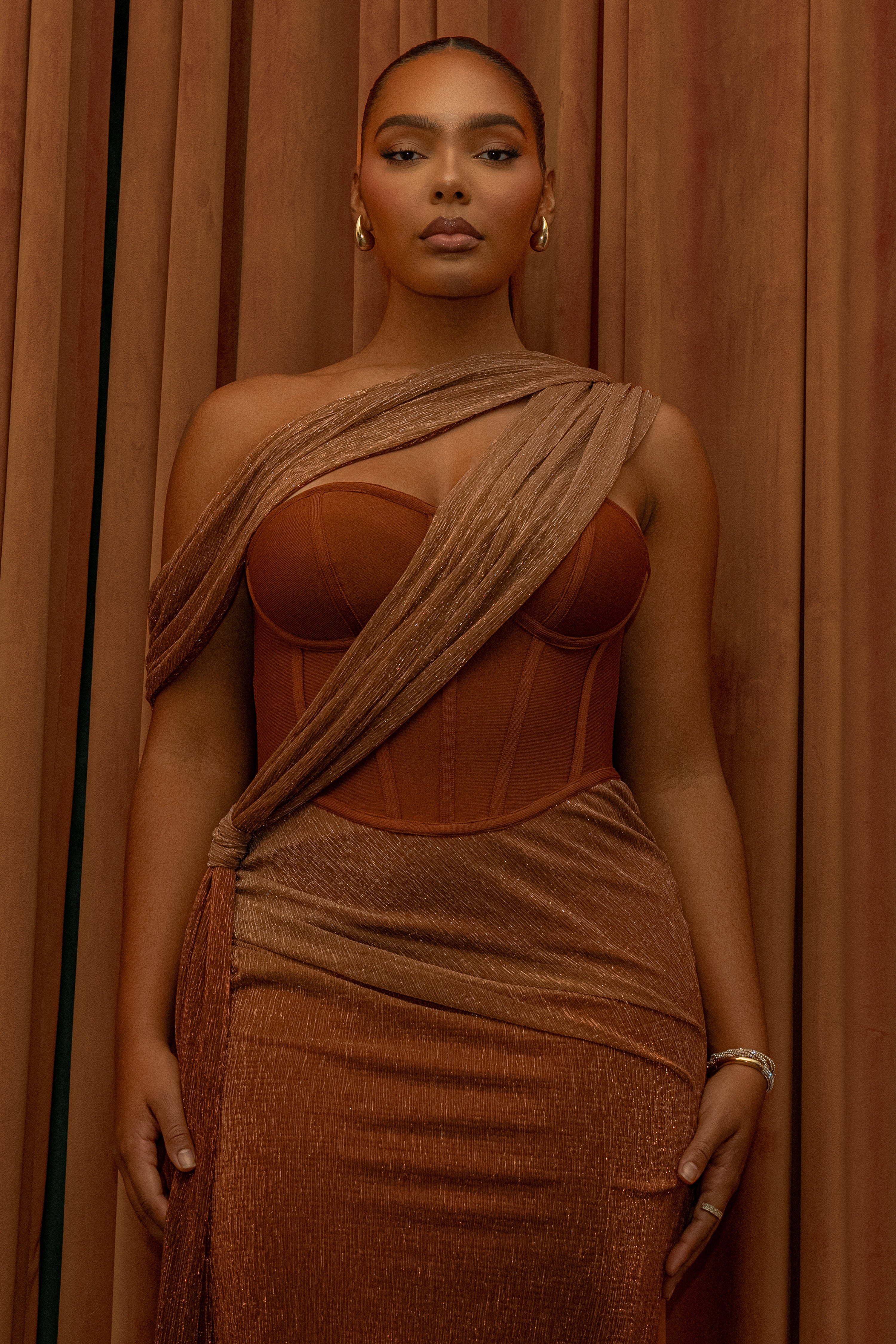 The Gold Celestina Draped Maxi Dress will take your breath away in a dreamy draped neckline with corset design and graceful waist drape. Crafted in a stunning mix of bandage and lightweight shimmering fabric, this maxi dress is complete with an adjustable shoulder strap, cup padding, and boning on each side for structure. Back zipper closure. Stretchy. Double lined.