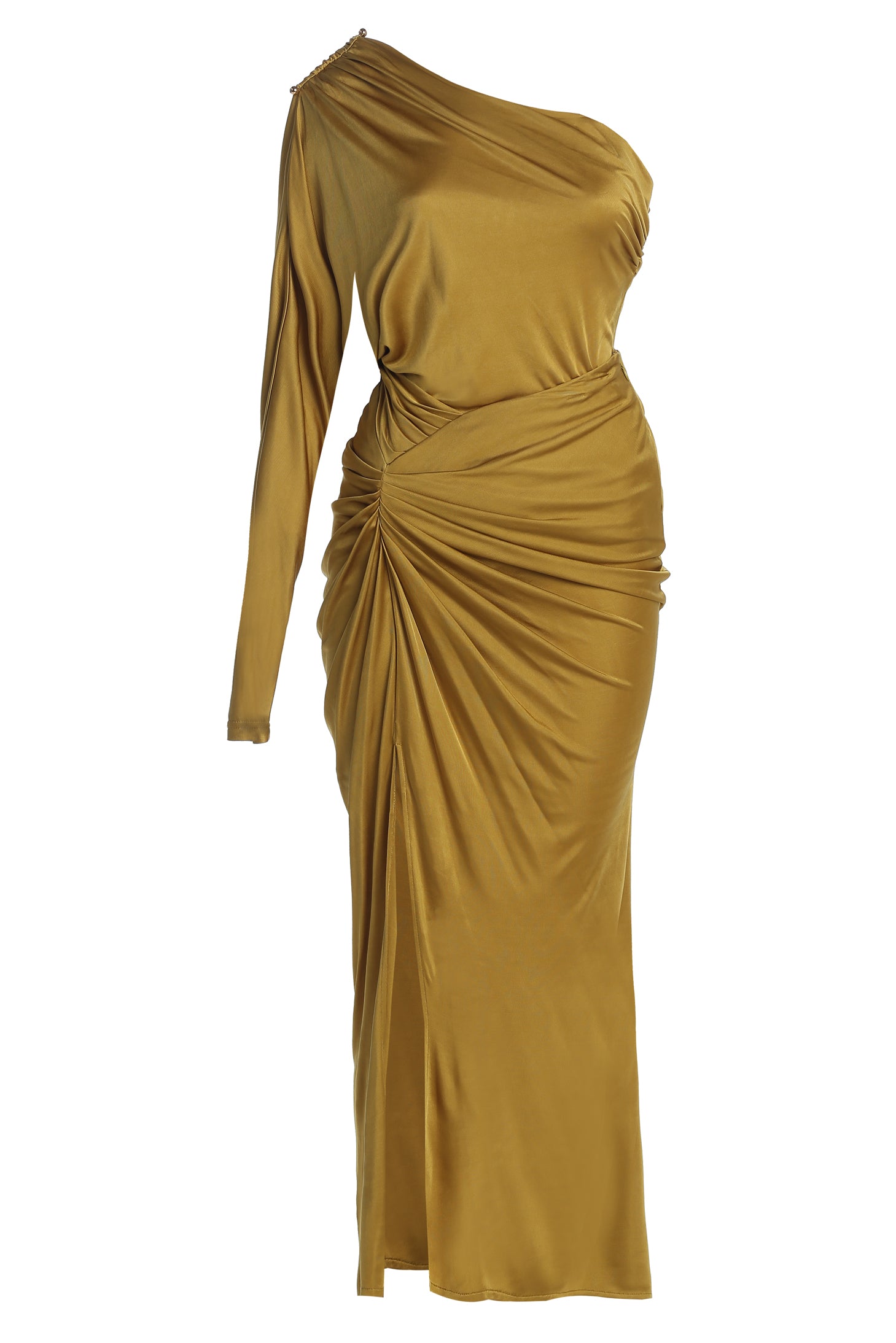 From golden hour to moonrise, our Lime One Shoulder Shirred Bodysuit is designed to make an impression. It features a one-shoulder neckline with a long sleeve and stylish shirring at the shoulder, accented by a gold-tone embellishment. Made from lightweight satin material, this piece features a stretch jersey bottom layer with double snap closure for function and comfort. Pair with our Mira Drape Maxi Skirt for the full look. Single-lined. Not sold as set.