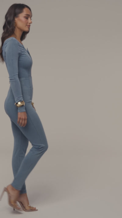 Denim takes a modern twist in our Medium Wash Button Me Up Bodysuit. Designed with an asymmetrical neckline and a single long sleeve, this unique piece features an edgy front zipper closure accented by a button detail and decorative belt loops at the bust. Finished with a thong-cut bottom and double snap closure for a seamless, comfortable fit. Minimal stretch.