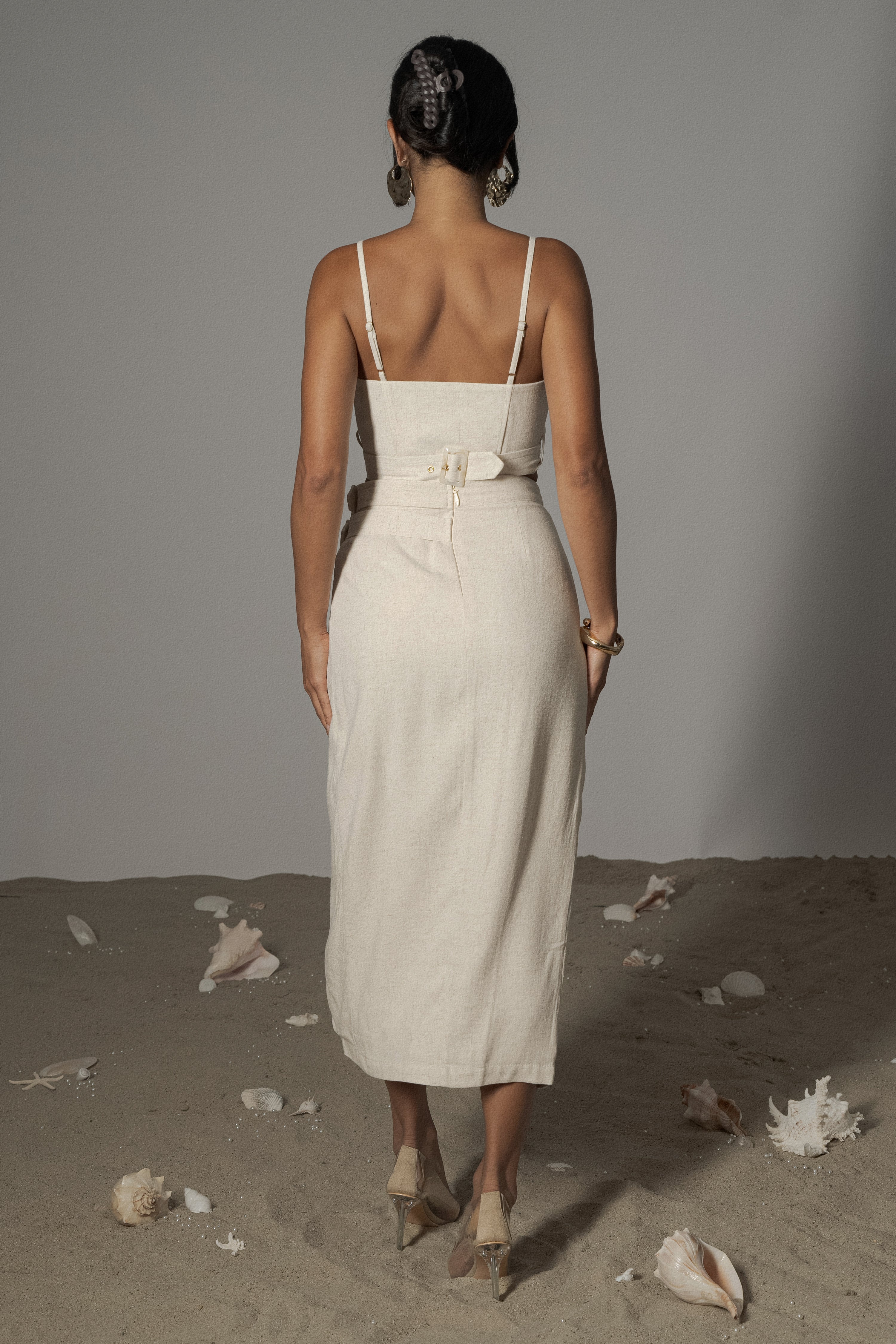 Our Natural Sunrise Linen Bustier is perfect for summertime. Made from a lightweight linen blend, this modern crop top features a low v neckline with thin adjustable shoulder straps and a stunning front belt-buckle detail in marbled acrylic. Complete with front/back boning for a structured fit. Pair with our Gisele Linen Slit Skirt for the full look. Double-lined. No stretch.