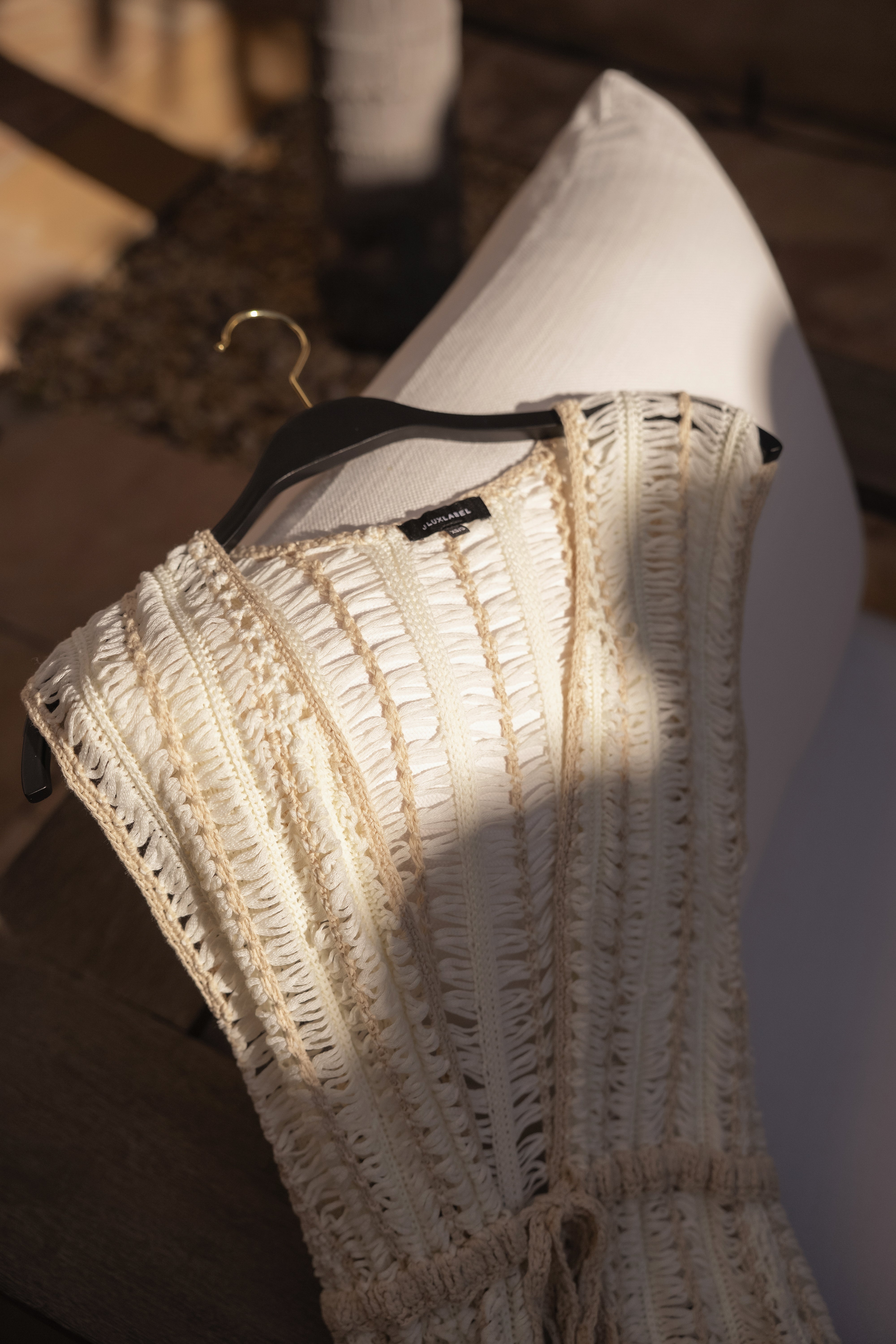 Plongez dans les textures côtières avec notre robe maxi en crochet Marcelle ivoire/beige. Ce cardigan à ouverture frontale présente un design rayé inspiré du crochet, confectionné en tissu tricoté léger. Une ceinture à cordon nouée à la taille met en valeur votre silhouette, tandis que les deux poches avant ajoutent à la fois fonctionnalité et charme. Que ce soit porté sur des robes décontractées ou associé à vos tenues d'été préférées. Extensible.