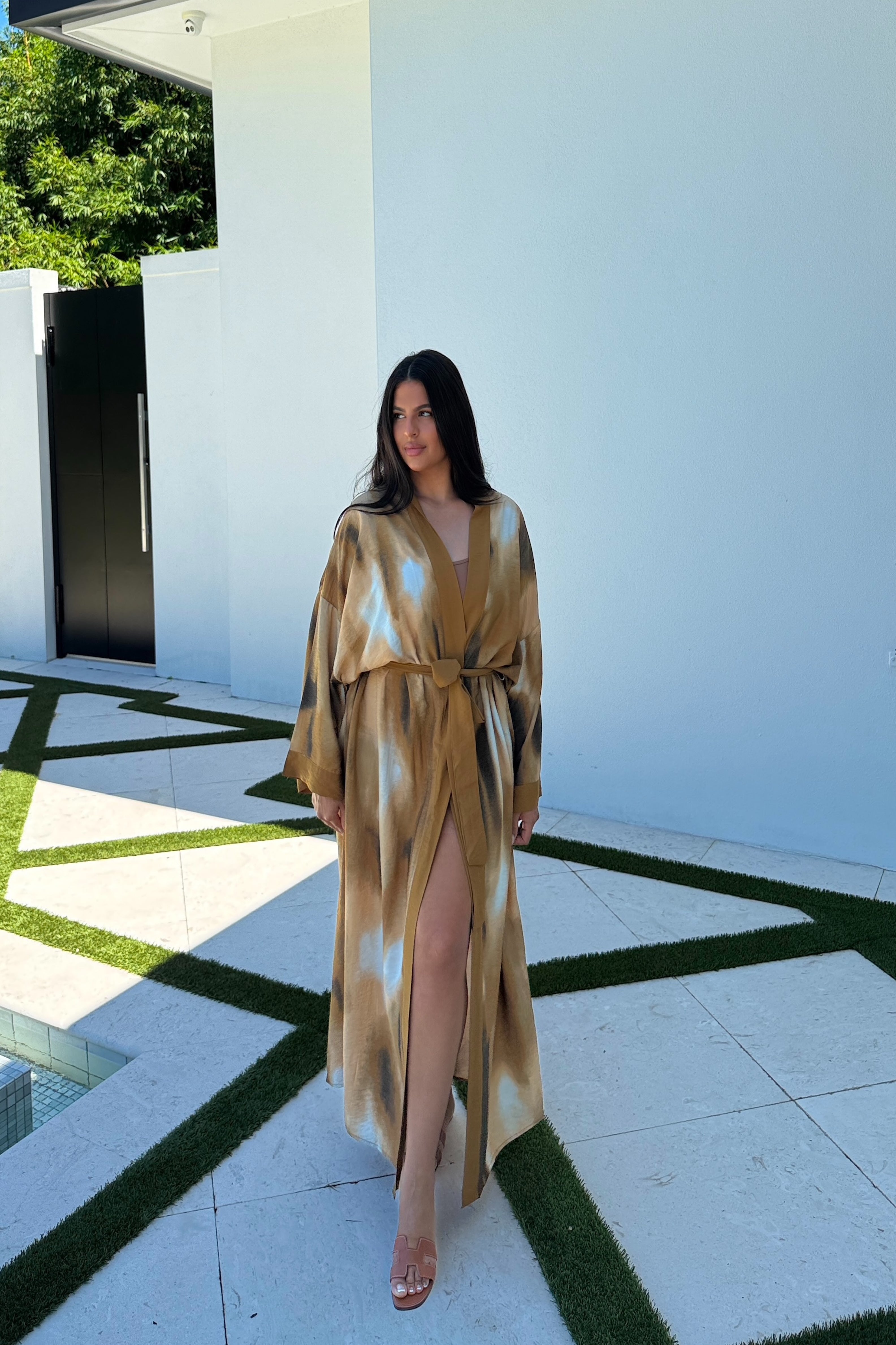 Laissez-vous emporter par l'envie de voyager avec le Duster Oasis du Désert Marron, une couche maxi luxueuse qui allie confort et sophistication. Confectionné dans un tissu léger froissé, il présente un imprimé inspiré de l'aquarelle aux tons terreux. Conçu avec une ceinture assortie à la taille pour une silhouette définie, un large col châle et des manches cloche bordées d'olive uni pour un contraste saisissant. Doublure simple. Sans élasticité.