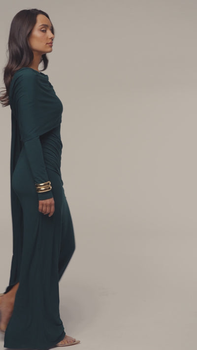 Notre robe maxi asymétrique Emerald Glitz est un mélange d'élégance et de design moderne. Confectionnée dans un tissu doux doublé, cette robe maxi présente un décolleté asymétrique unique qui tombe gracieusement sur les épaules. Sa silhouette moulante est mise en valeur par un froncé délicat le long de la taille, créant une finition flatteuse et sophistiquée. Un tissu drapé dramatique descend de l'épaule gauche dans le dos, ajoutant une touche de glamour et de mouvement. Fermeture éclair au dos. Extensible.
