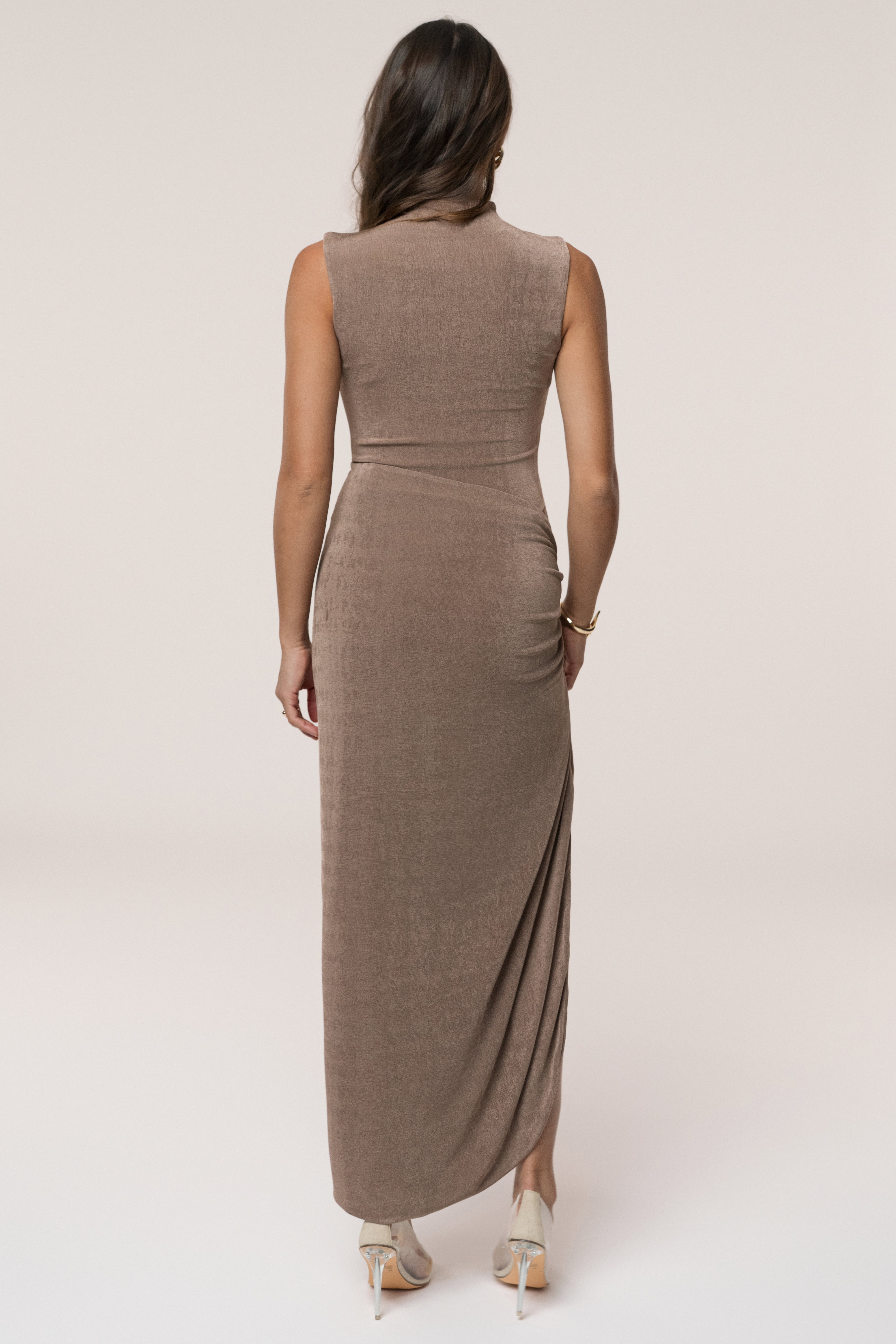 Faites de cette nuit un moment inoubliable avec notre robe midi Mocha Aubree. Cette robe combinée séduisante comprend un body sans manches avec un col montant et un dos string avec des fermetures à pression au bas. Attachée vers la taille basse, une jupe portefeuille se noue sur un côté pour créer un détail noué avec une fente élégante. Conçue dans un tissu luxueux et fluide pour une touche d'élégance. Double doublure. Extensible.