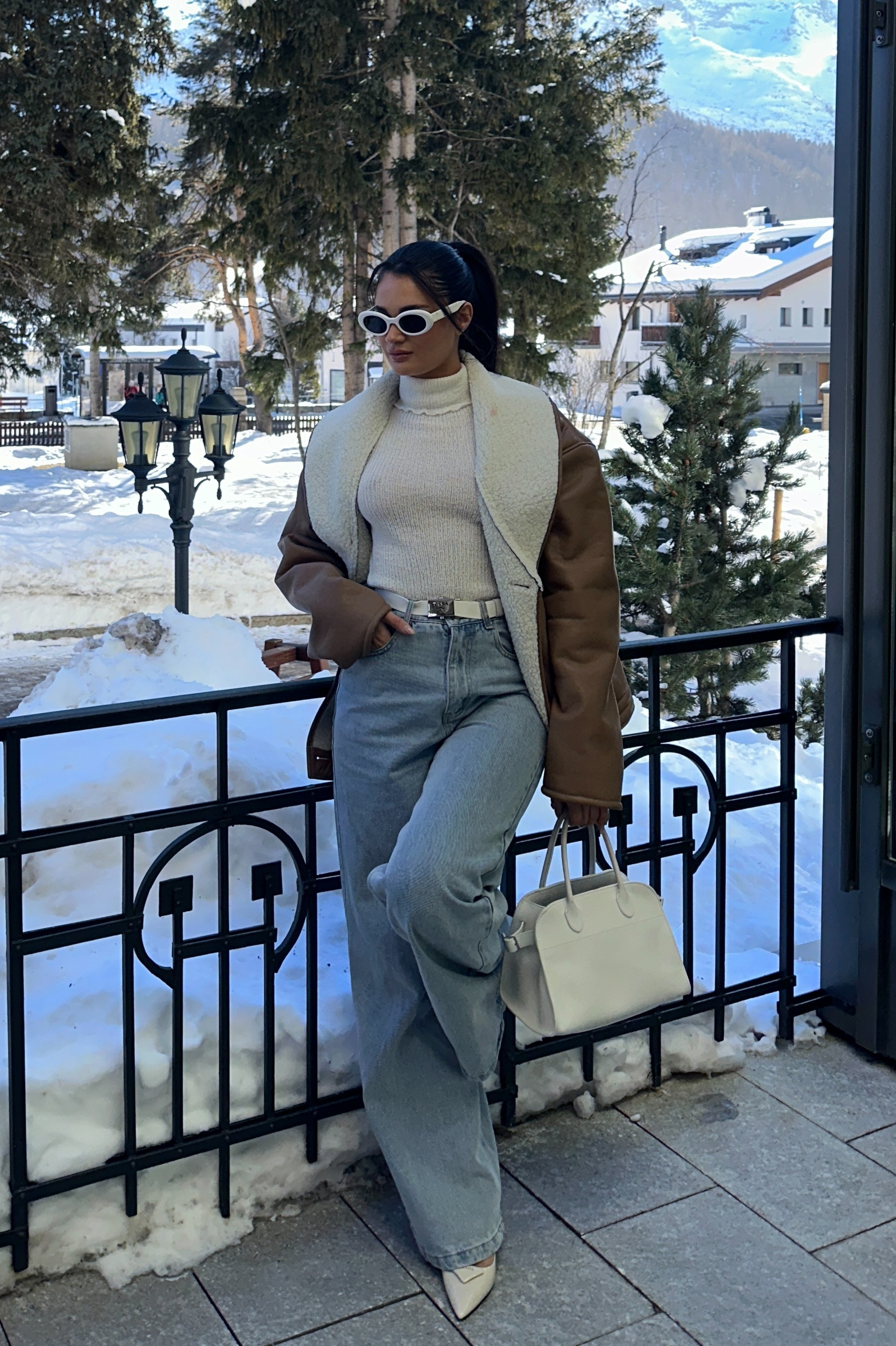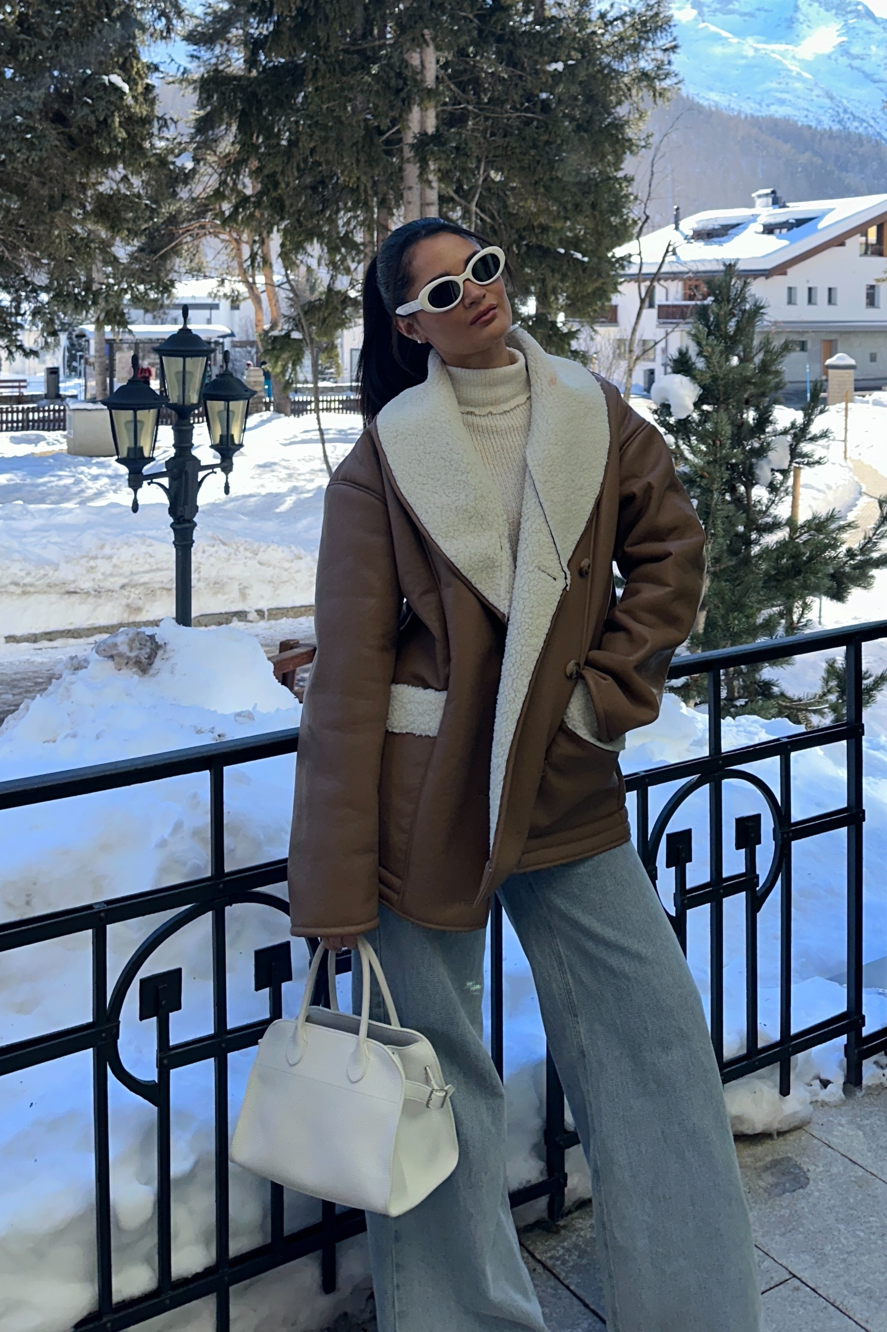 Découvrez la sophistication et la chaleur de notre manteau Teddy en simili cuir Tan Presley. Habilement conçu dans une combinaison de simili cuir et de sherpa, il présente un col châle, des manches longues et des poches latérales pratiques avec des fermetures à bouton à l'avant. Coordonnez le look complet avec notre Pull Col Roulé Jenni. Taille oversize.