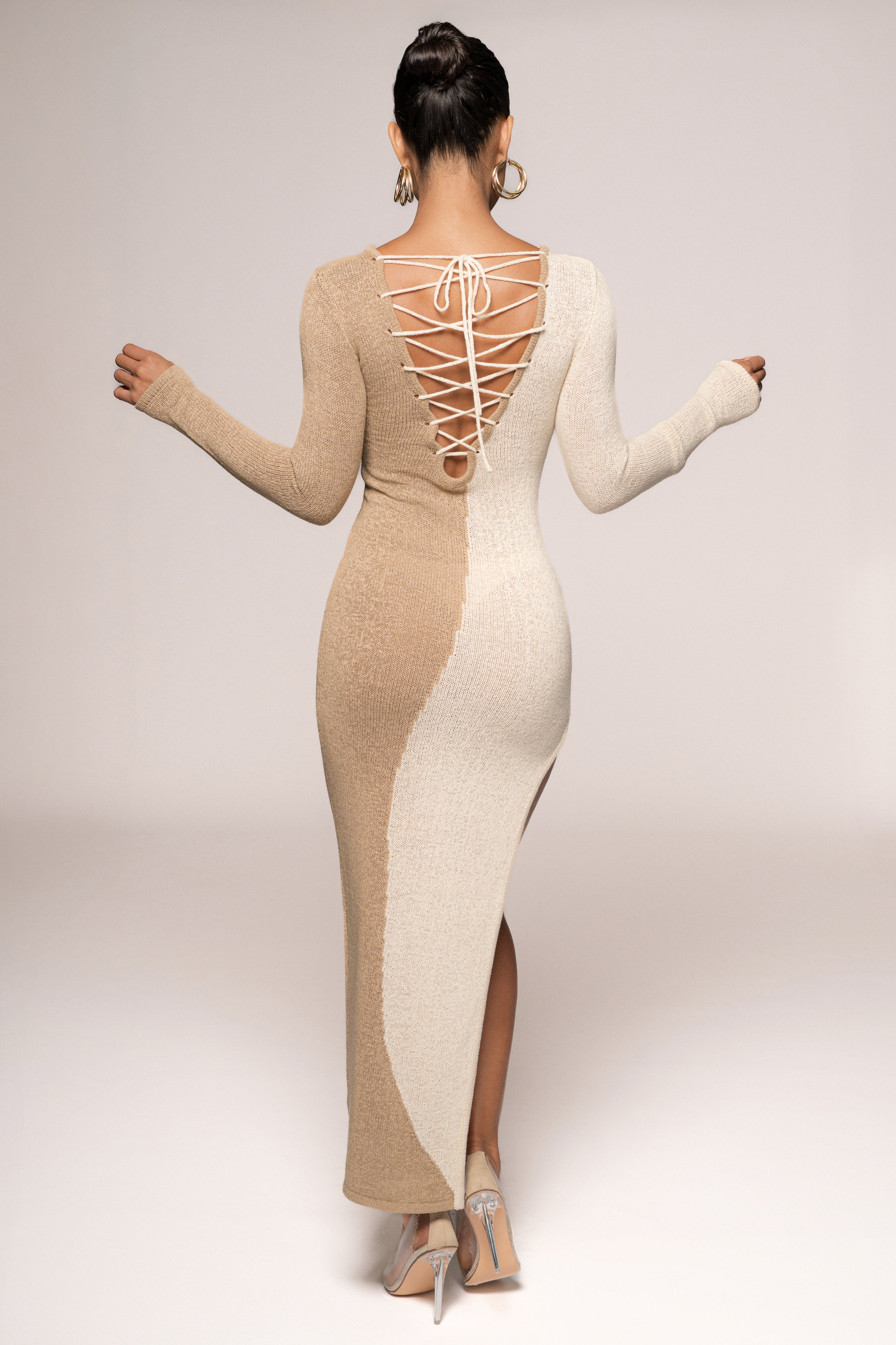 Step out in striking style with the Beige/Ivory No Hard Feelings Dress. This floor-length masterpiece features a bold color-block pattern of vibrant orange and soft beige, separated by a sleek diagonal split for a dramatic effect. Designed with long sleeves for a touch of sophistication, it also boasts a high slit on the right side, adding a hint of allure and graceful movement. The crisscross lace-up back detail elevates its contemporary charm, making it a true standout piece.